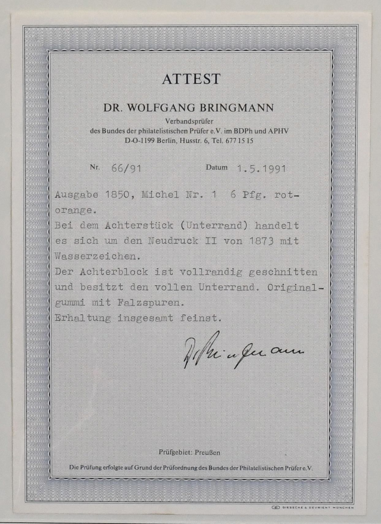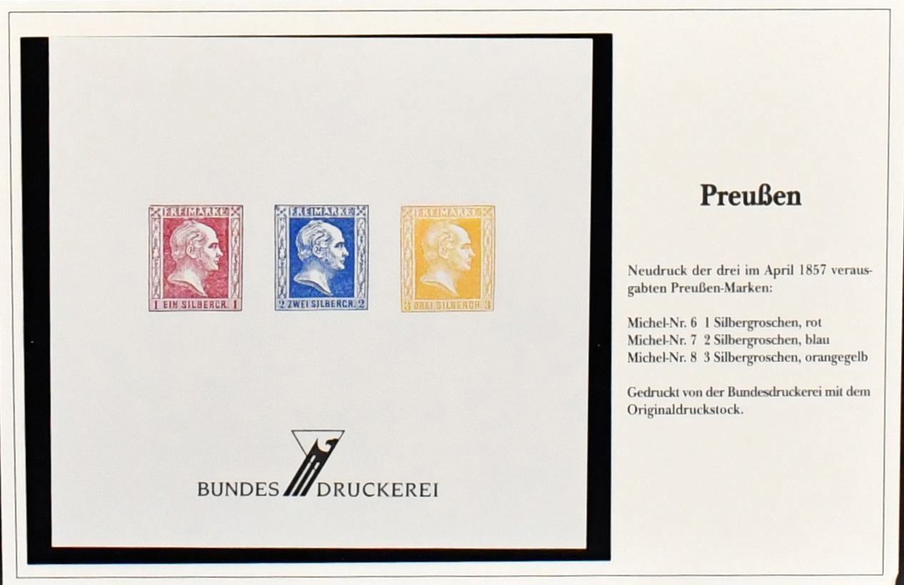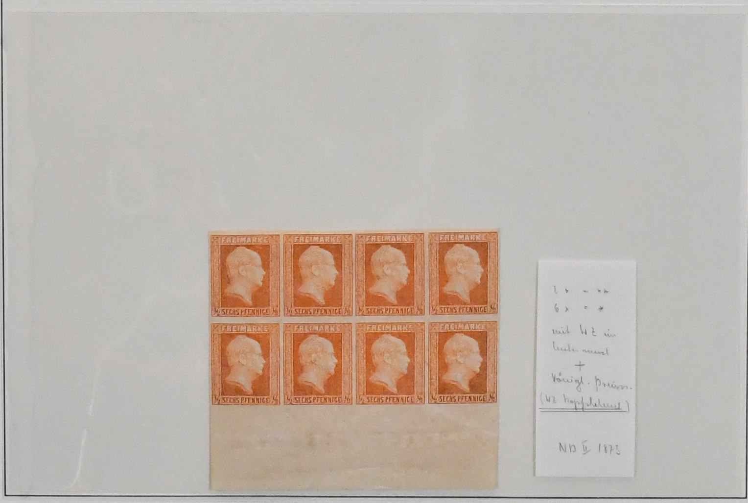 Preußen, nur Neudrucke der Nr. 1-5, spezialisierte ungebrauchte Slg. ab zweimal Nr. 1NDI, einmal postfr., 1NDII im meist postfrischen Unterrand-Achterblock mit kopfstehendem Wasserzeichen im Unterrand (Attest Bringmann), 2NDI im postfr. Unterrandpaar, 3-5NDI, letztere selten, sowie NDII teils in Einheiten, vieles gepr. Krause
