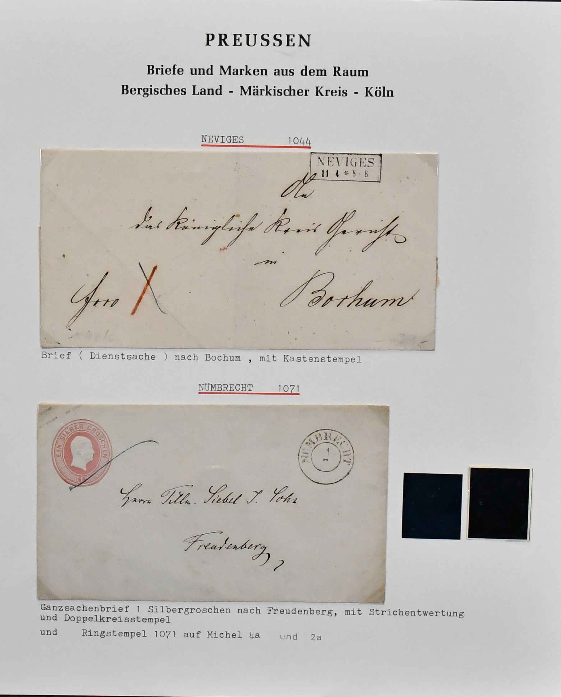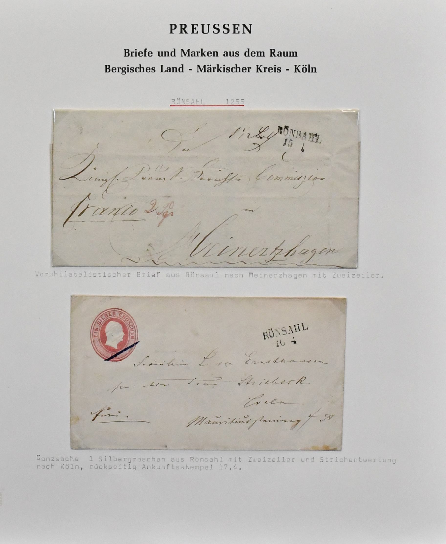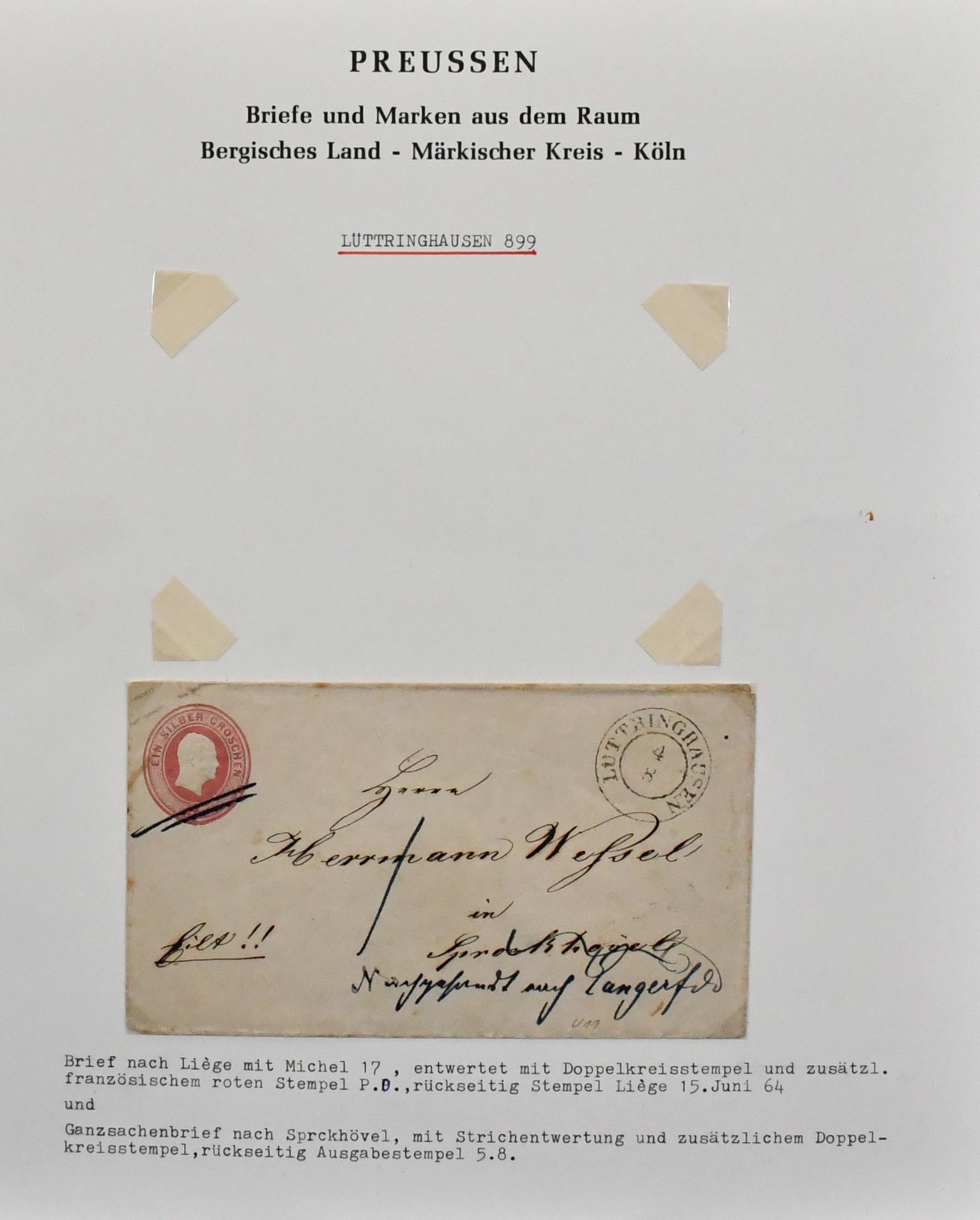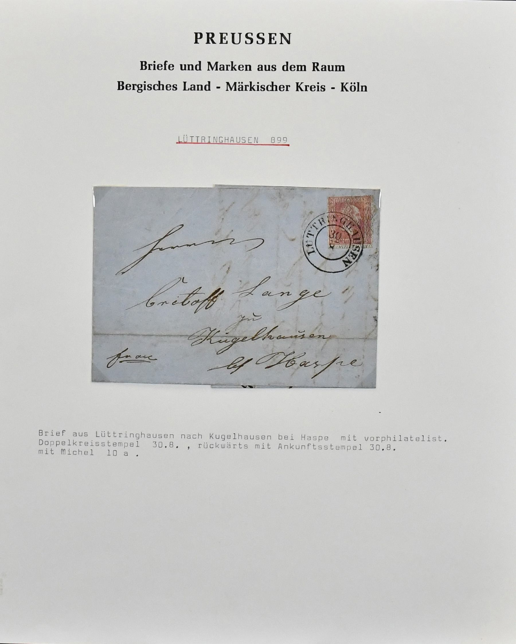 "Bergisches Land/Märkischer Kreis/Umgebung von Köln", Sammlungsteile mit Marken, Briefstücken und alleine 45 Belegen, u.a. NS-Brief von Lüdenscheid, Belege von Lüttringhausen, Nümbrecht, Rönsahl, Gummersbach, Ründeroth (u.a. Brief mit Nr. 15 und zweimal 19a, kl. Mgl.), Wipperfürth, Waldbroel, Wiehl, Wermelskirchen etc.