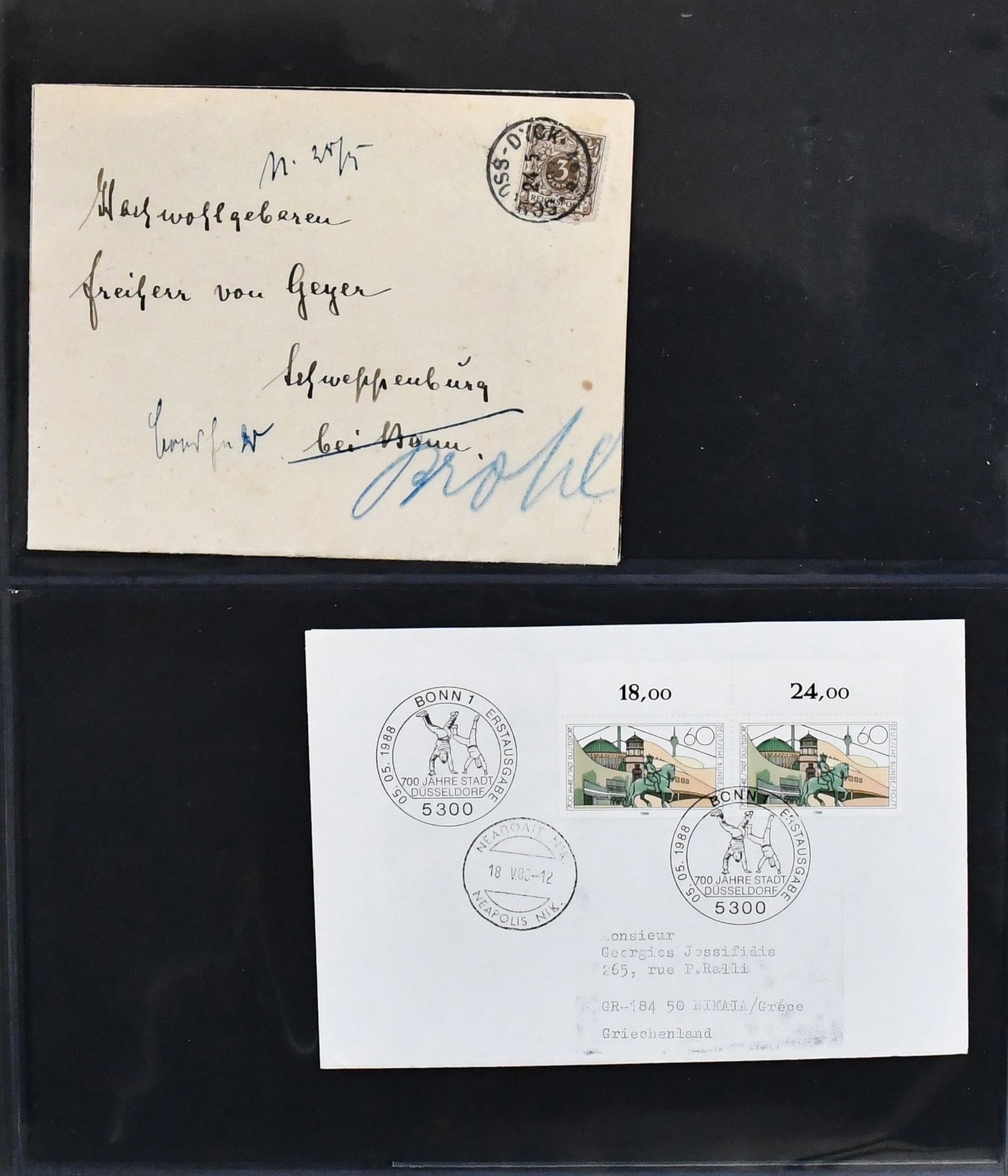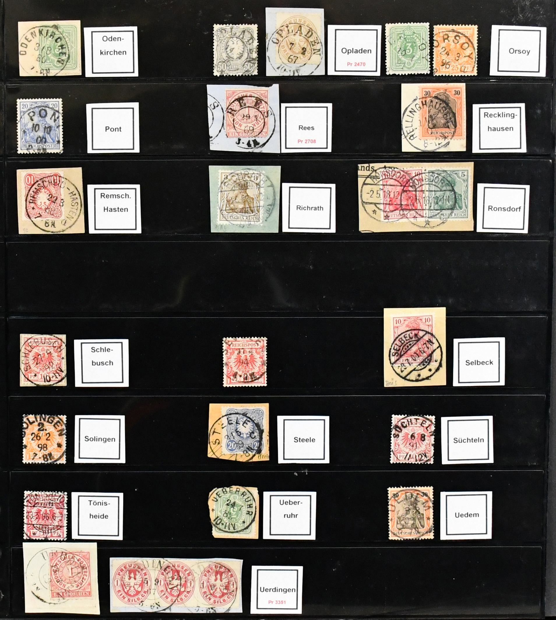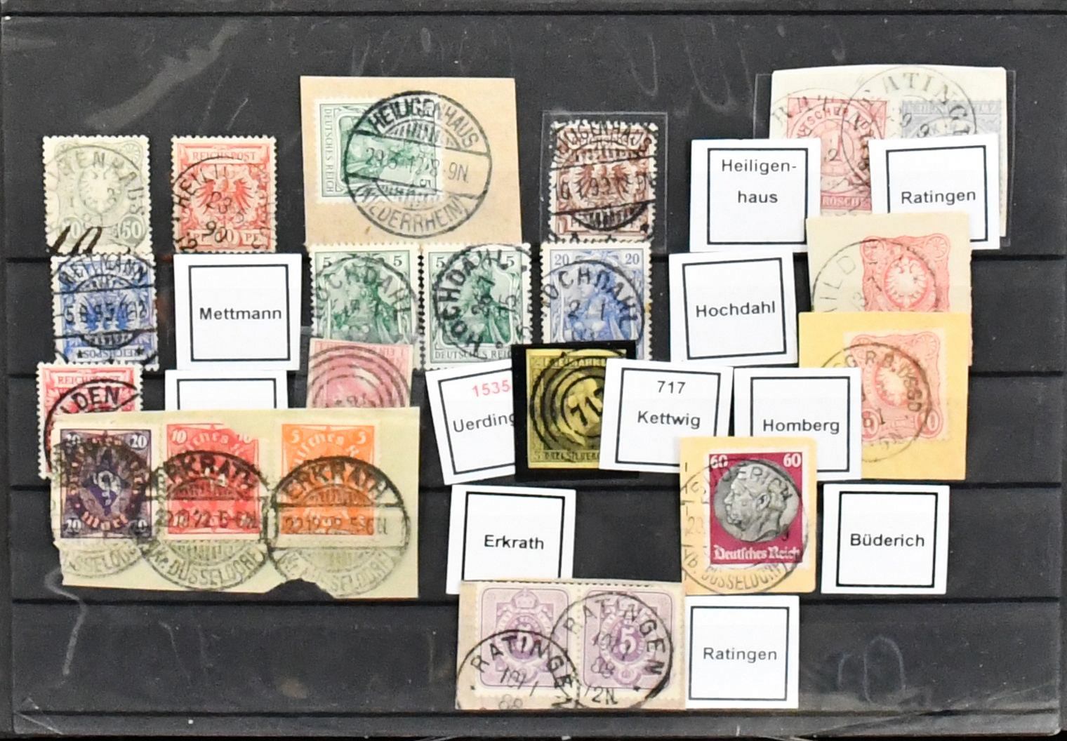 "OPD Düsseldorf", kleiner Sammlungsteil mit Stempeln oft sehr kleiner Orte, meist auf Deutsches Reich, total 110 lose Marken bzw. auf Briefstück, sowie 23 Belege (u.a. Nummernstempelbrief Nr. 8 mit NS "717"/Kettwig)