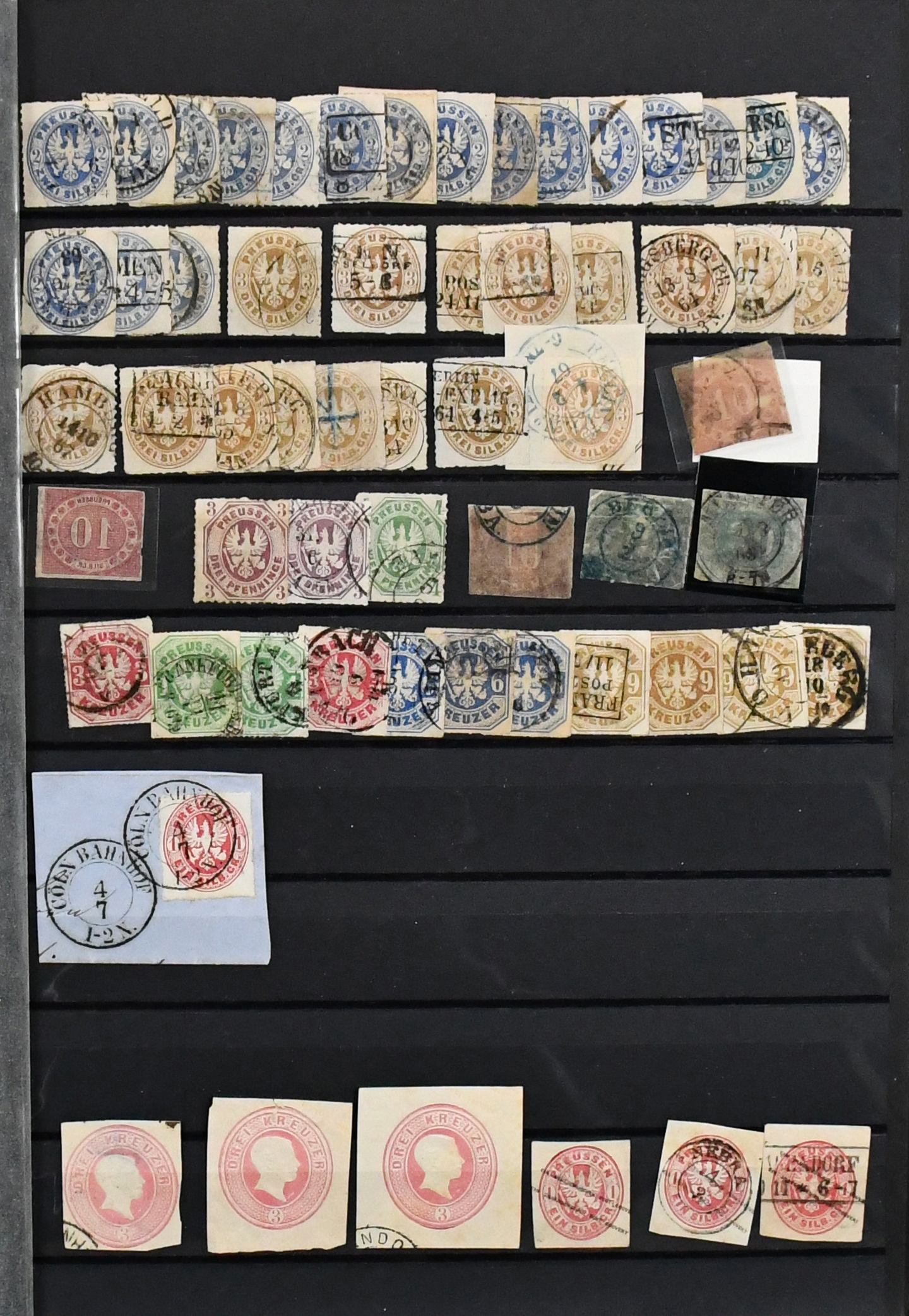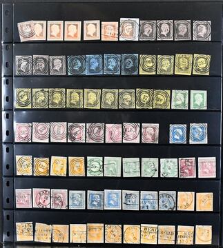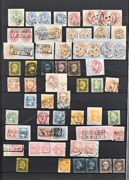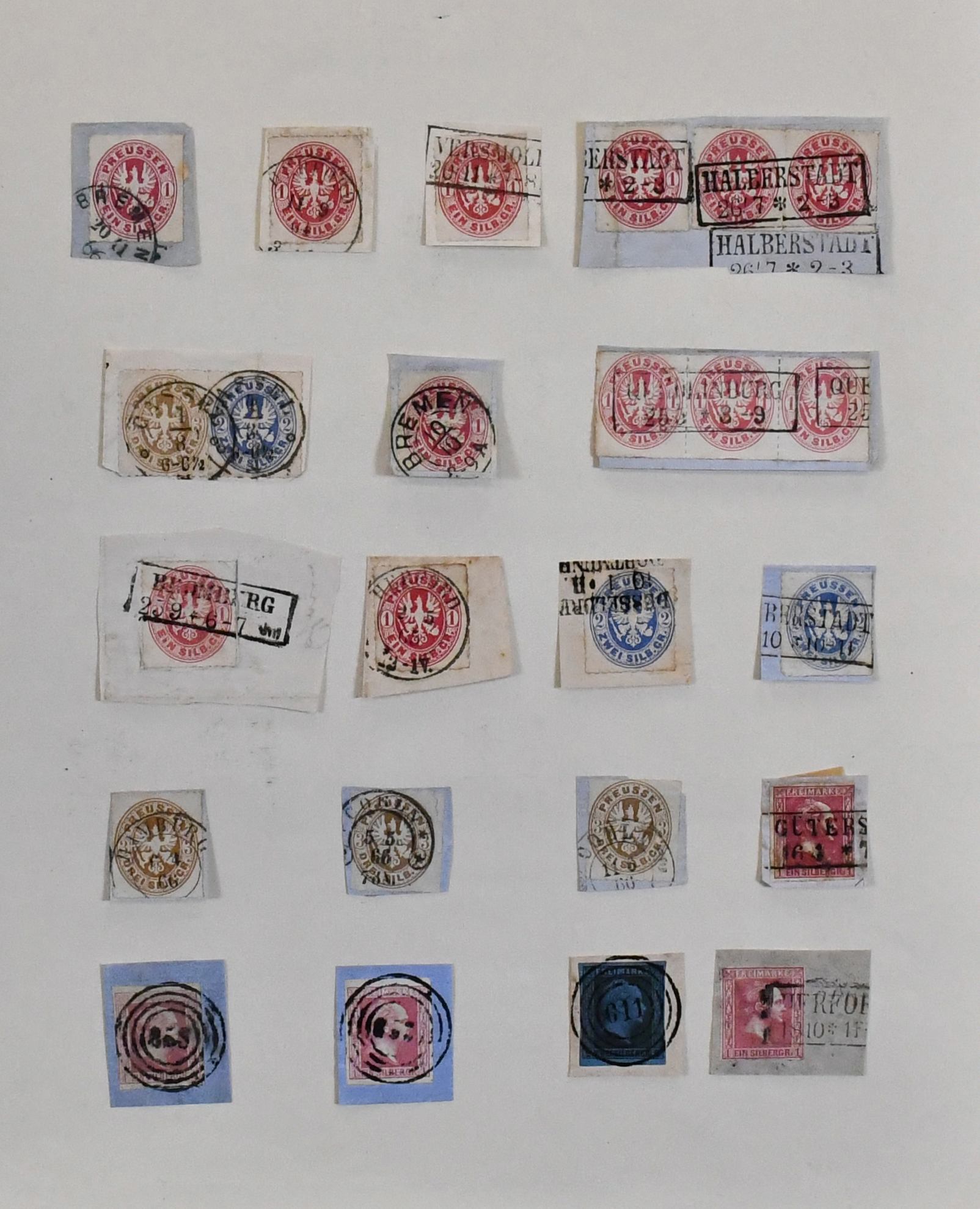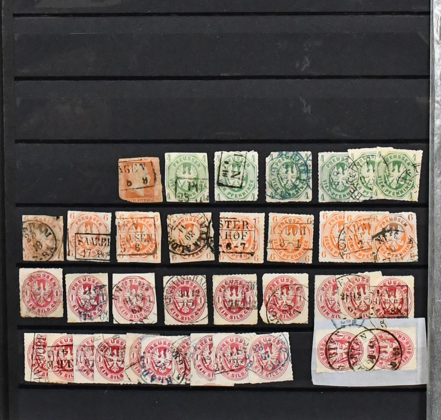 Preußen, Steckkarte mit teilweise sehr seltenen Abstempelungen, allerdings meist in II. Wahl. Dabei seltener NS "863" (Lipporg, Feuser + 400,-) auf Nr. 3, Nr. 11 mit dänischem NS "1", Nr. 15 mit seltenem blauem Grotesk-K1 "Hildesheim", Nr. 24 mit Taxis-NS "377" sowie weitere 3 Kr. mit neuem Grotesk-K1 "Allendorf a.d. Lumda"