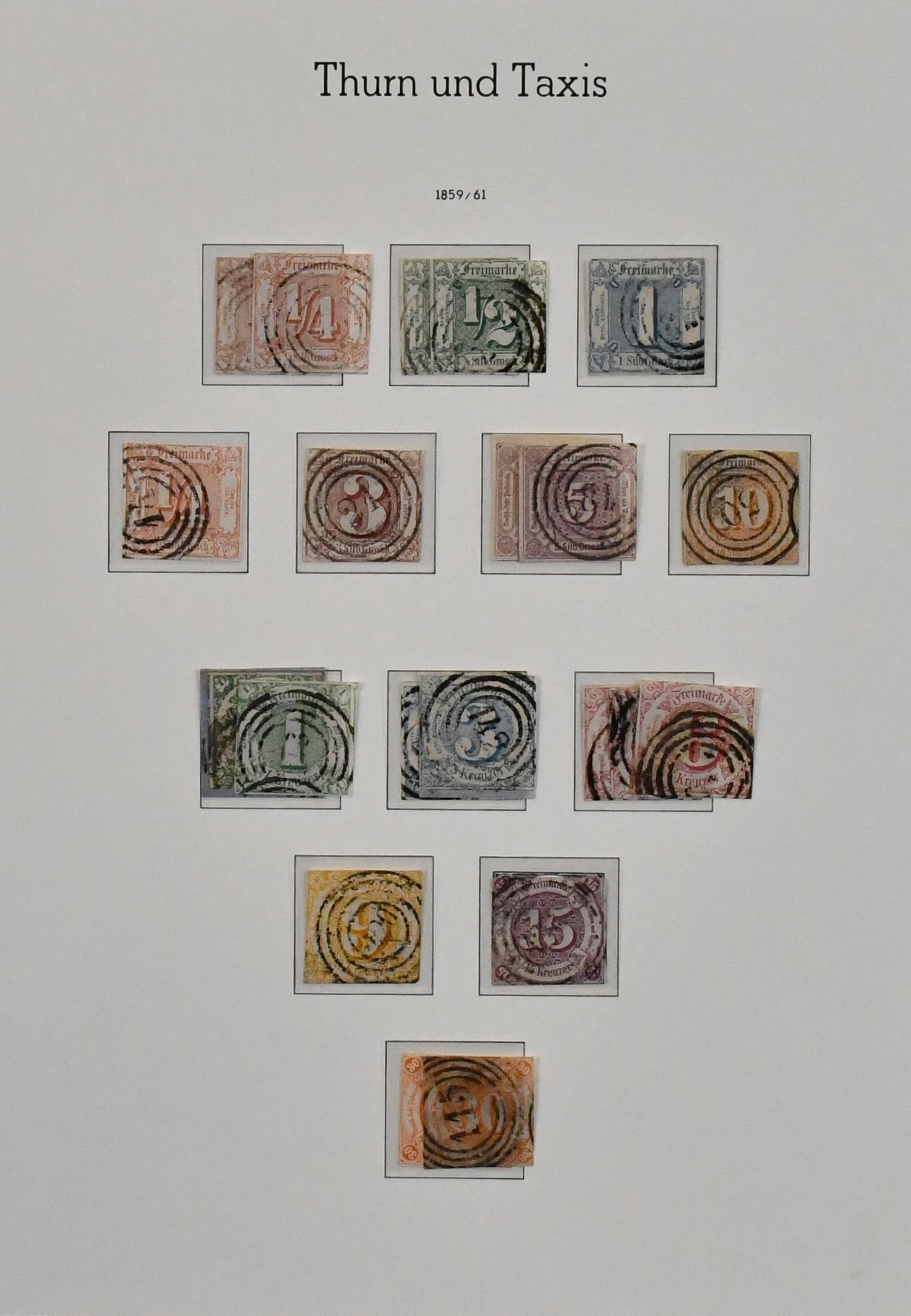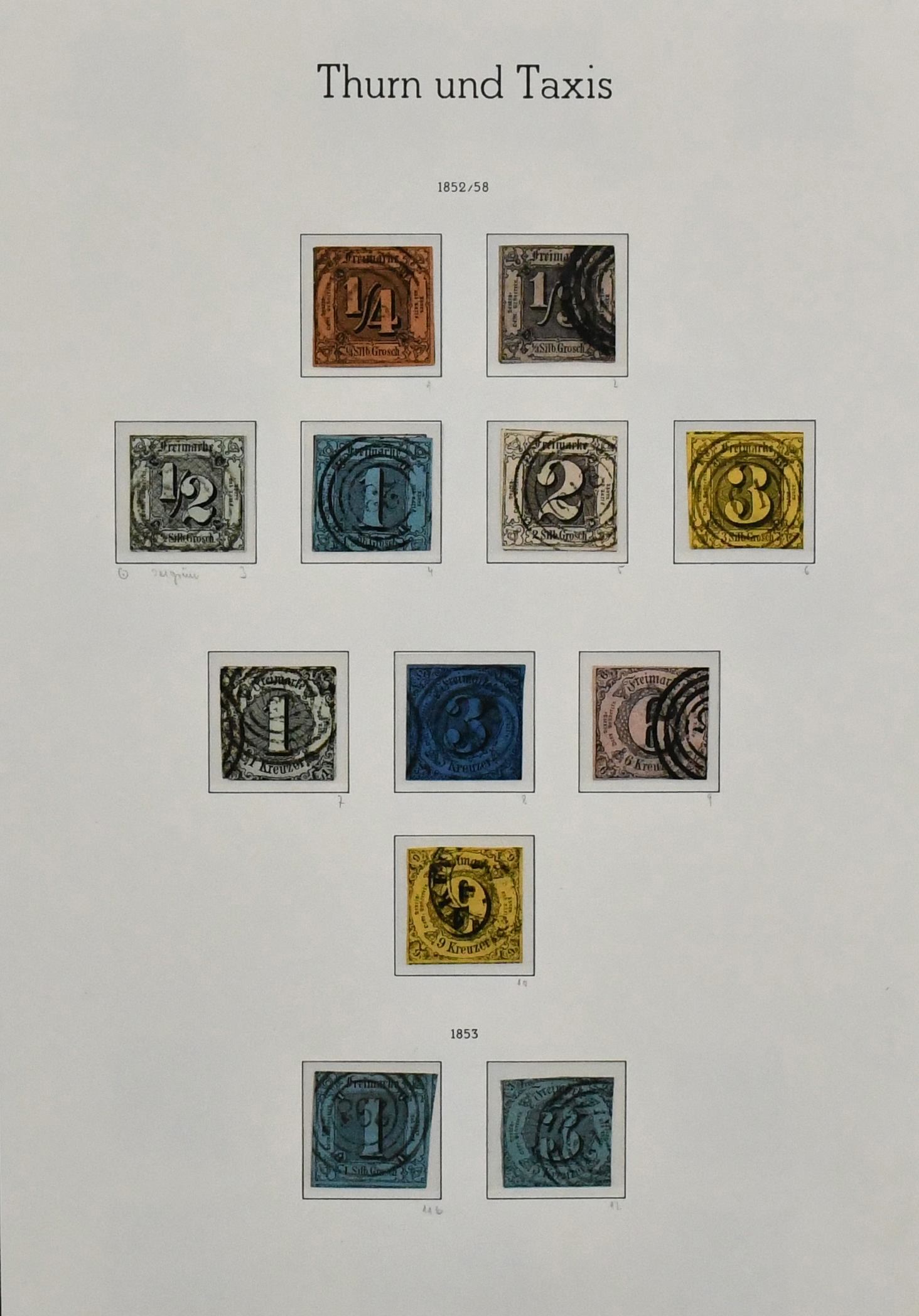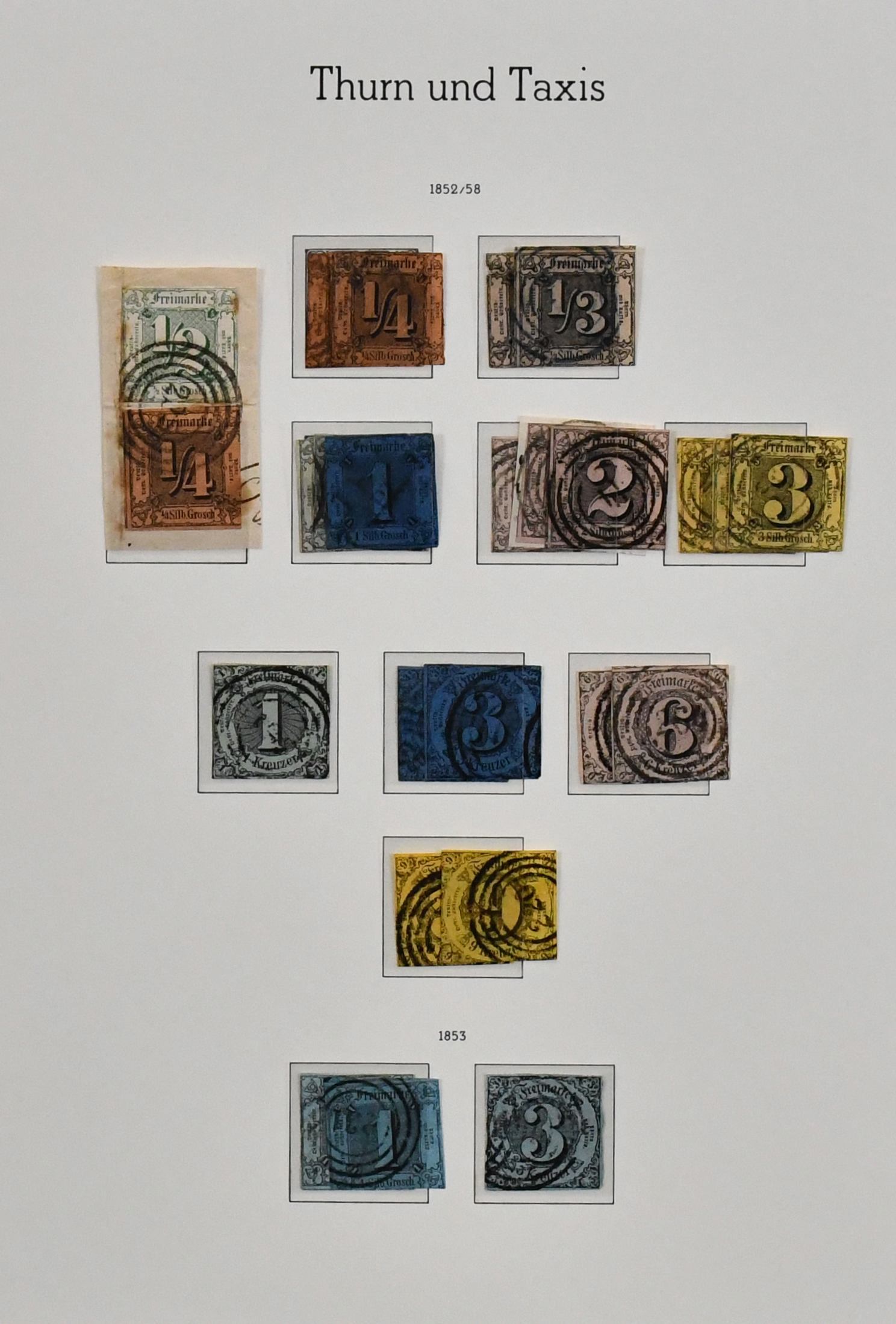 Thurn und Taxis, gest. Slg. ab Nr. 1-12 auf Leuchtturm-Vordrucken, mit guten Werten wie Nr. 18 (Bfst.), 35, 46 etc., einiges von uns auch nicht bewertet