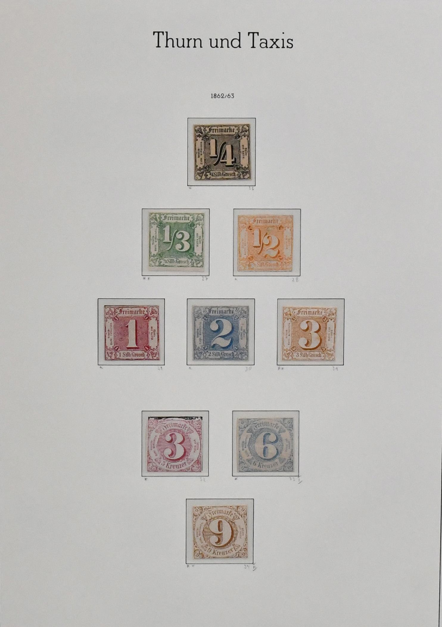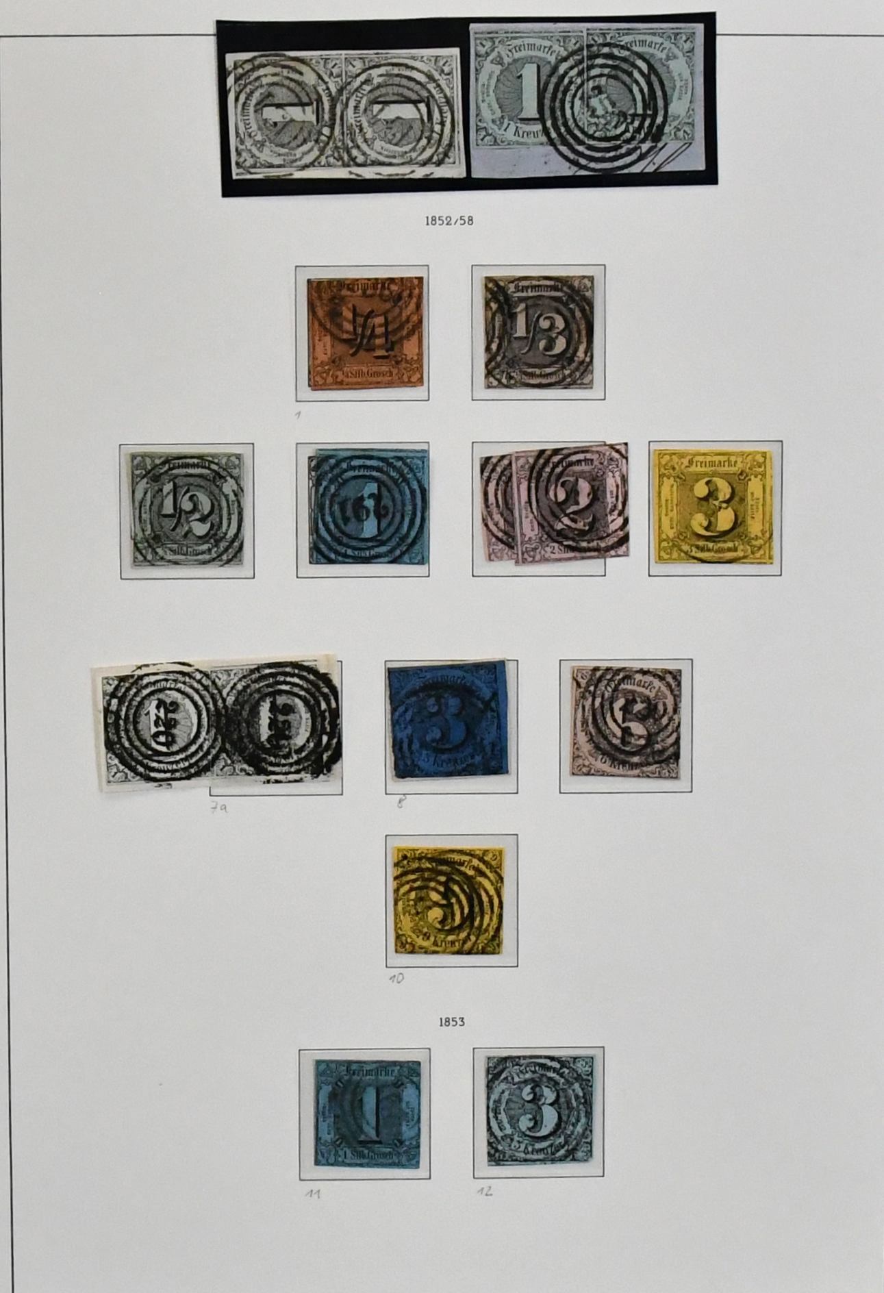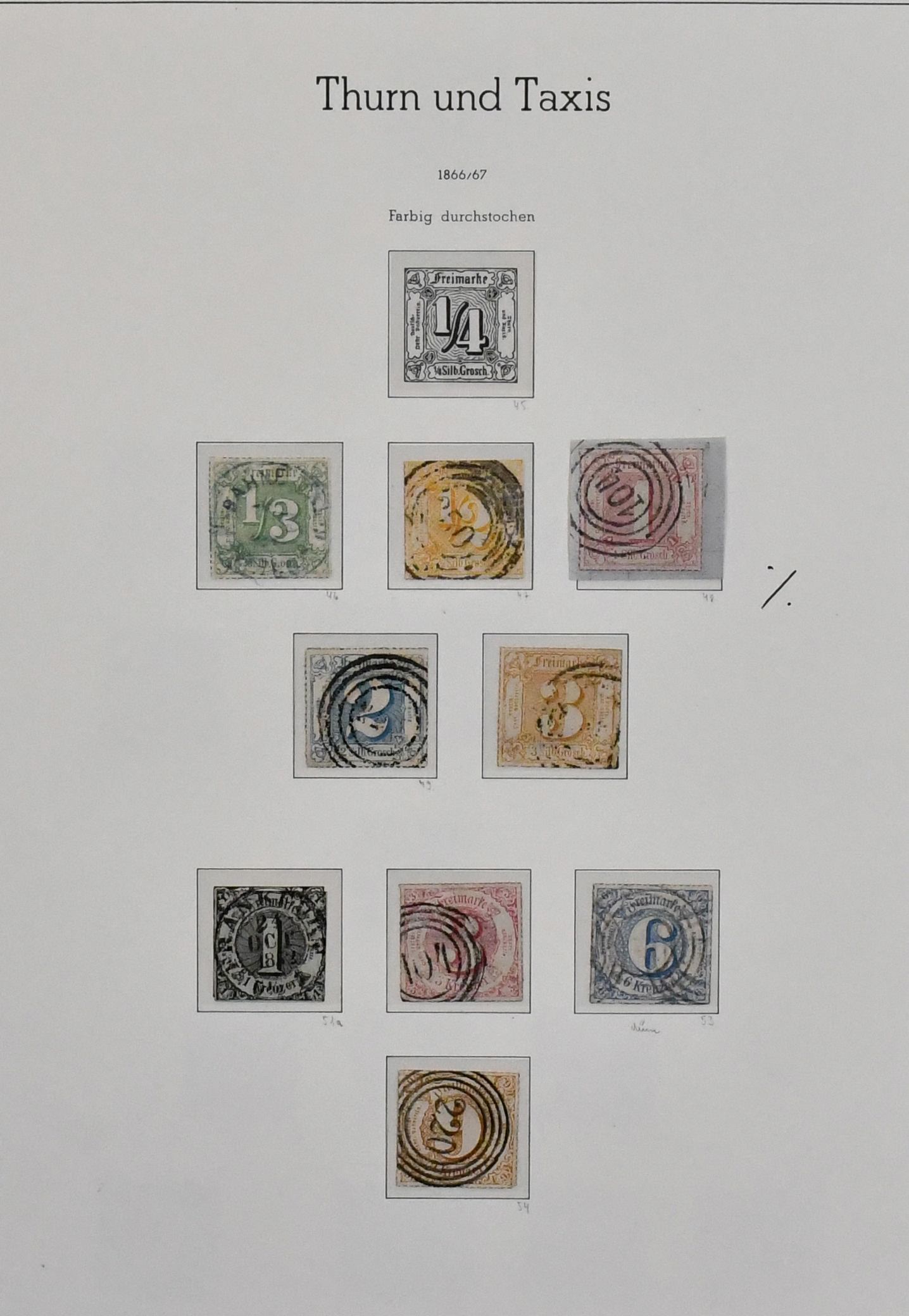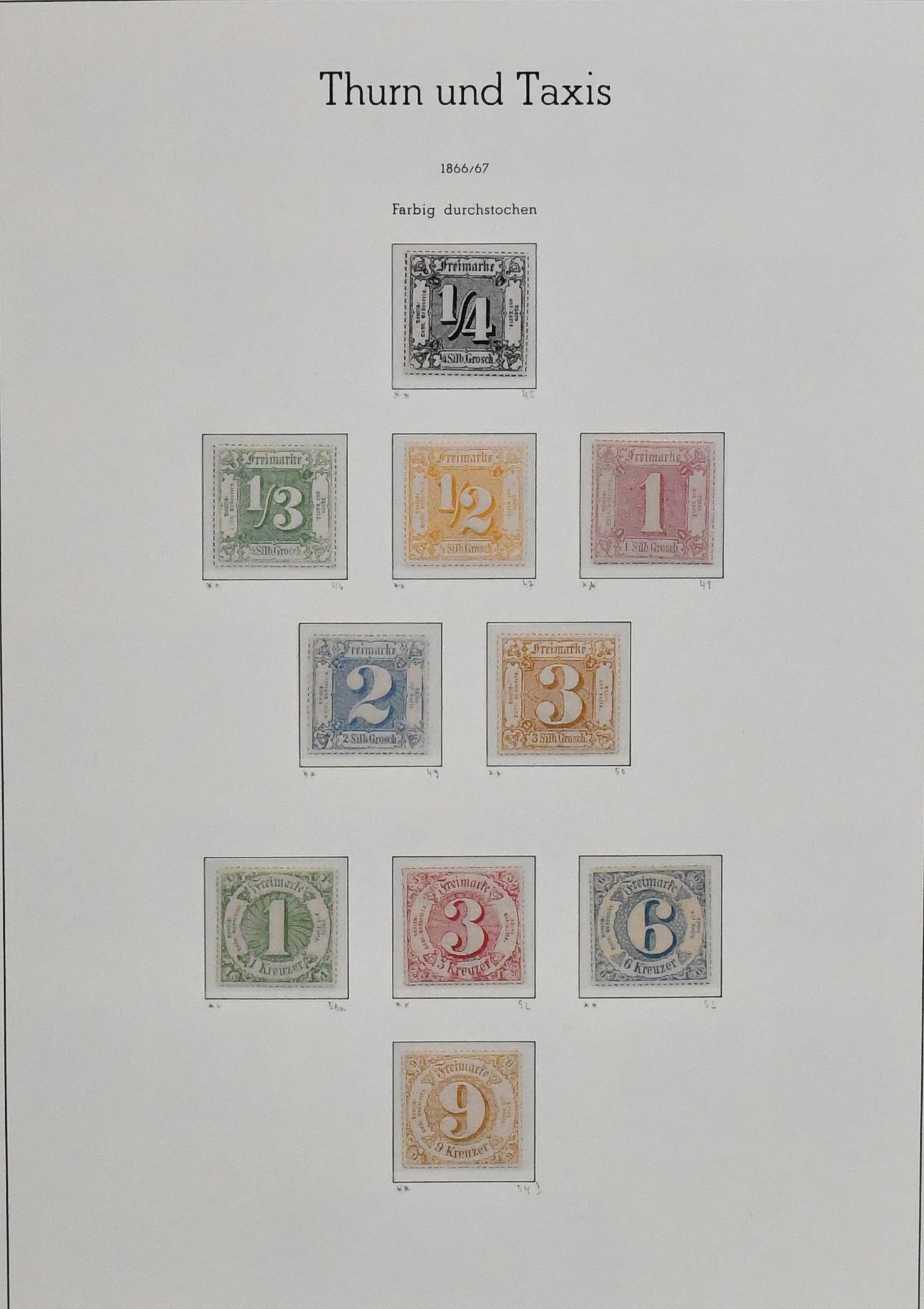 Thurn und Taxis, gest. Slg. ab Nr. 1-12 auf Leuchtturm-Vordrucken, mit guten Werten wie Nr. 18 (Bfst.), 35, 46 etc., einiges von uns auch nicht bewertet