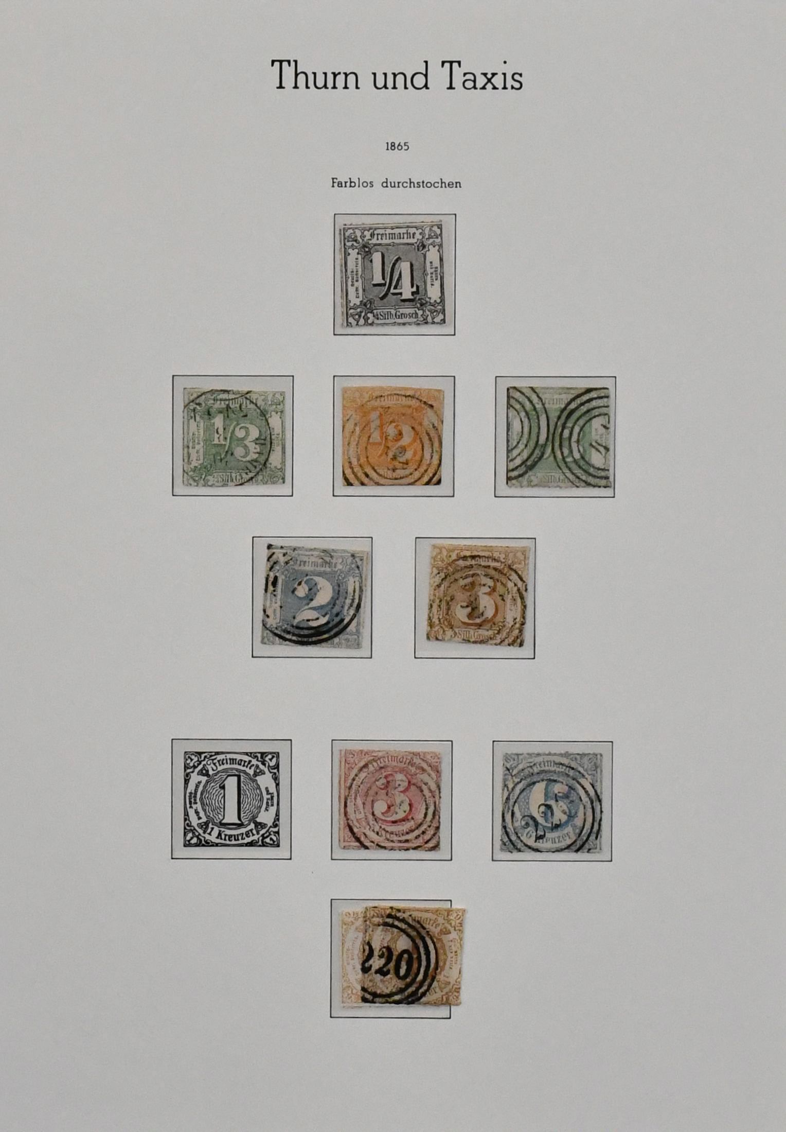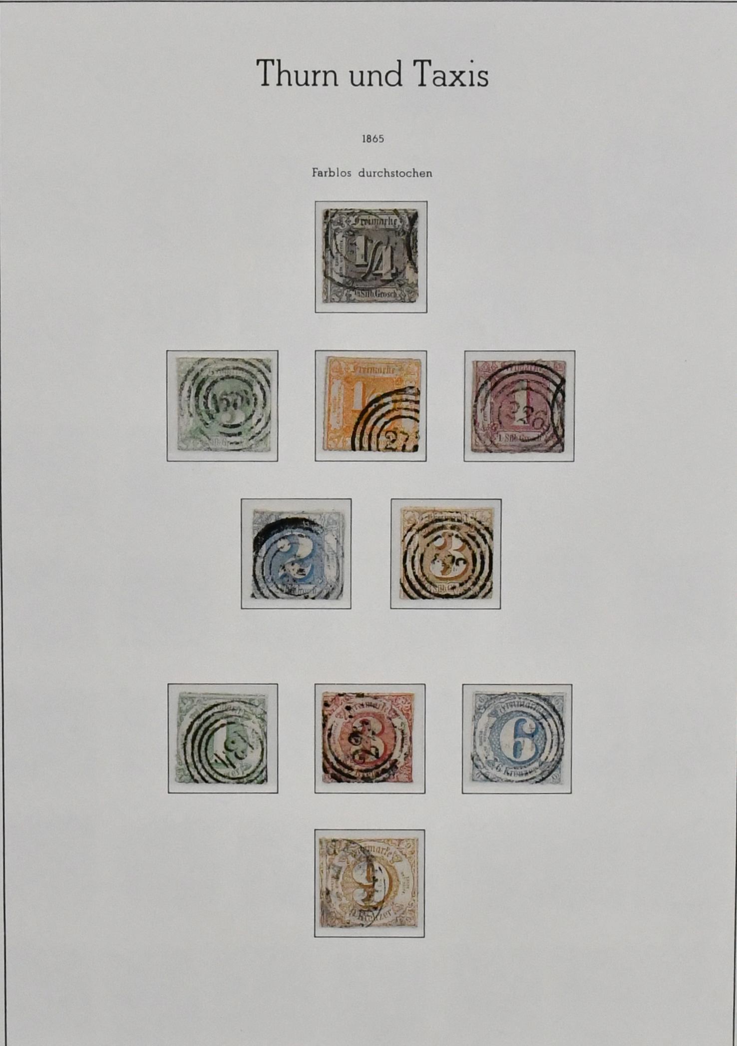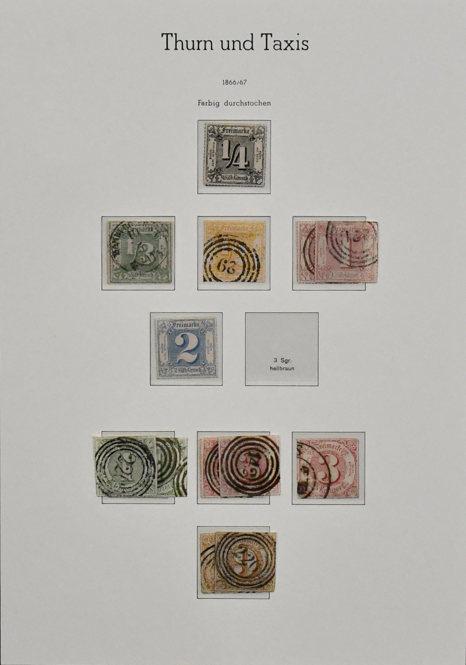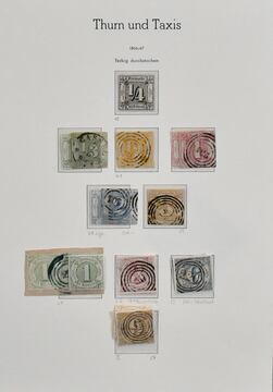 Thurn und Taxis, relativ komplette Slg. auf Vordrucken, mit Nr. 18/19, 36, 46 u. 49 je gestempelt. Mi. 5200,-