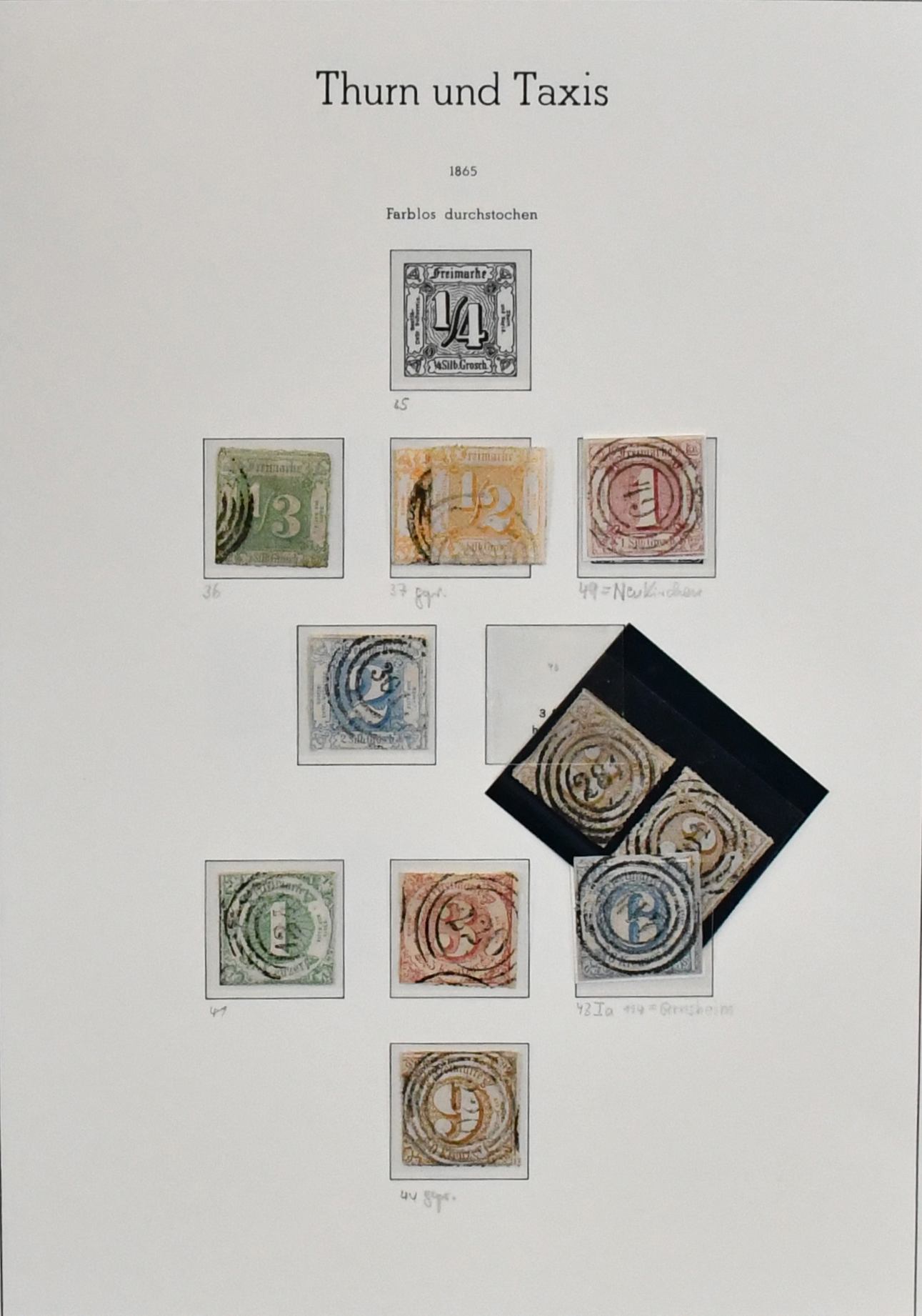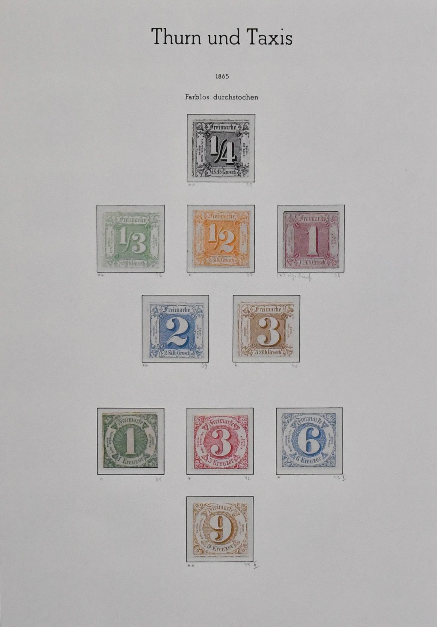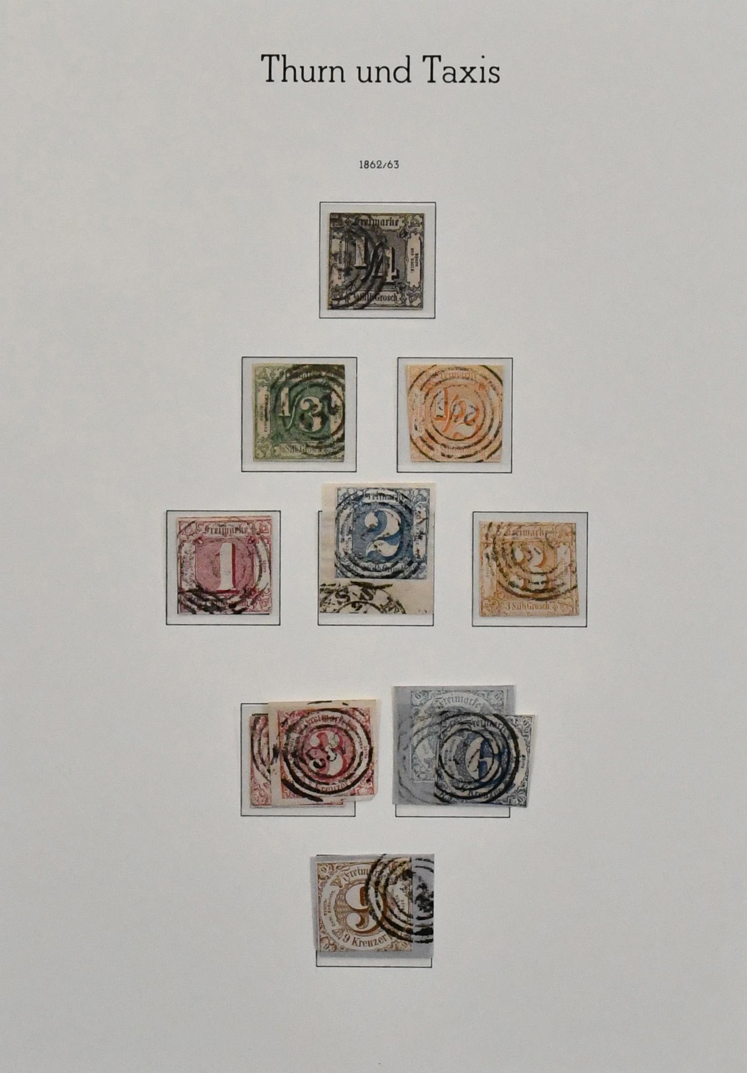 Thurn und Taxis, relativ komplette Slg. auf Vordrucken, mit Nr. 18/19, 36, 46 u. 49 je gestempelt. Mi. 5200,-