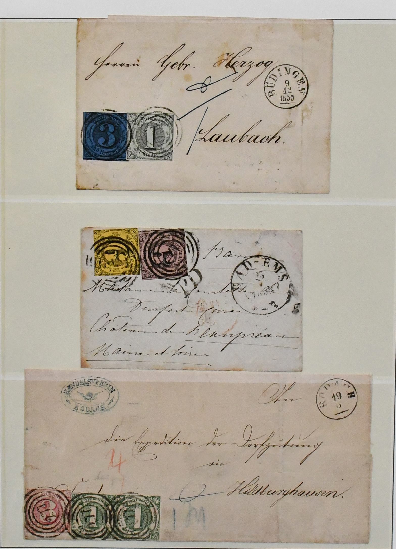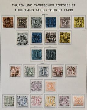 Thurn und Taxis, meist gestempelte Slg. in untersch. Erhaltung auf Albumseiten, dabei u.a. Nr. 1(2), 2(2), 3(2), 4, 5(3), 6(3), 8(2), 11-12, 13, 14 per drei (davon eine auf Briefstück mit Nr. 1), 17-19 je gest., 23, 24-25 je gest., 26-31, 36(2) gest., 46 auf Briefstück usw. Sehr hoher KW