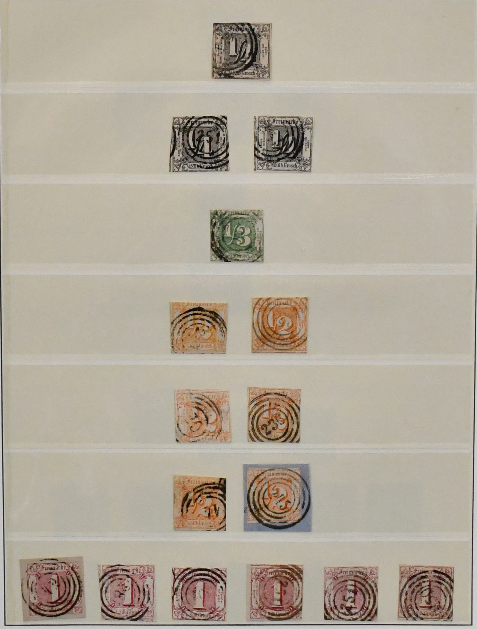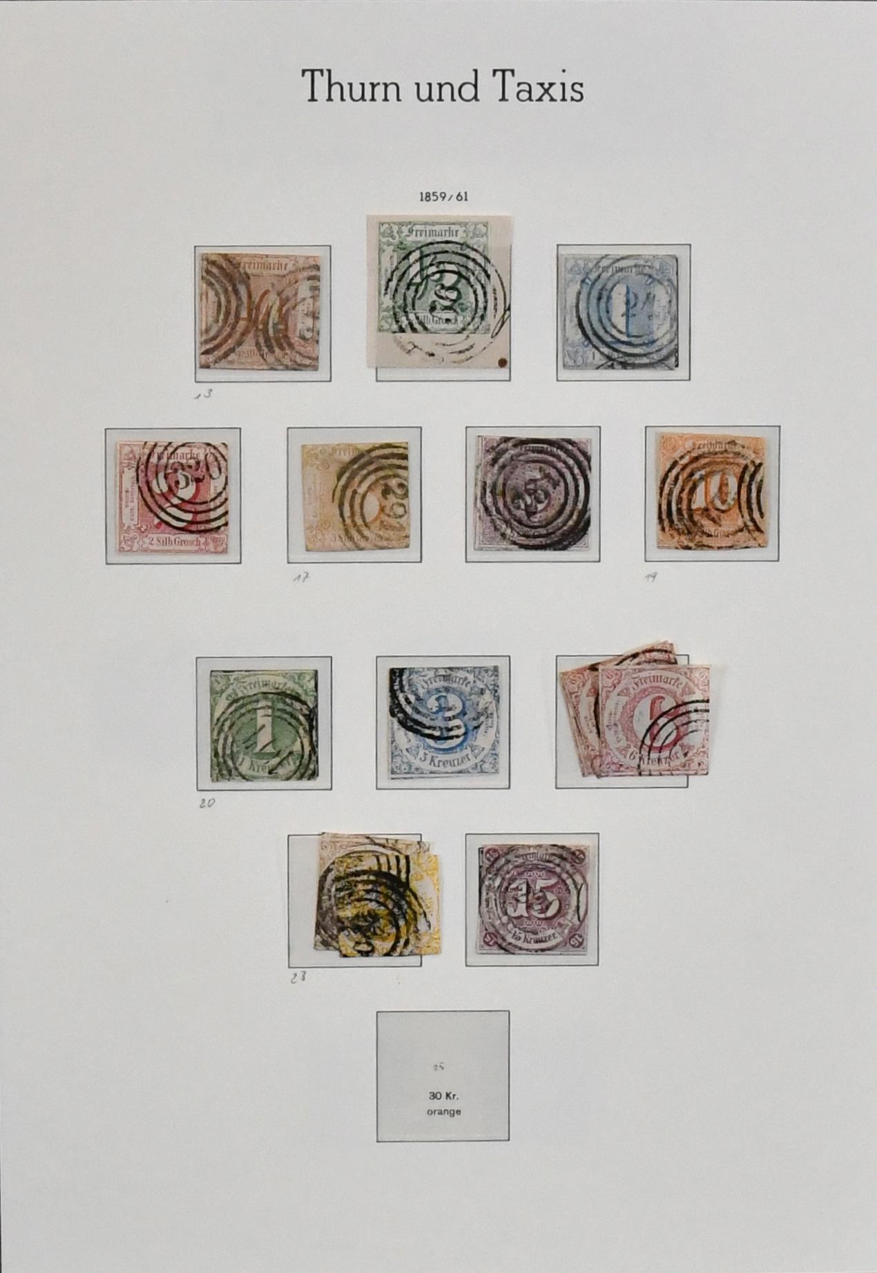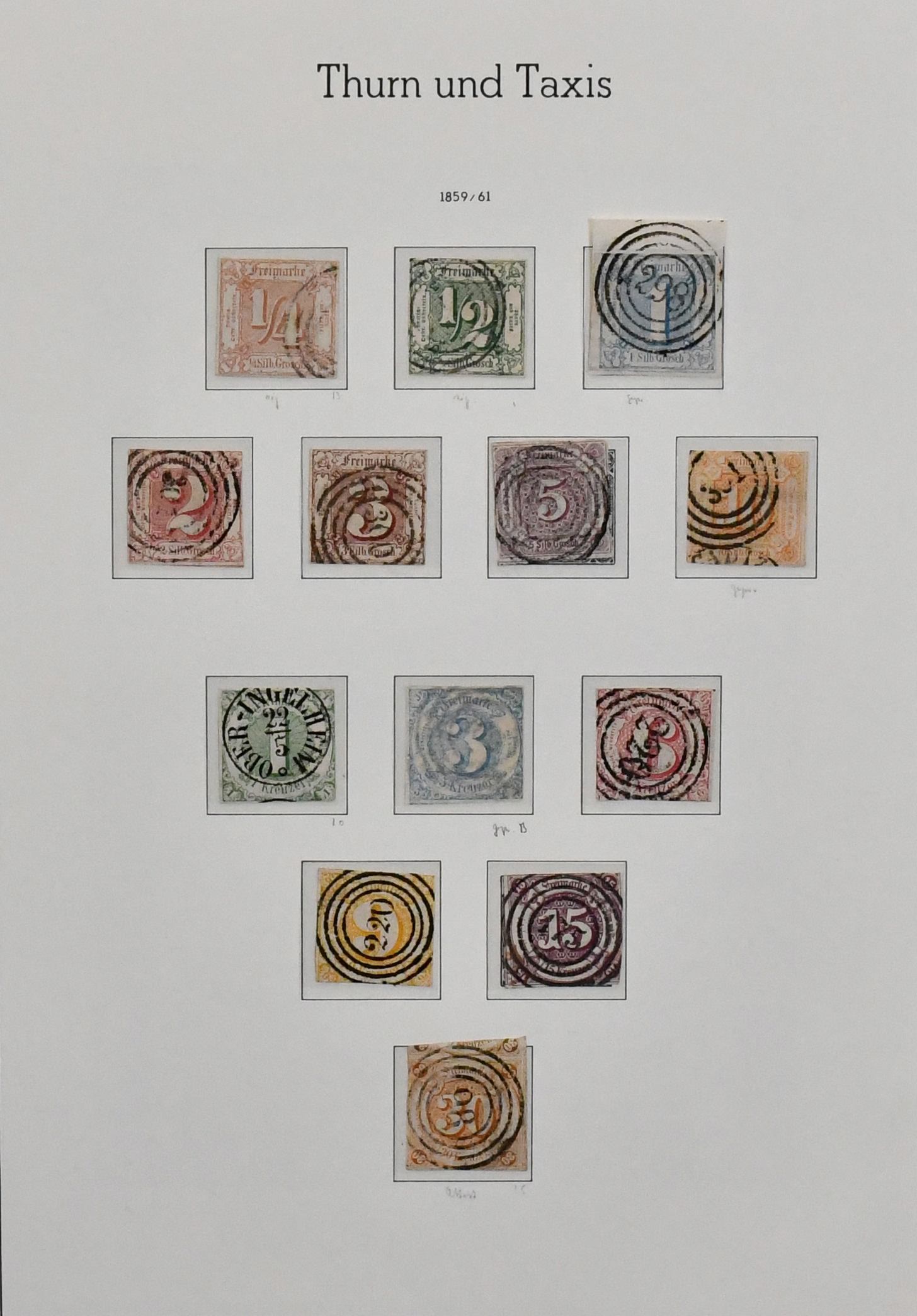 Thurn u. Taxis, enorm umfangreiche, ausschließlich gestempelte Sammlung, bis auf die Nr. 45 weit überkomplett mit vielen Spitzen, diese fast immer geprüft, vieles einzeln auf Auktionen erworben, mit sonst allen Spitzen wie 10 Sgr., 30 Kr., Nr. 35/36, 46, 49 etc. Mi. rund 16.000,-