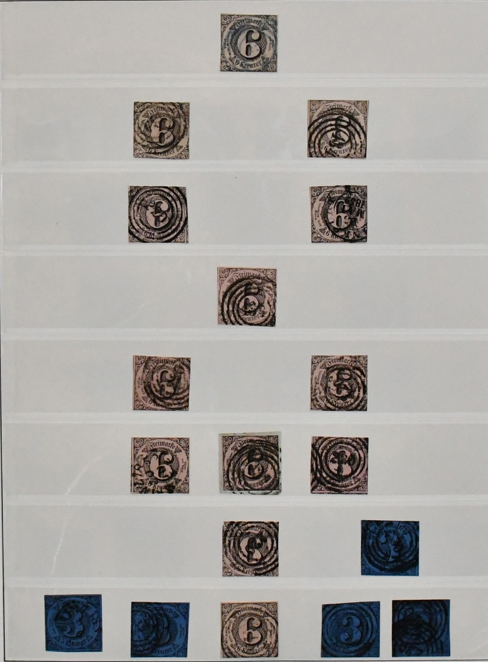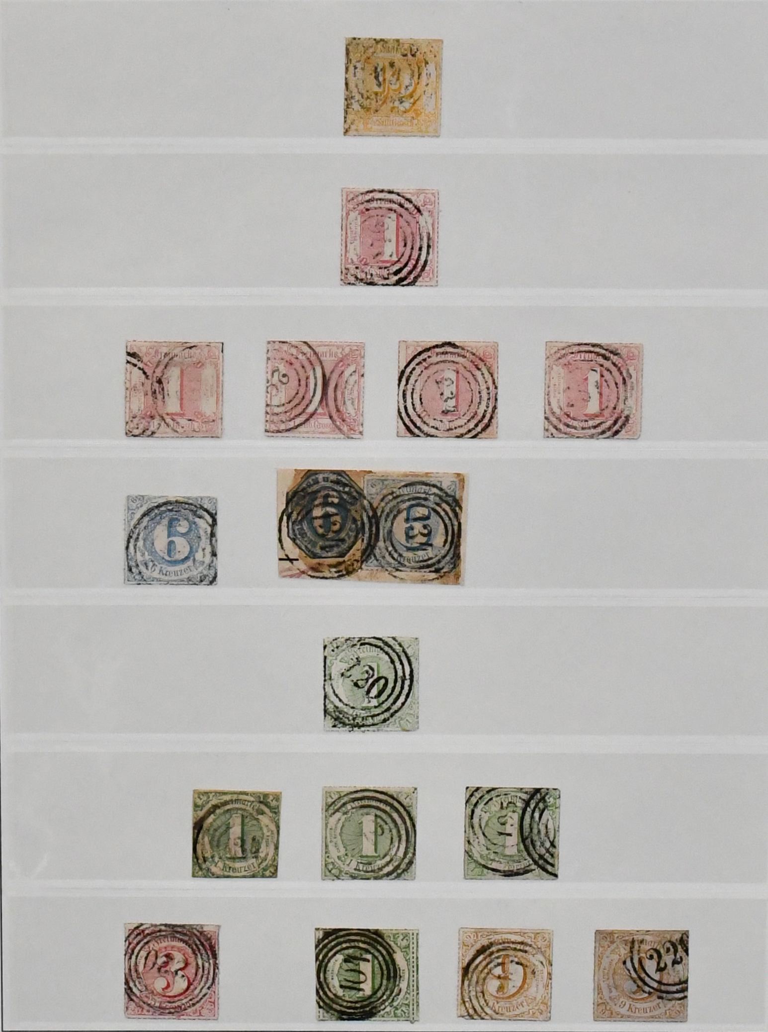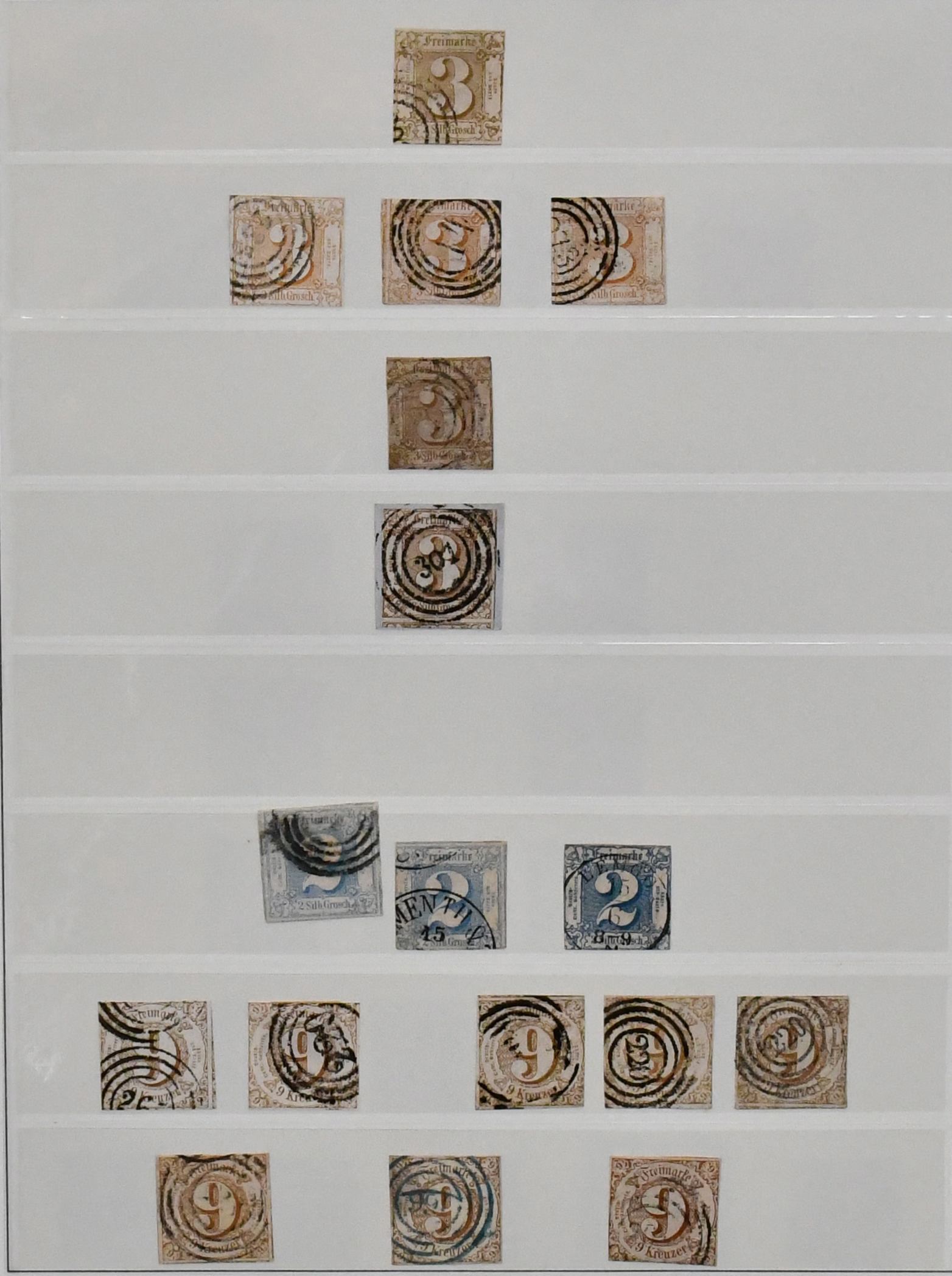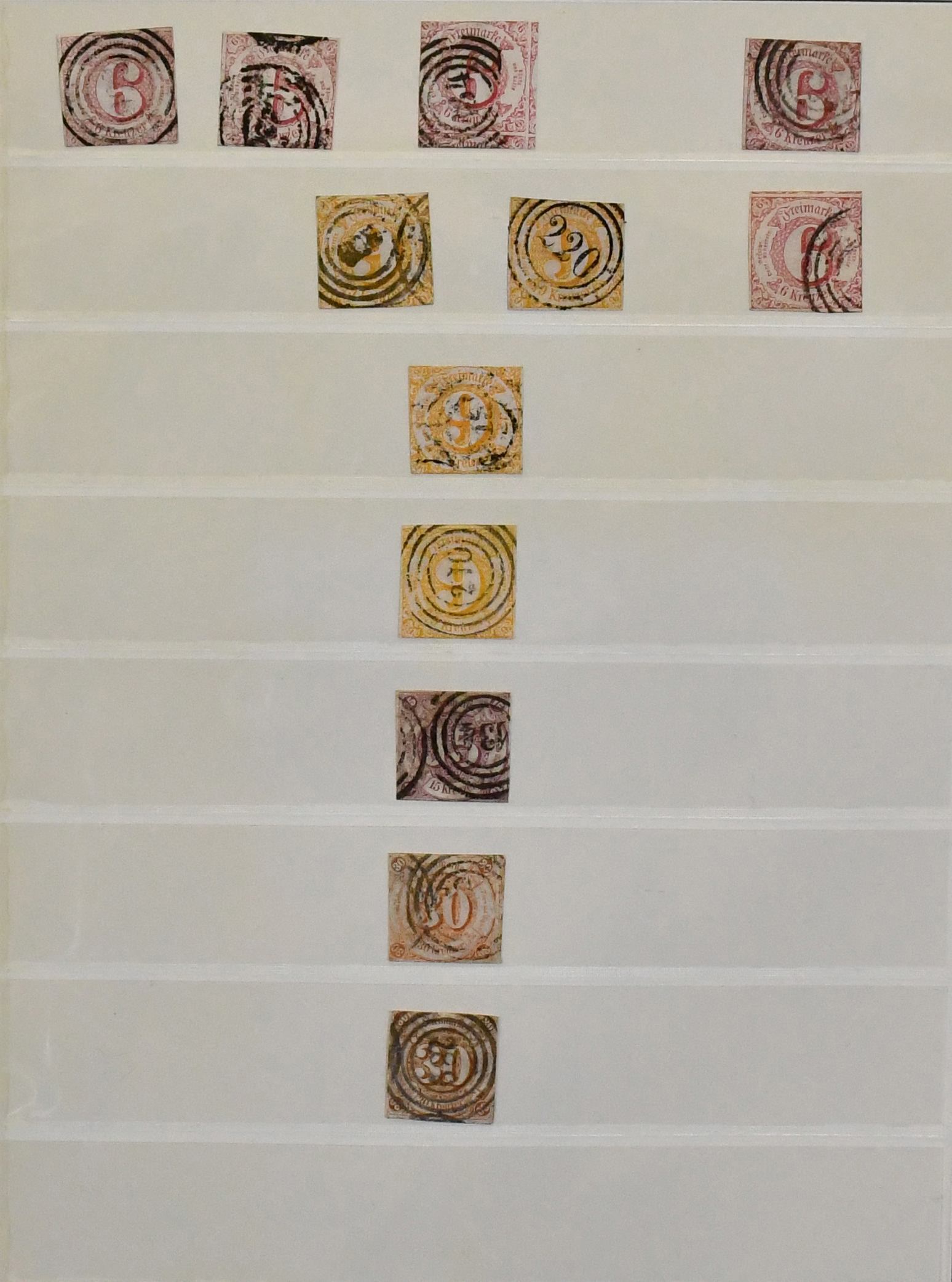 Thurn und Taxis, großer Bestand von 430 Werten in sehr untersch. Erhaltung, dabei 110 gestempelte Werte ex Nr. 1 (per acht inkl. Paar) bis 12, 120 Werte ex Nr. 13-25, dabei neun gest. 5 Sgr., drei gest. 10 Sgr., 15 Kr. neunmal gest., 30 Kr. zweimal gest., auch im Folgenden gute wie Nr. 36 und 45/46 gest., so dass sich ein enormer Katalogwert ergibt