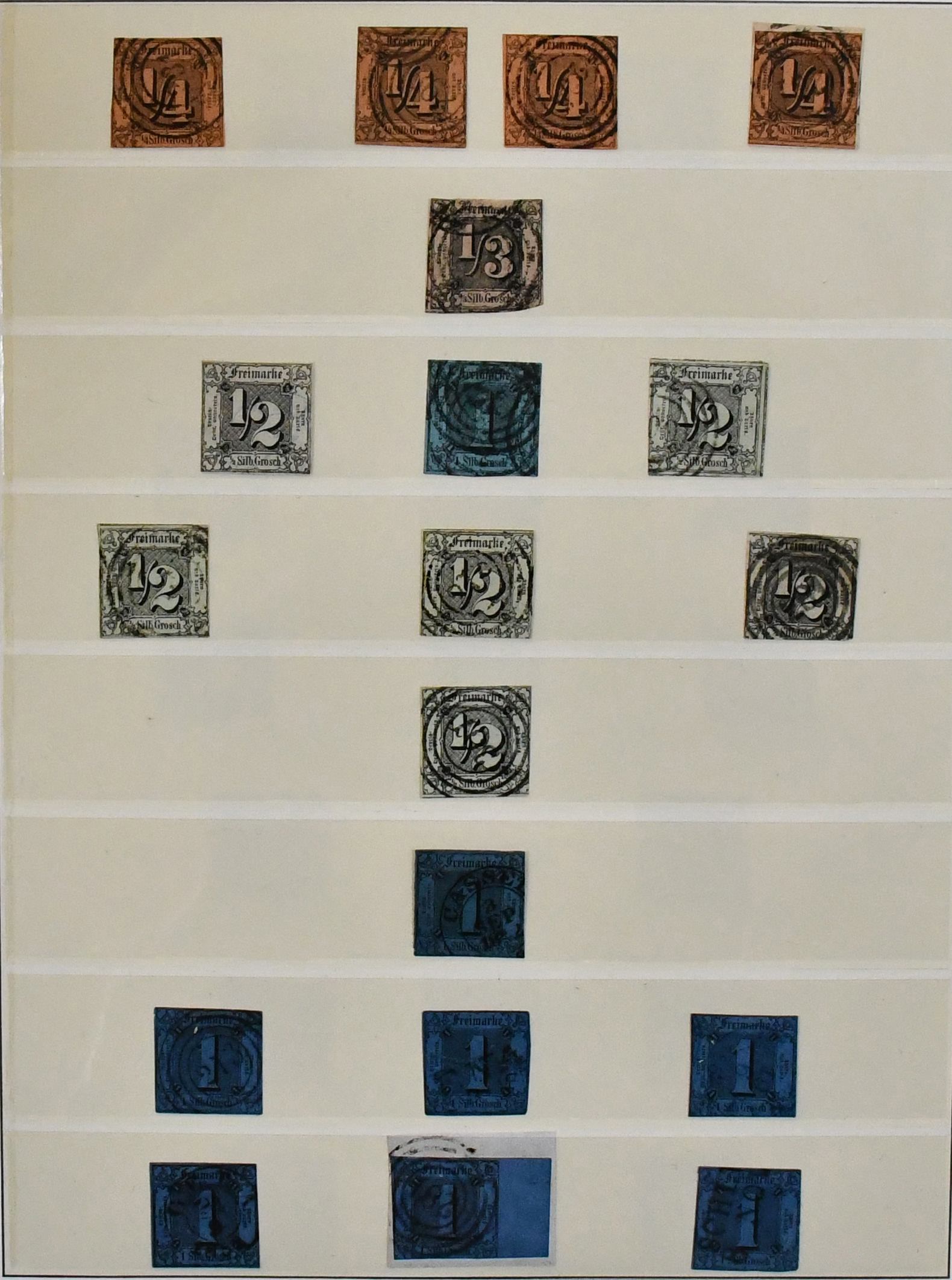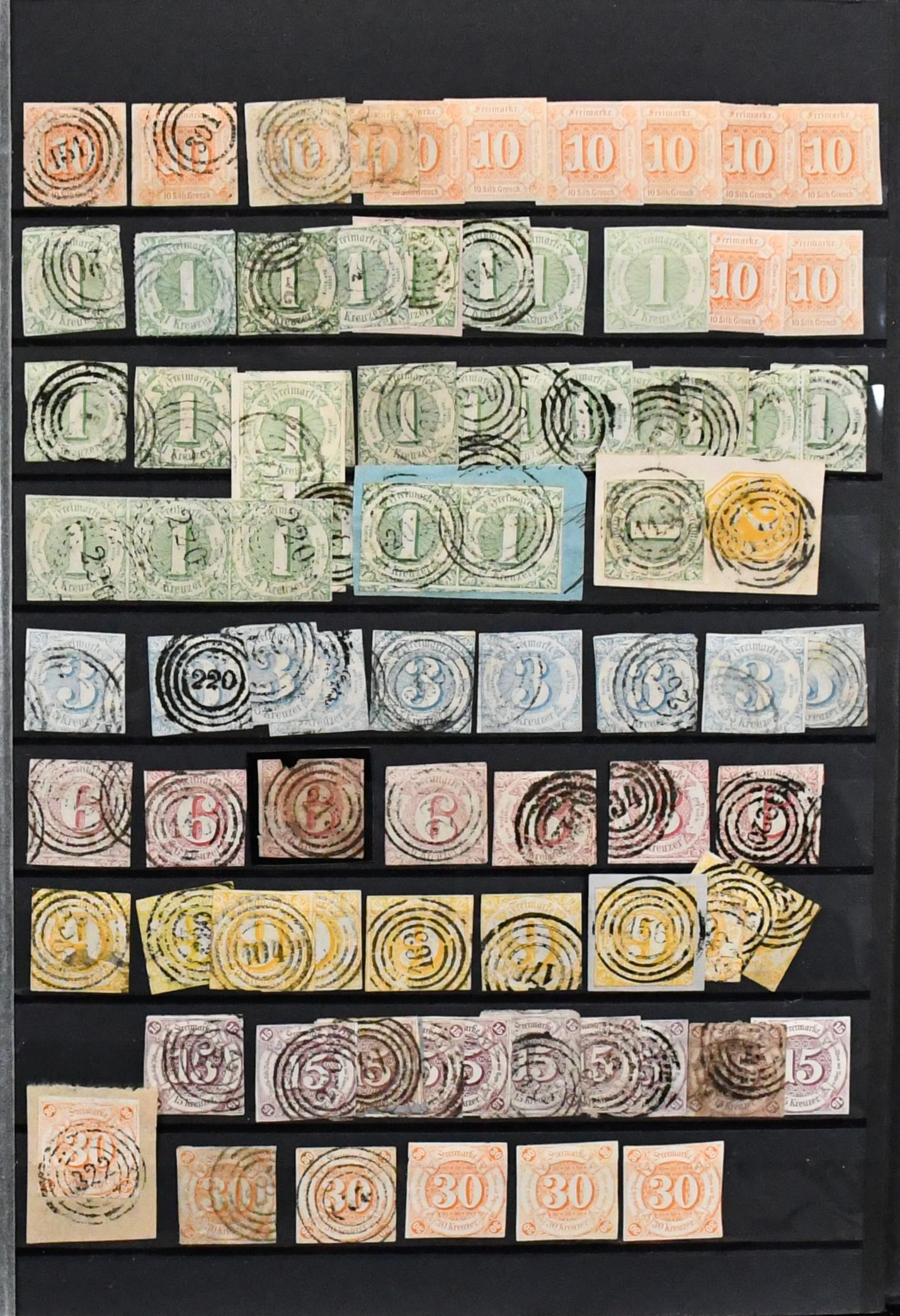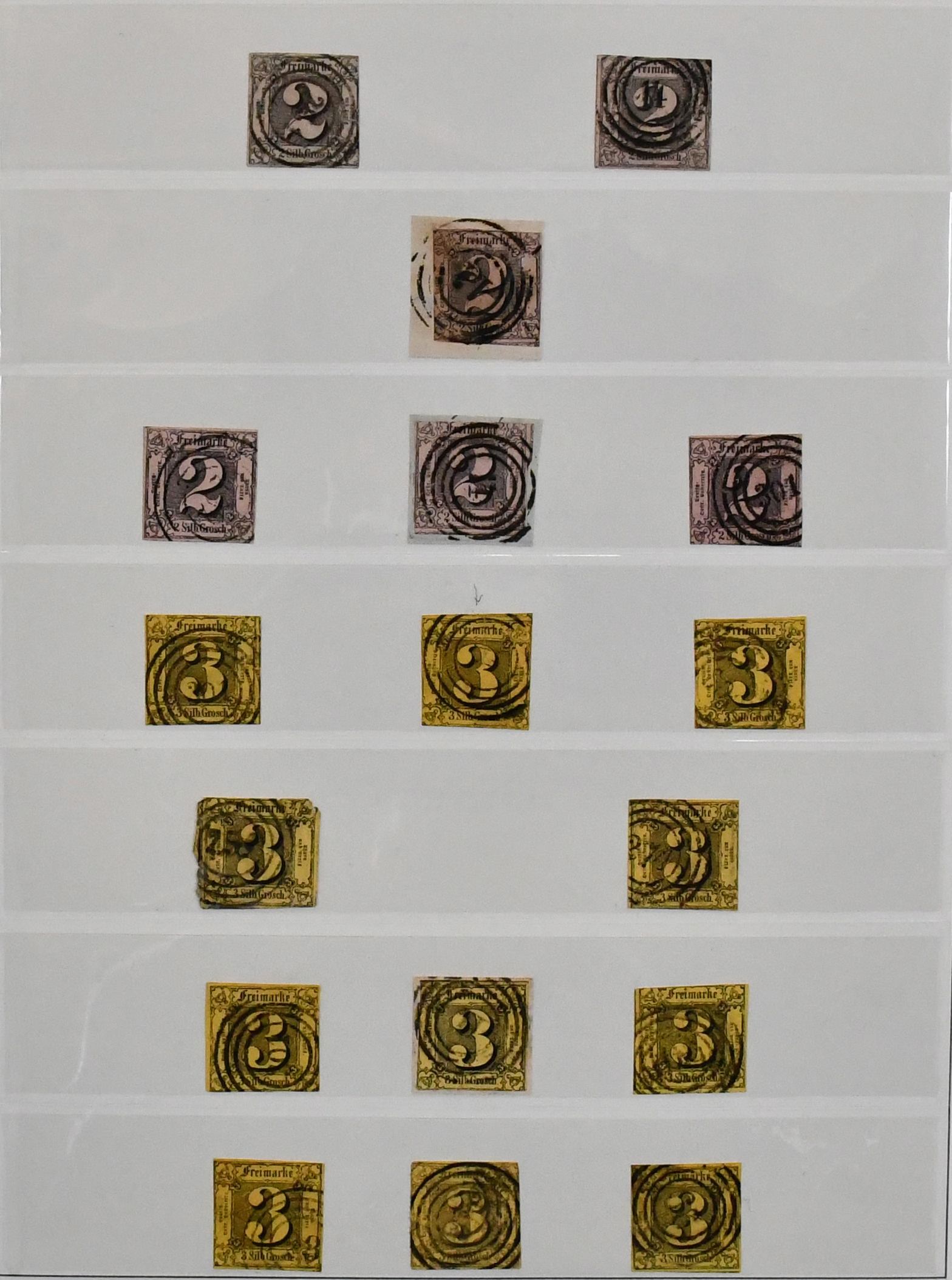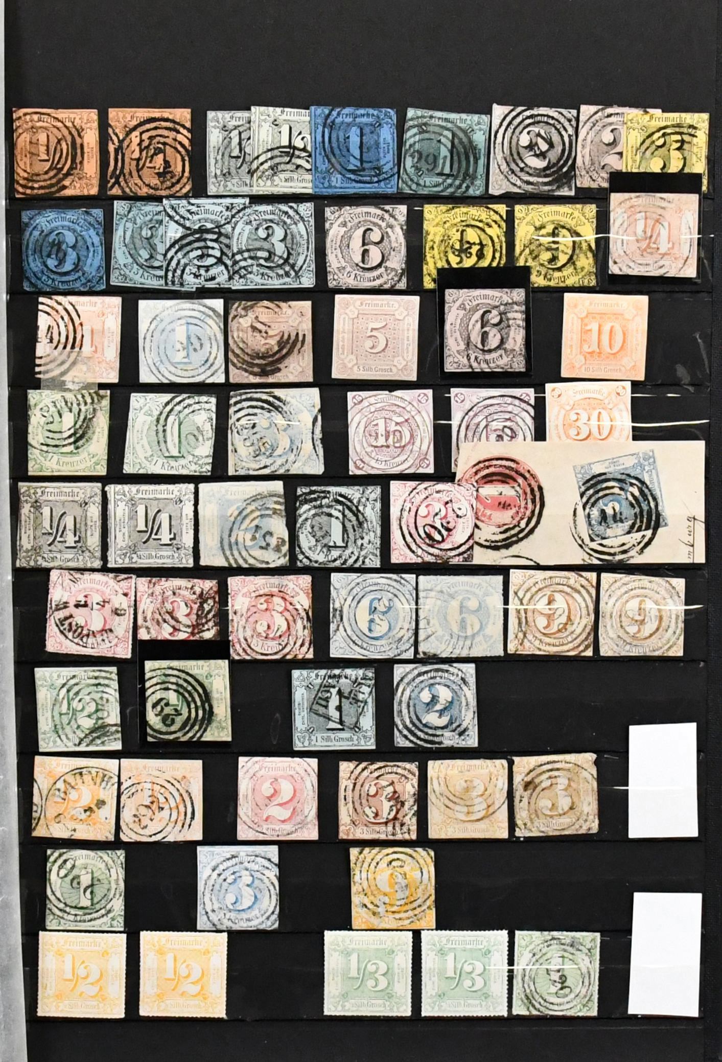 Thurn und Taxis, großer Bestand von 430 Werten in sehr untersch. Erhaltung, dabei 110 gestempelte Werte ex Nr. 1 (per acht inkl. Paar) bis 12, 120 Werte ex Nr. 13-25, dabei neun gest. 5 Sgr., drei gest. 10 Sgr., 15 Kr. neunmal gest., 30 Kr. zweimal gest., auch im Folgenden gute wie Nr. 36 und 45/46 gest., so dass sich ein enormer Katalogwert ergibt