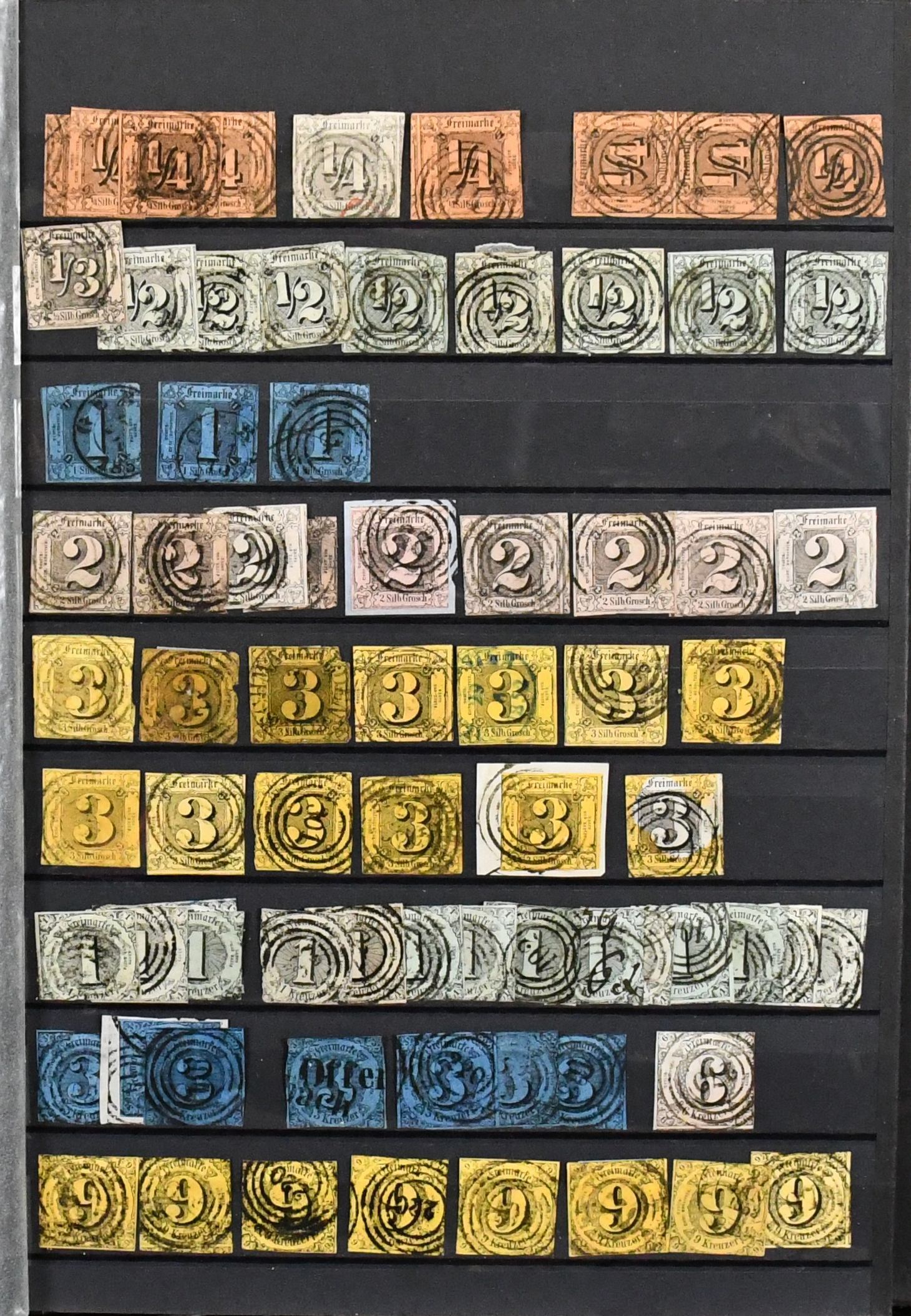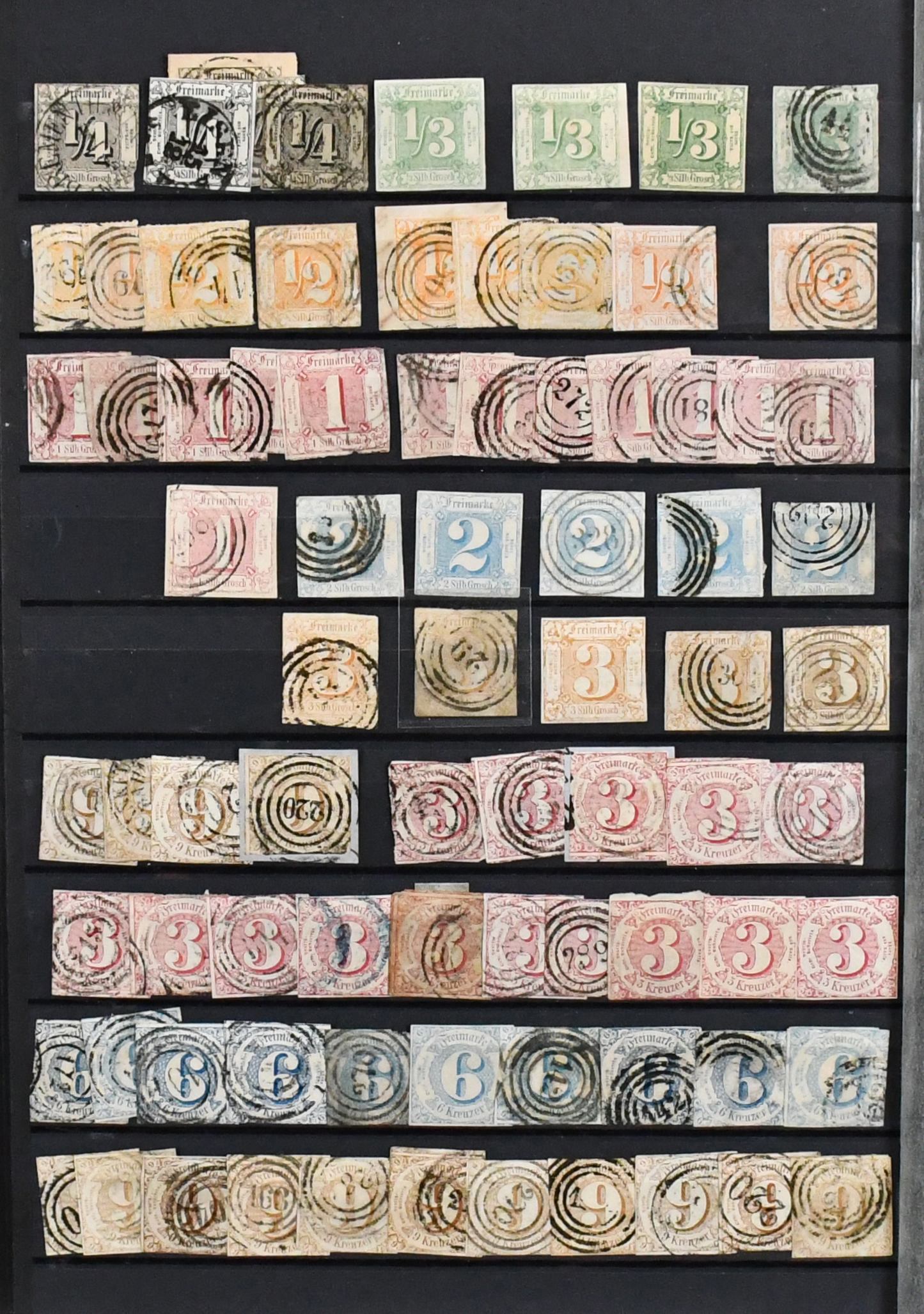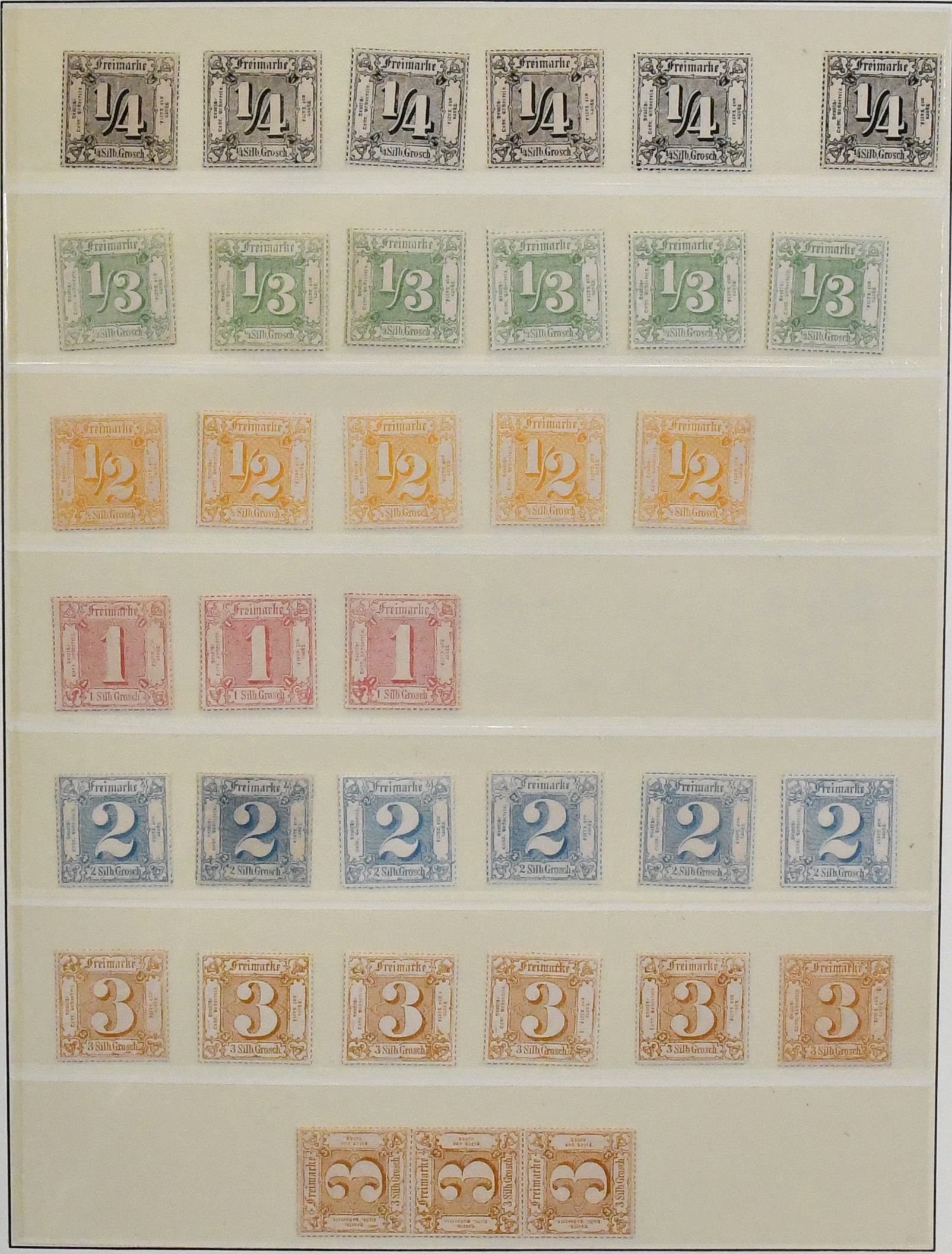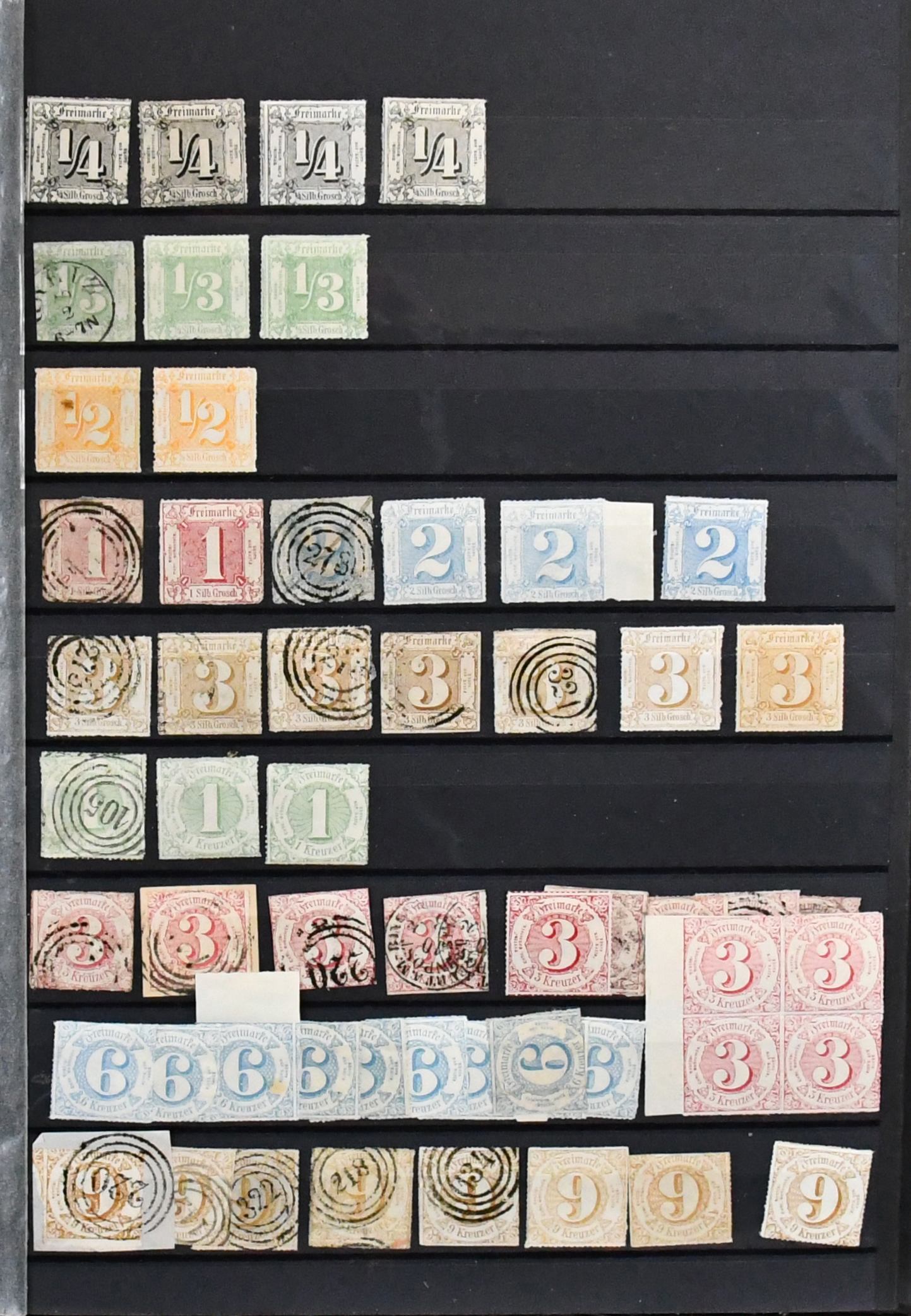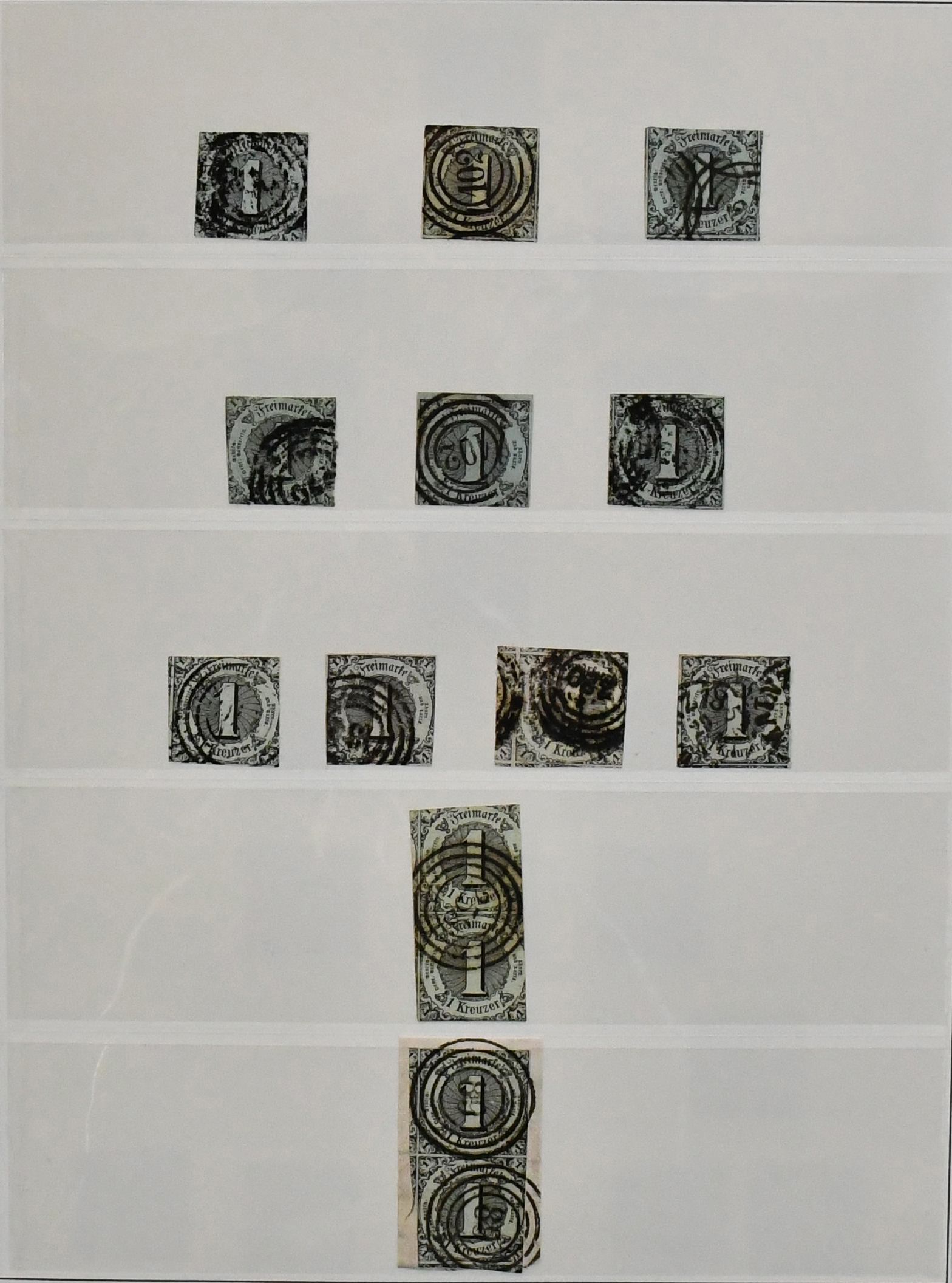 Thurn und Taxis, großer Bestand von 430 Werten in sehr untersch. Erhaltung, dabei 110 gestempelte Werte ex Nr. 1 (per acht inkl. Paar) bis 12, 120 Werte ex Nr. 13-25, dabei neun gest. 5 Sgr., drei gest. 10 Sgr., 15 Kr. neunmal gest., 30 Kr. zweimal gest., auch im Folgenden gute wie Nr. 36 und 45/46 gest., so dass sich ein enormer Katalogwert ergibt