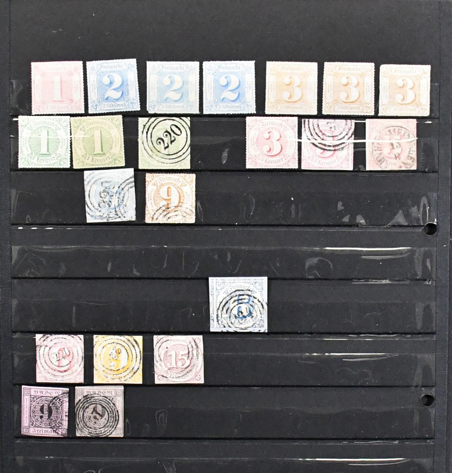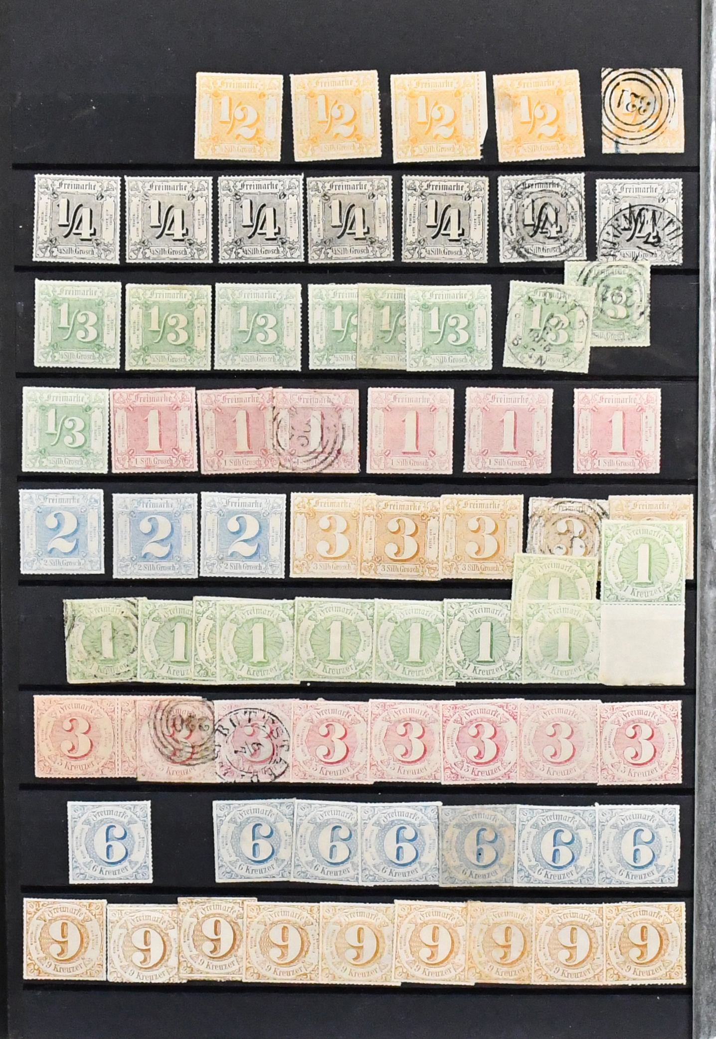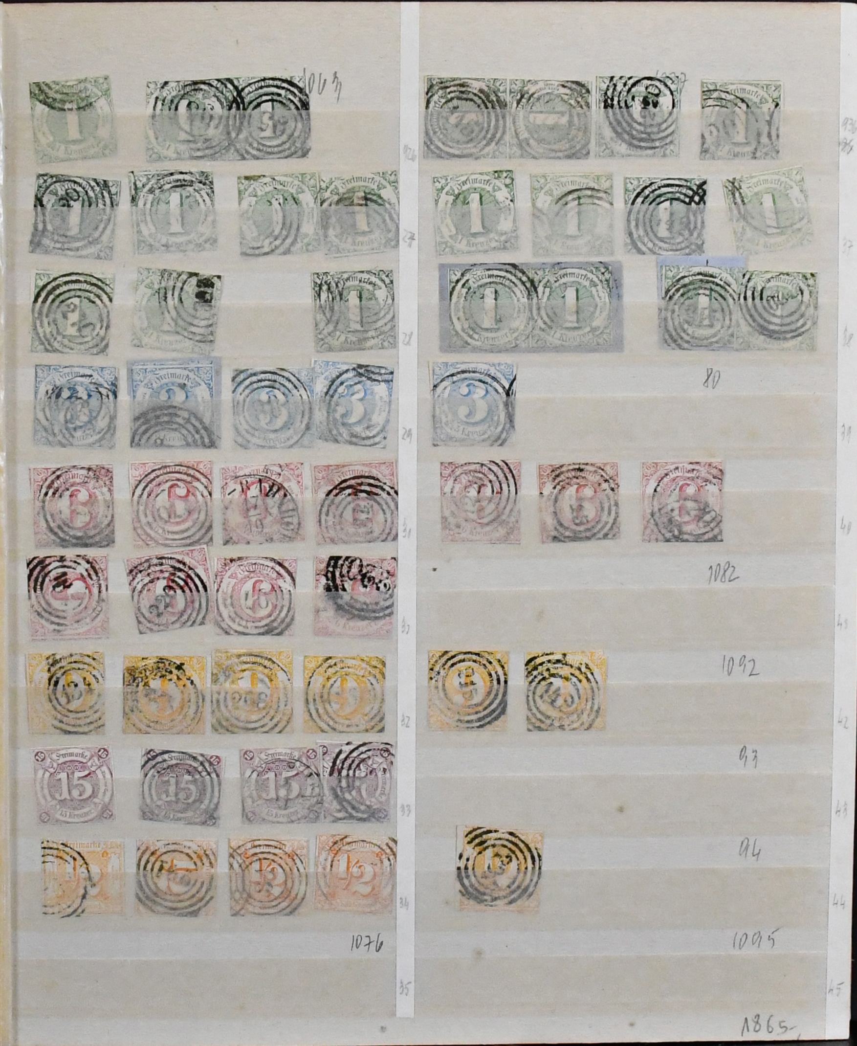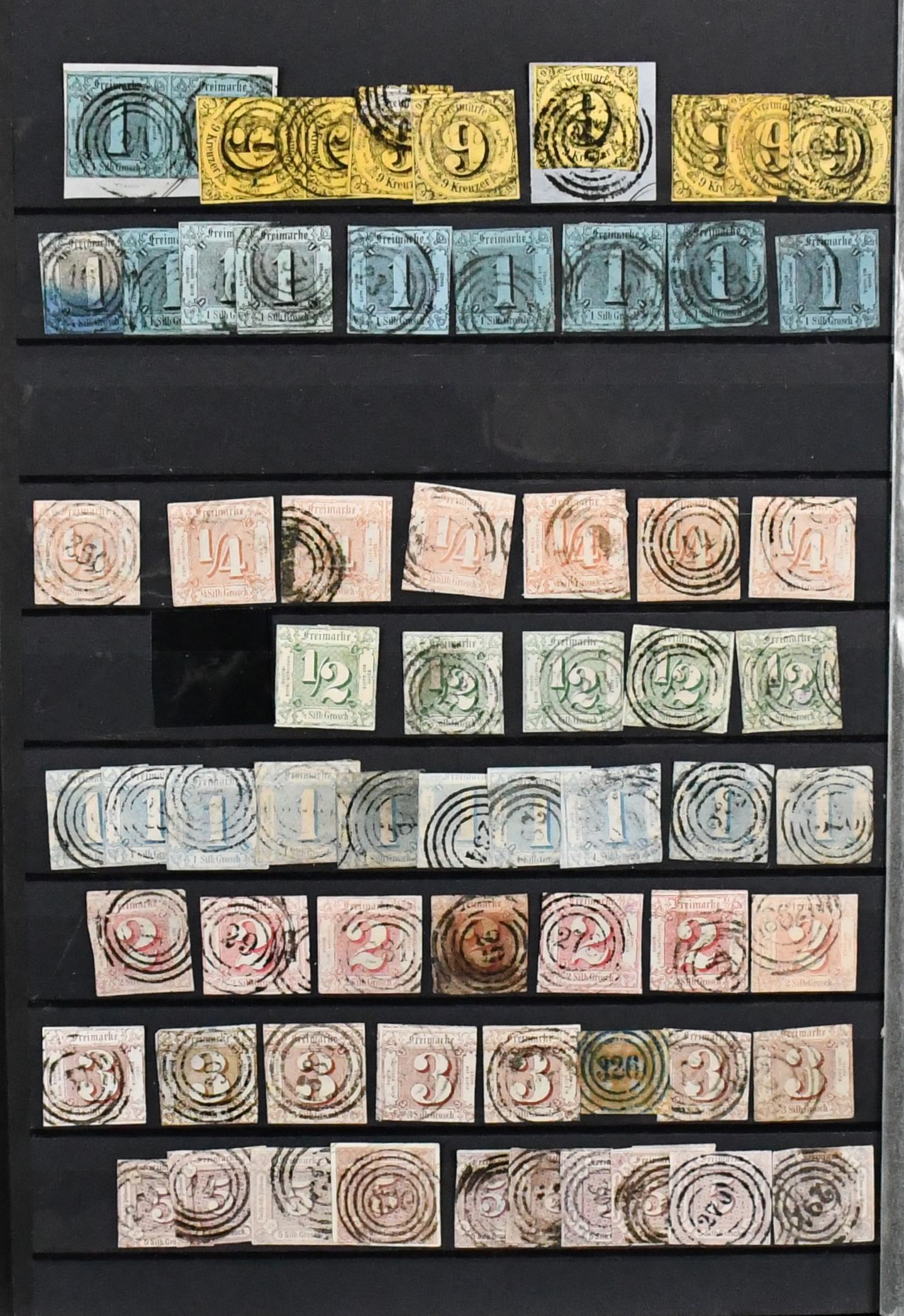 Thurn und Taxis, großer Bestand von 430 Werten in sehr untersch. Erhaltung, dabei 110 gestempelte Werte ex Nr. 1 (per acht inkl. Paar) bis 12, 120 Werte ex Nr. 13-25, dabei neun gest. 5 Sgr., drei gest. 10 Sgr., 15 Kr. neunmal gest., 30 Kr. zweimal gest., auch im Folgenden gute wie Nr. 36 und 45/46 gest., so dass sich ein enormer Katalogwert ergibt