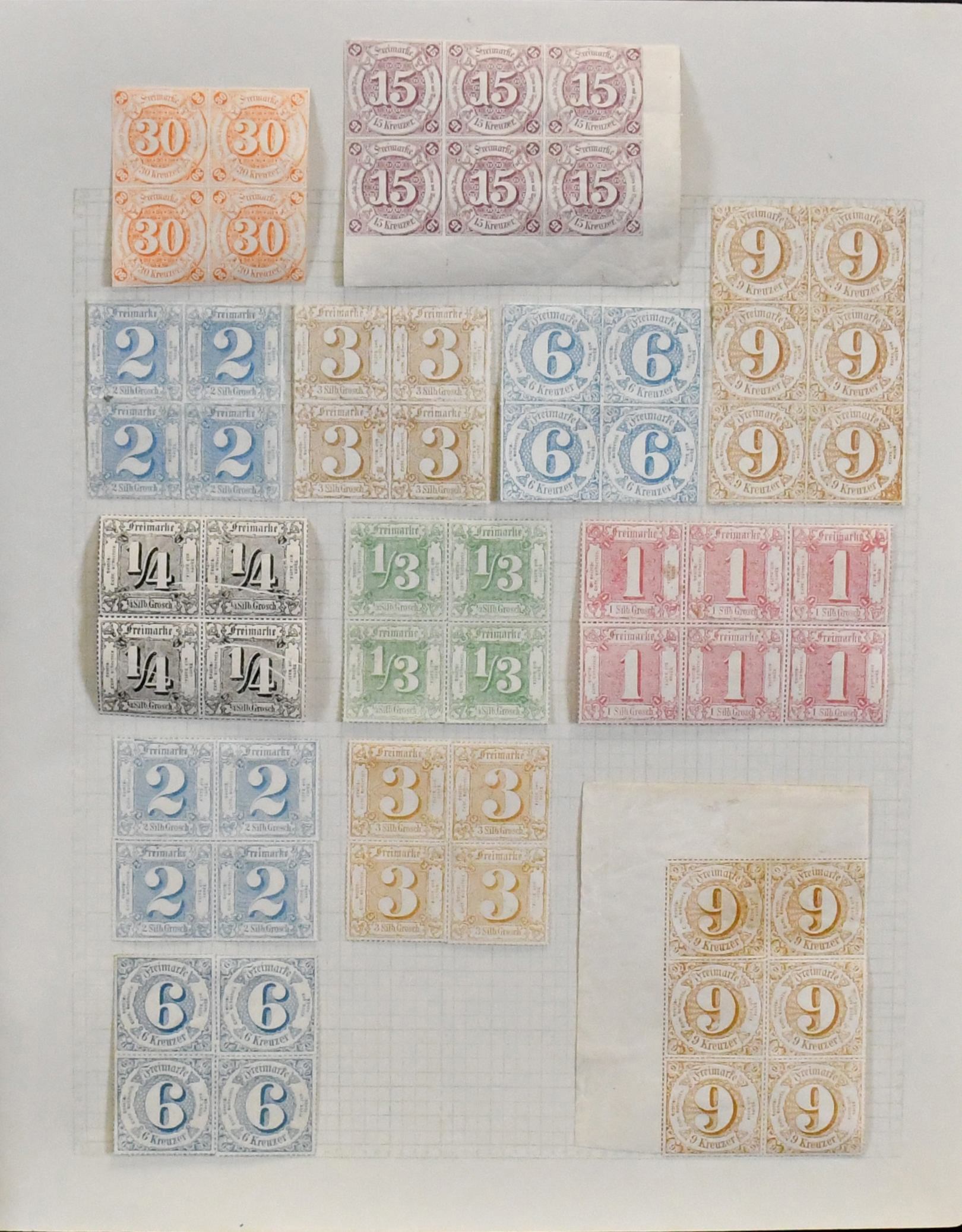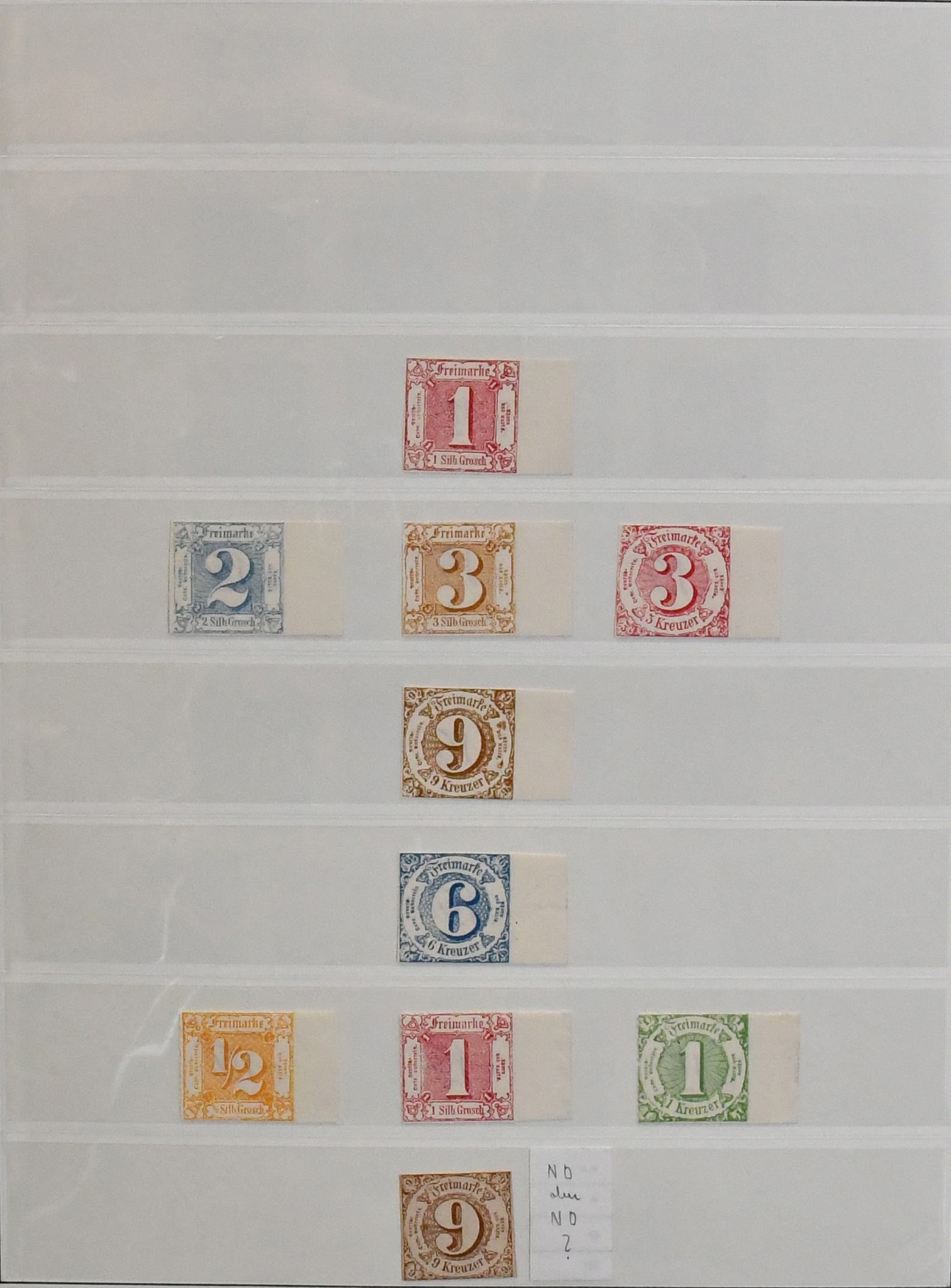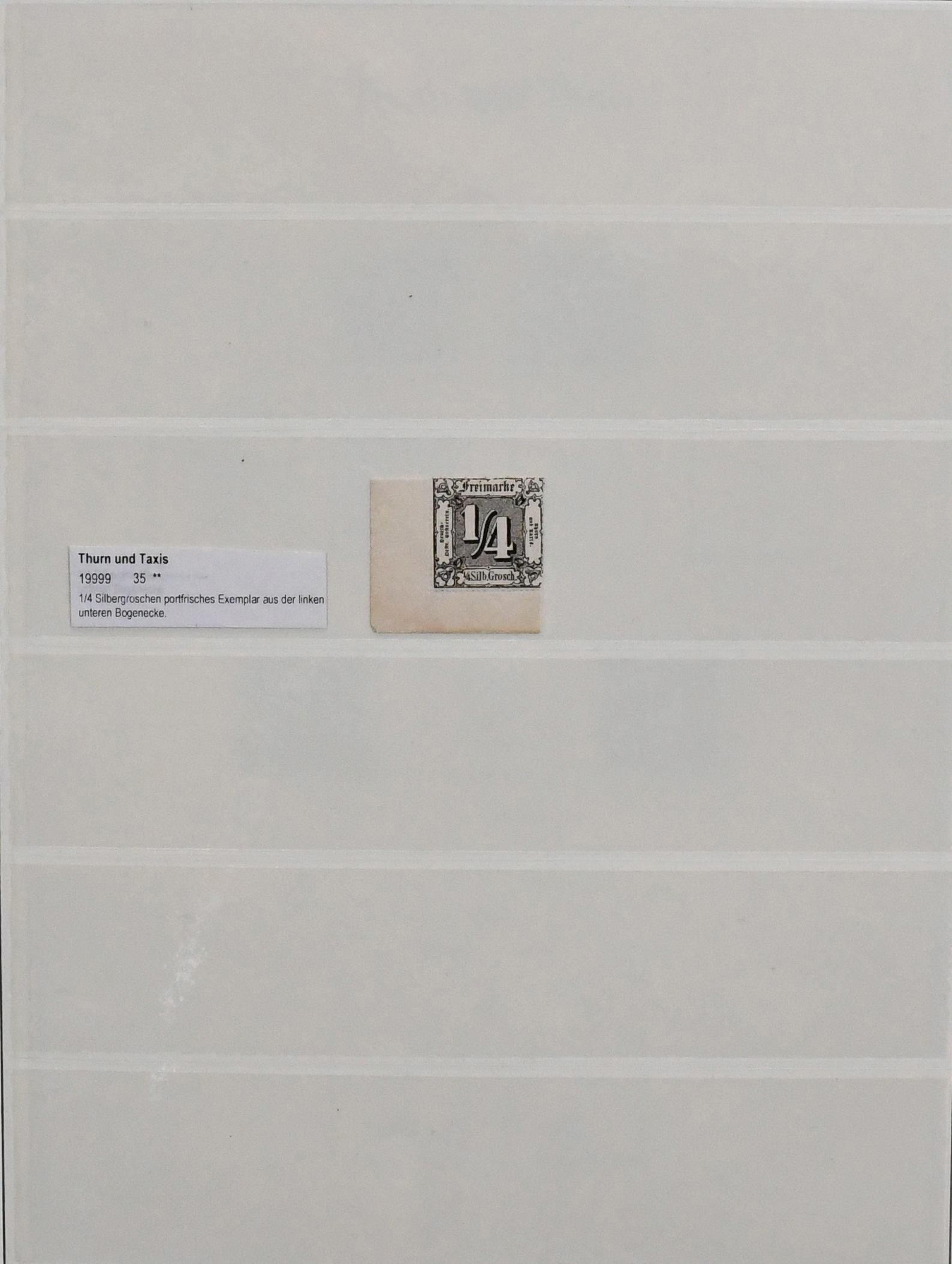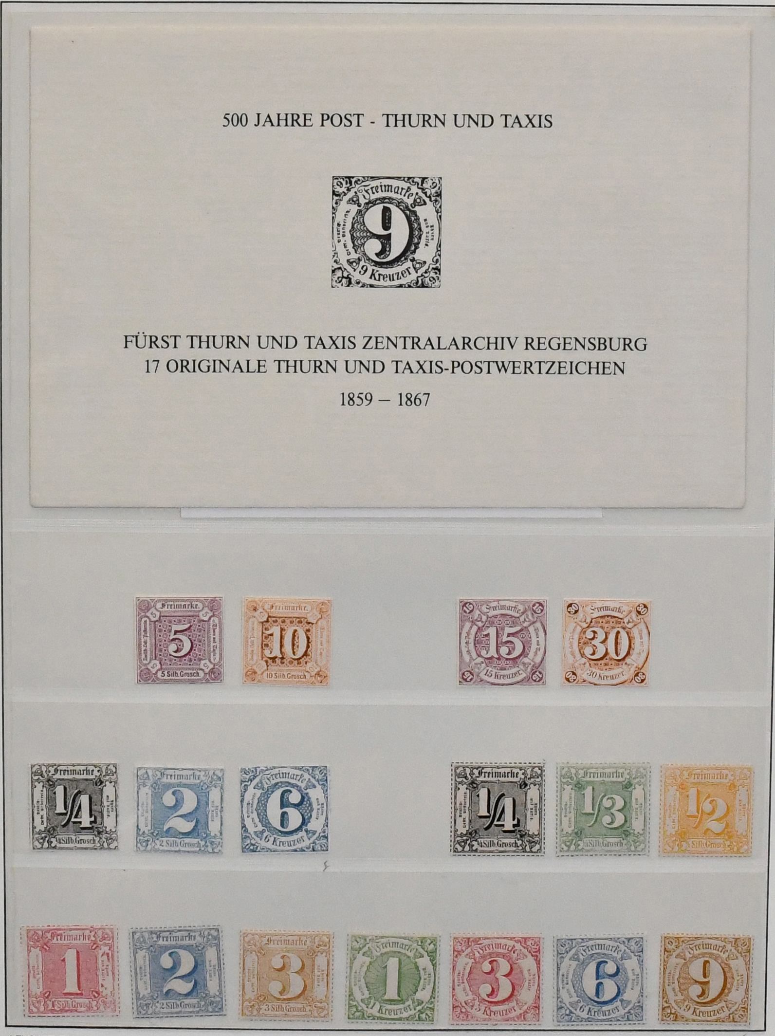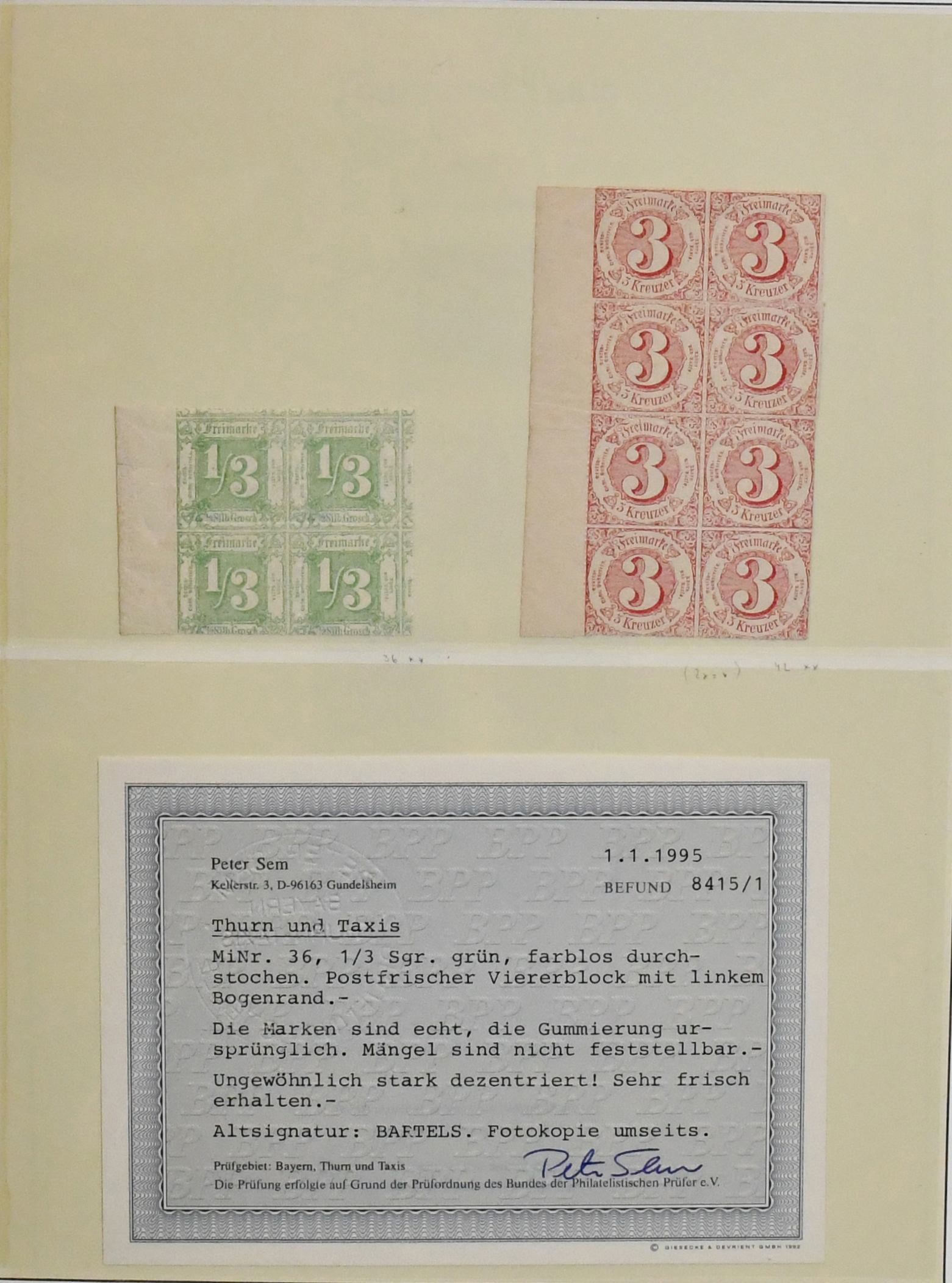 Thurn und Taxis, ausschließlich ungebrauchte Slg. mit etlichen seltenen Marken, dabei Nr. 2, 7a und 9 (gepr. Helbig) je mit Originalgummi, 13, 15, 16, 17 (postfrisch!), 26-34 überkpl., u.a. zusätzlich Nr. 26, 29, 30, 32, je postfrisch, 35-44 oft postfr., z.B. postfrische Rand-/Eckrand-Viererblöcke Nr. 35, 36 (vier postfr. VB!), 42 im meist postfr. Achterblock, sowie die Ausgabe danach u.a. in großen Einheiten. Insgesamt sind rund 360 Originale, viele postfrisch, sowie die Neudrucke meist dreifach, enthalten. Seltenes Angebot!
