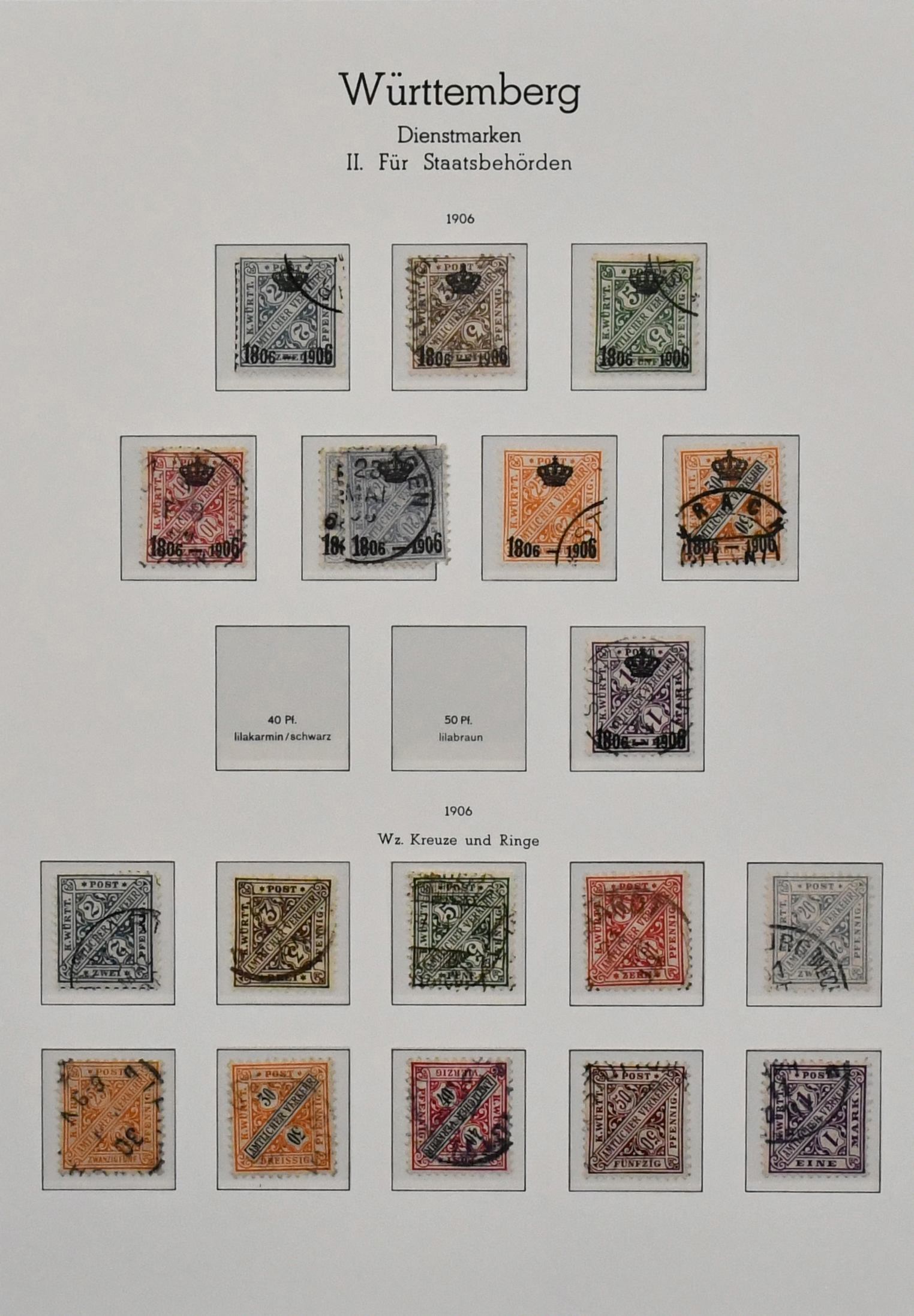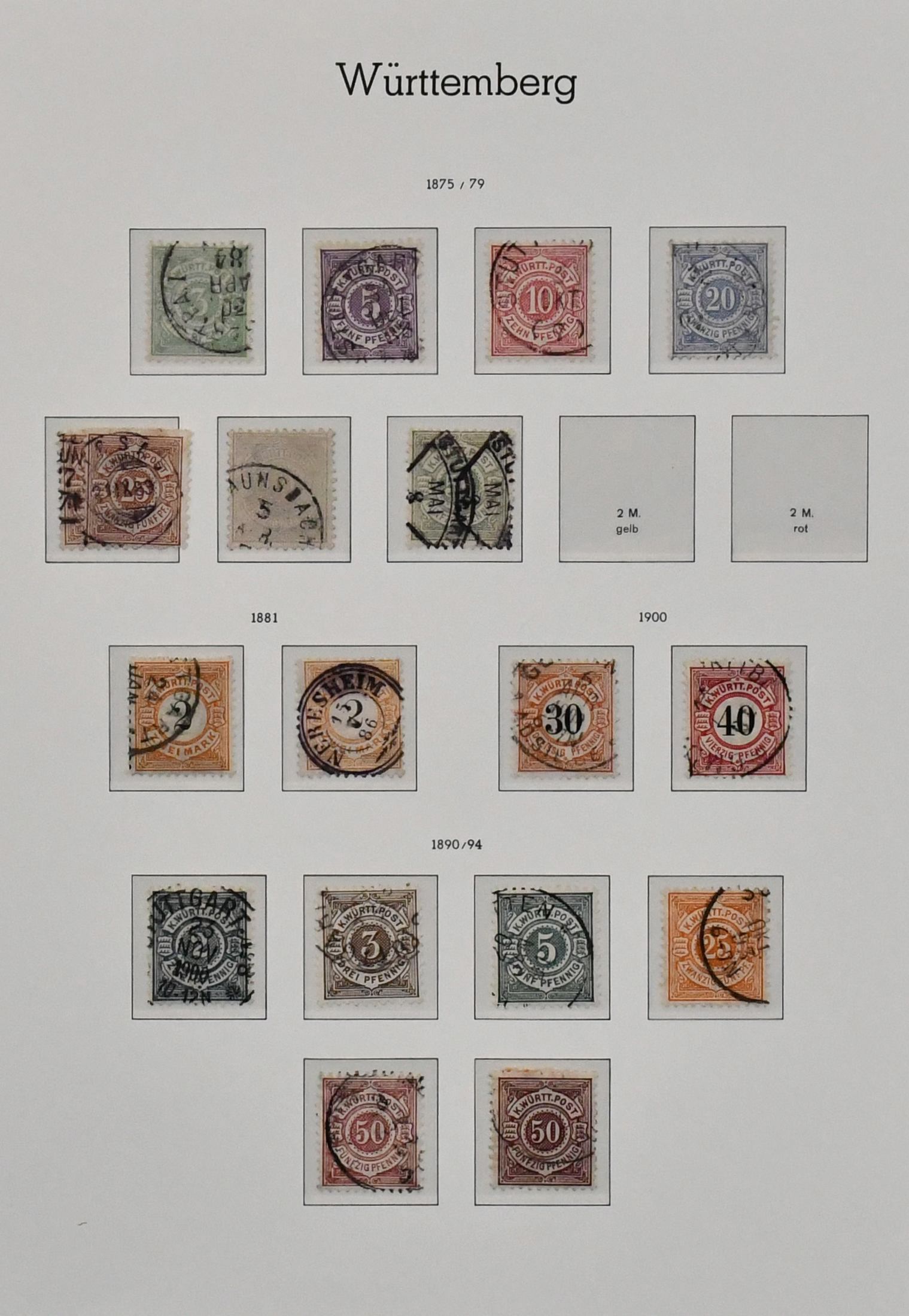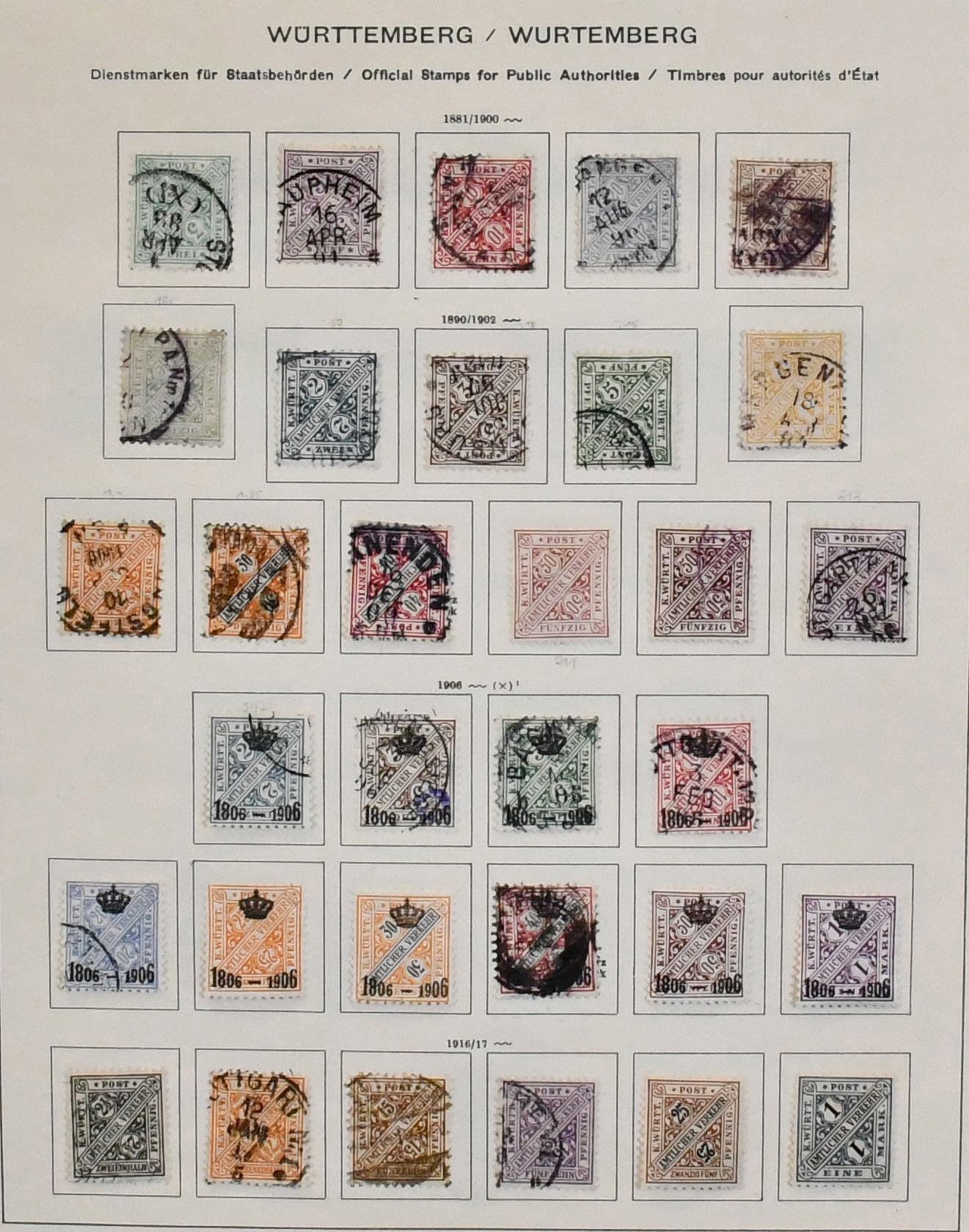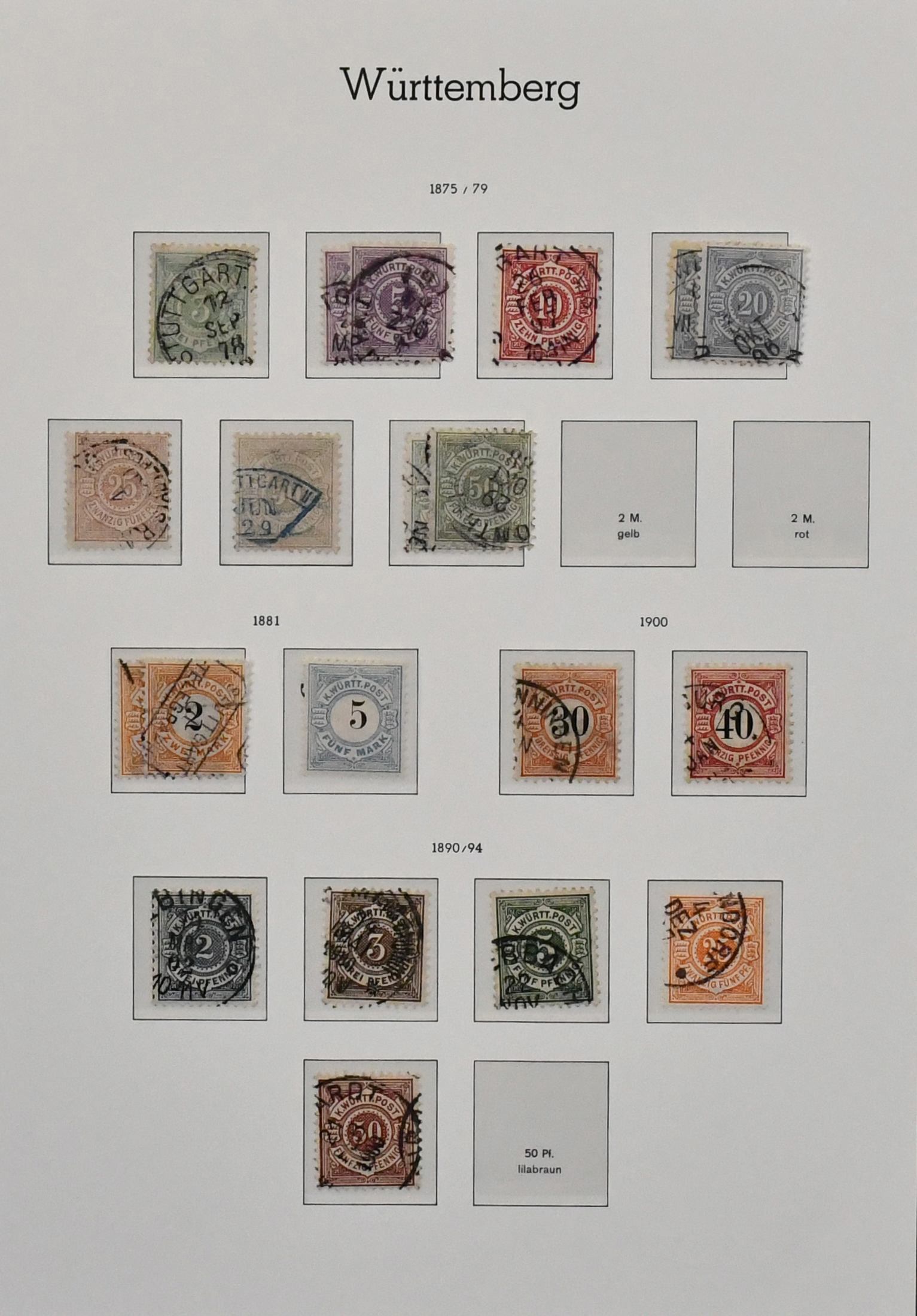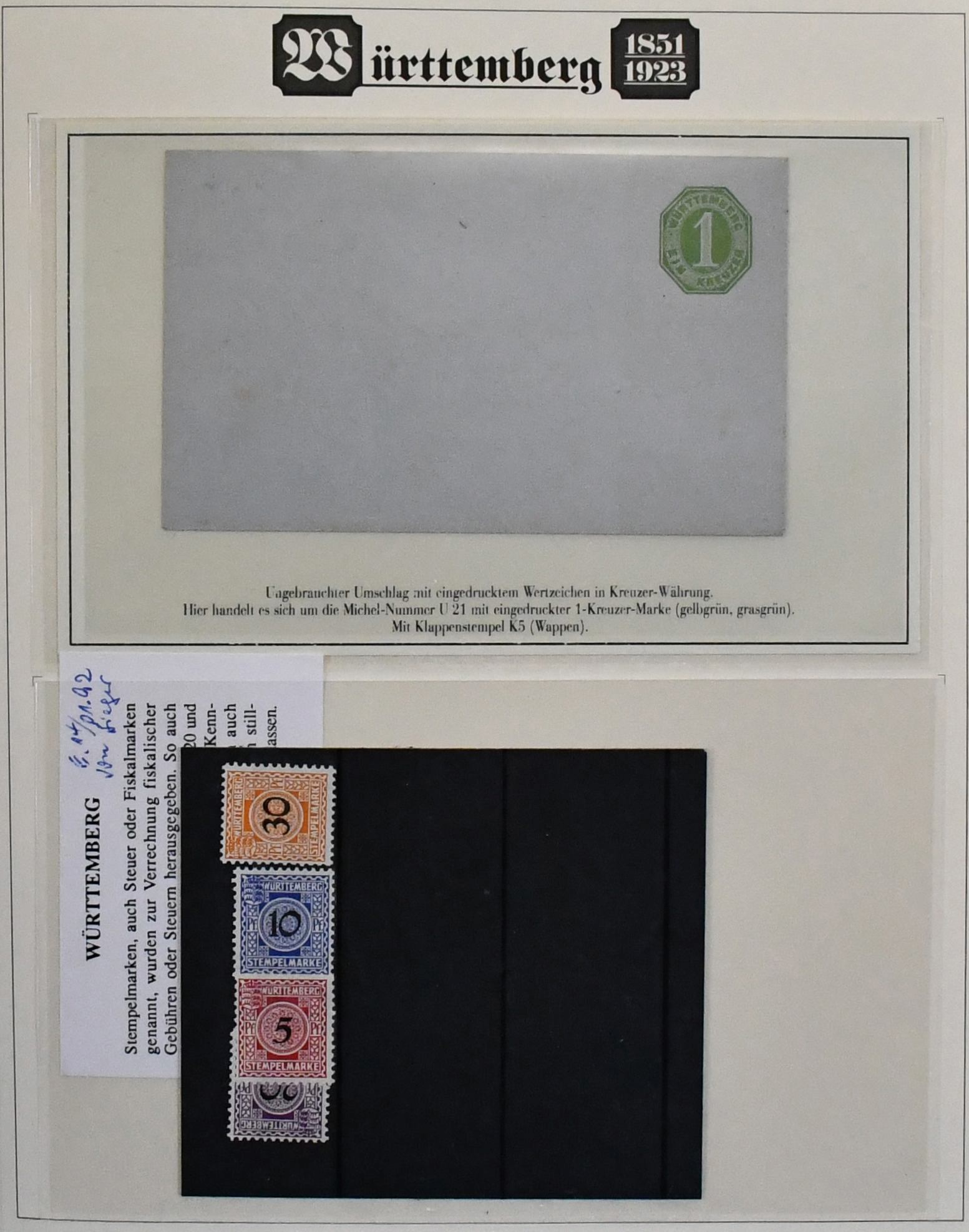 Württemberg, 1851/1920, umfangreiche, meist gestempelte Slg., beginnend mit, bis auf Nr. 10, 21, 24 u. 42, komplettem Kreuzerteil, inkl. Nr. 15, 16/19x/y, 20, guter Nr. 29 ungebr., 34 usw., im alten Borek-Vordruckalbum. Dazu die "modernen" Ausgaben mit u.a. Nr. 54, 207, beiden Krönchen-Sätzen etc. Mi. rund 13.000,-