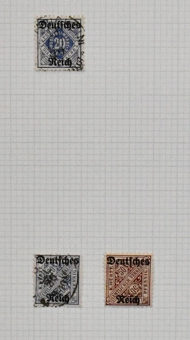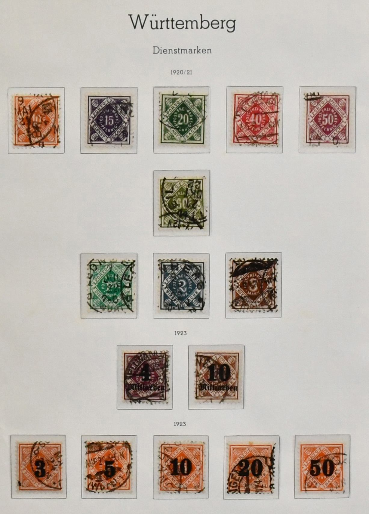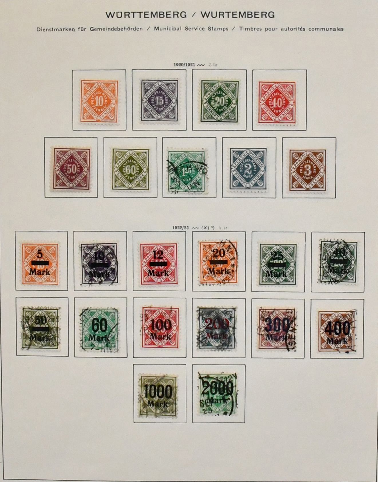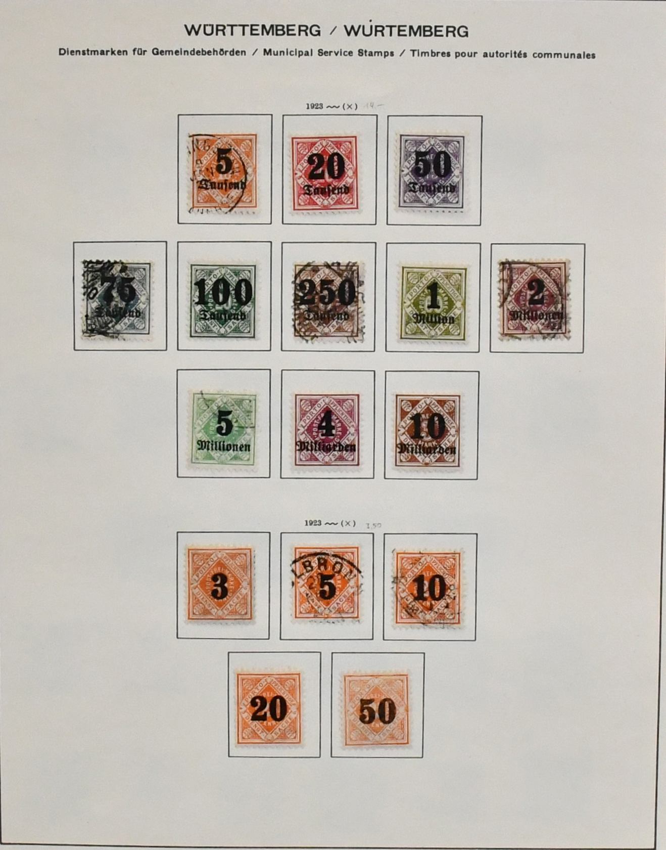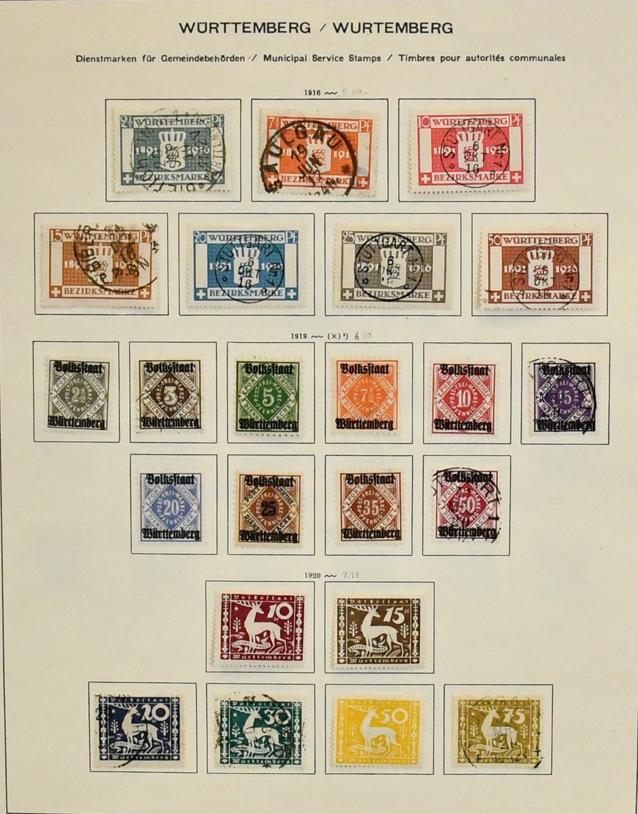 Württemberg, 1851/1920, umfangreiche, meist gestempelte Slg., beginnend mit, bis auf Nr. 10, 21, 24 u. 42, komplettem Kreuzerteil, inkl. Nr. 15, 16/19x/y, 20, guter Nr. 29 ungebr., 34 usw., im alten Borek-Vordruckalbum. Dazu die "modernen" Ausgaben mit u.a. Nr. 54, 207, beiden Krönchen-Sätzen etc. Mi. rund 13.000,-