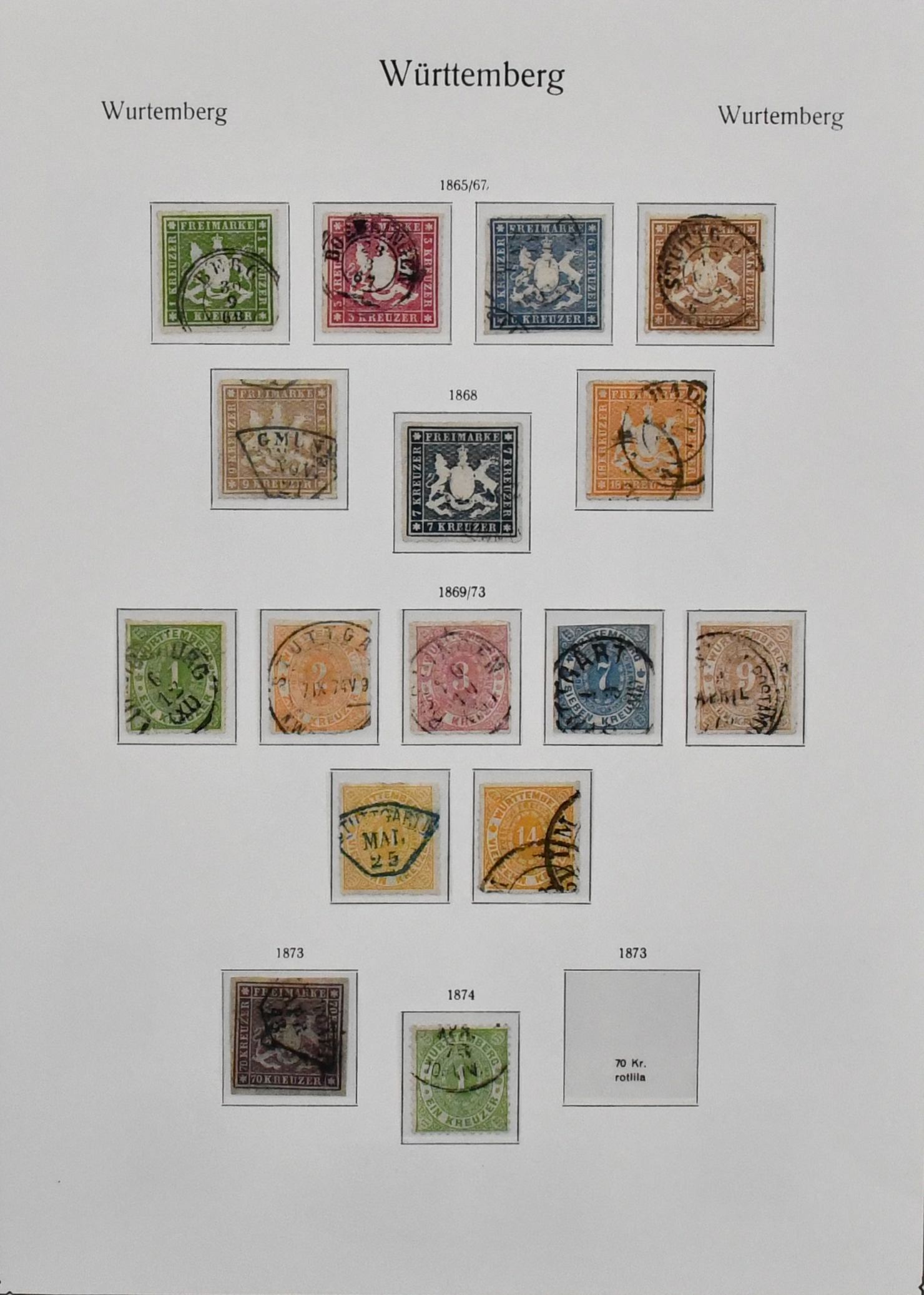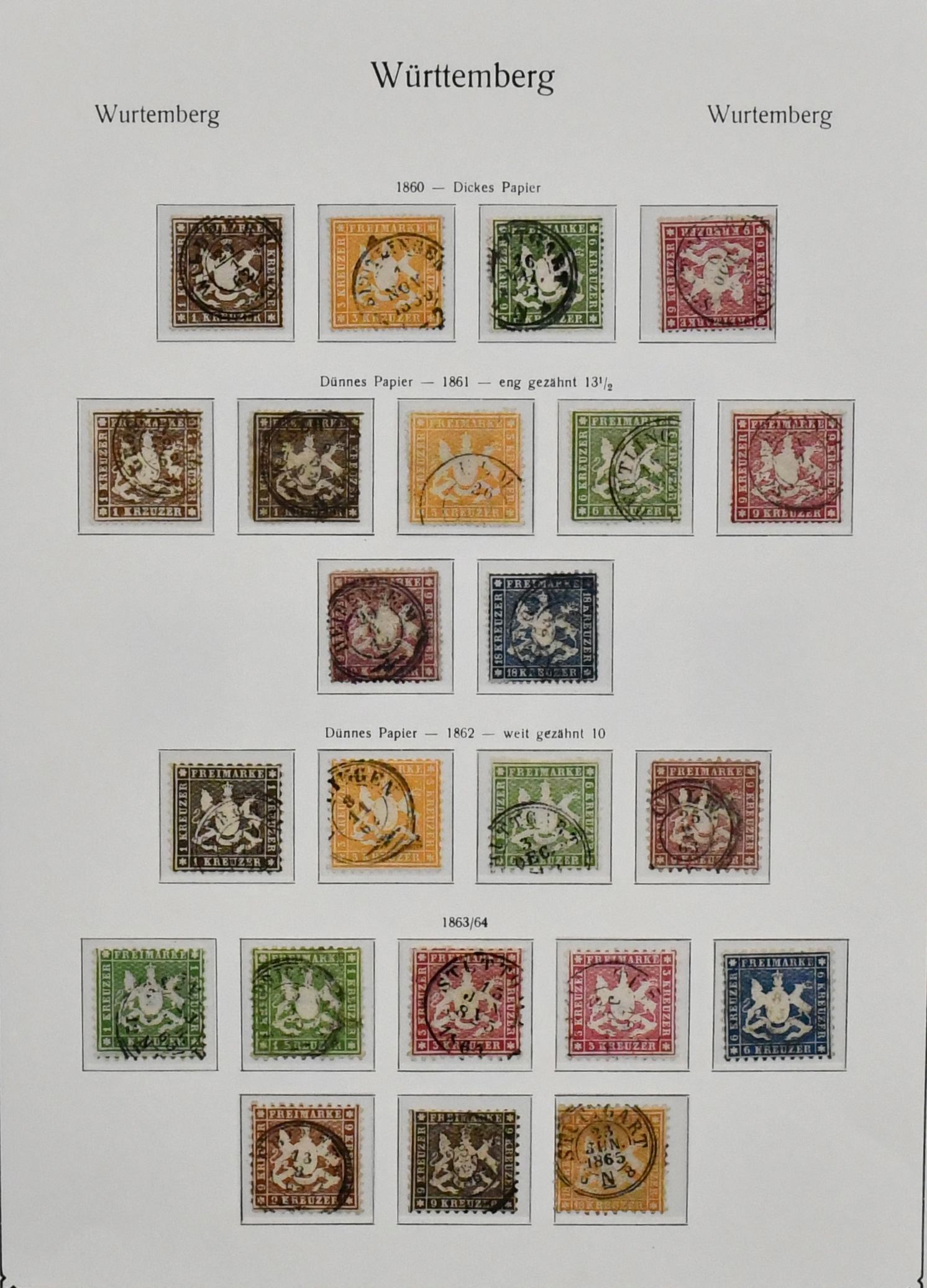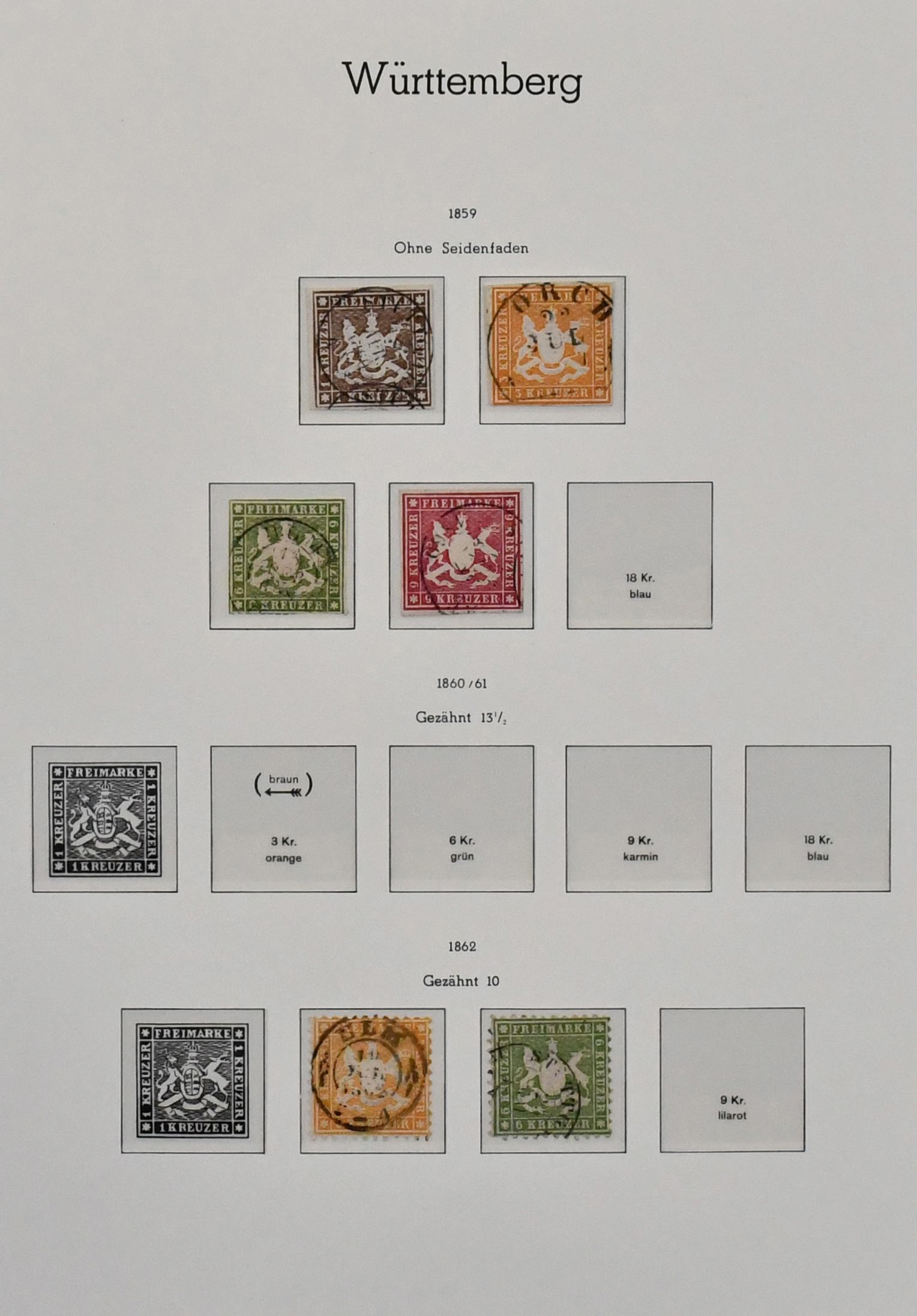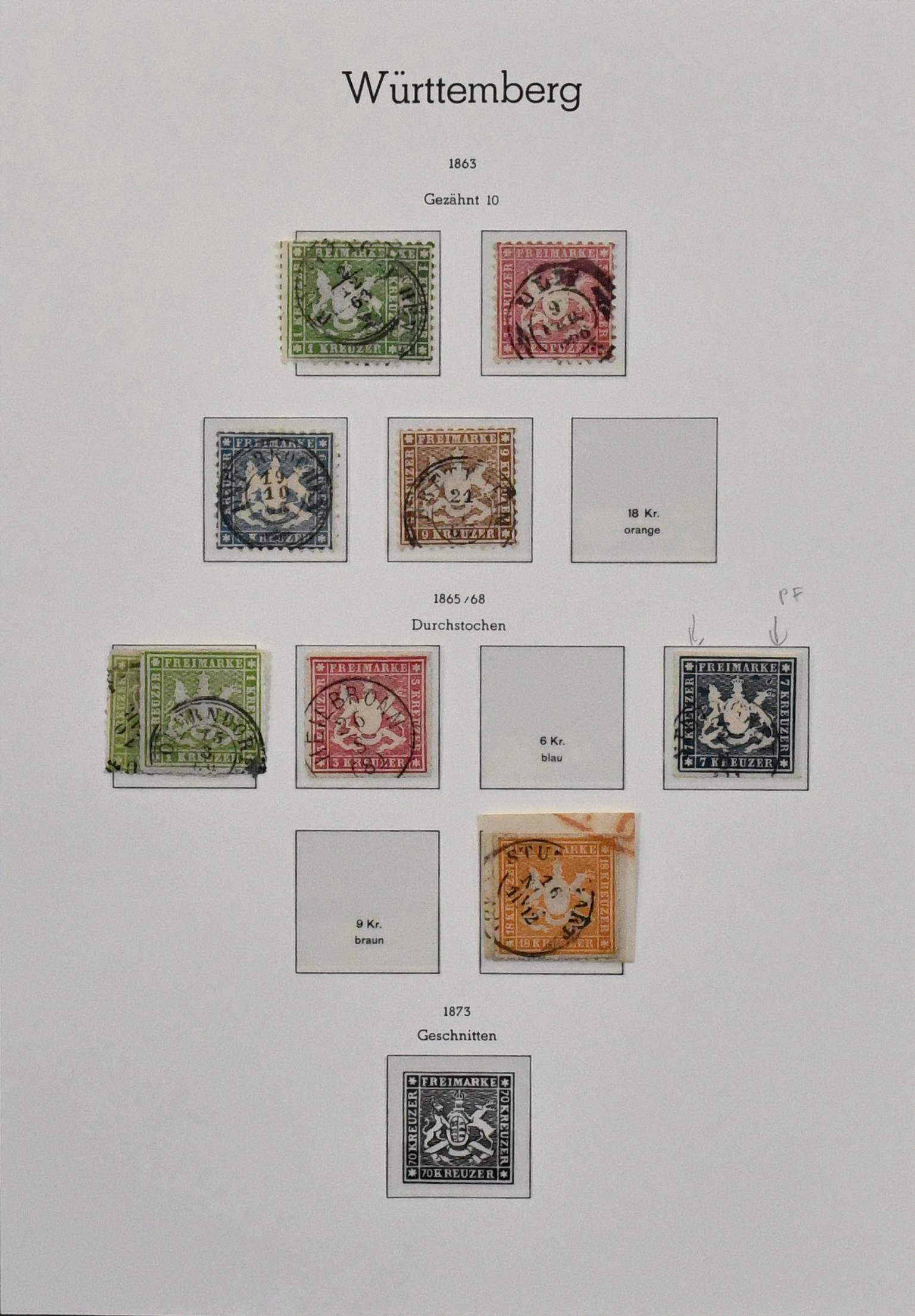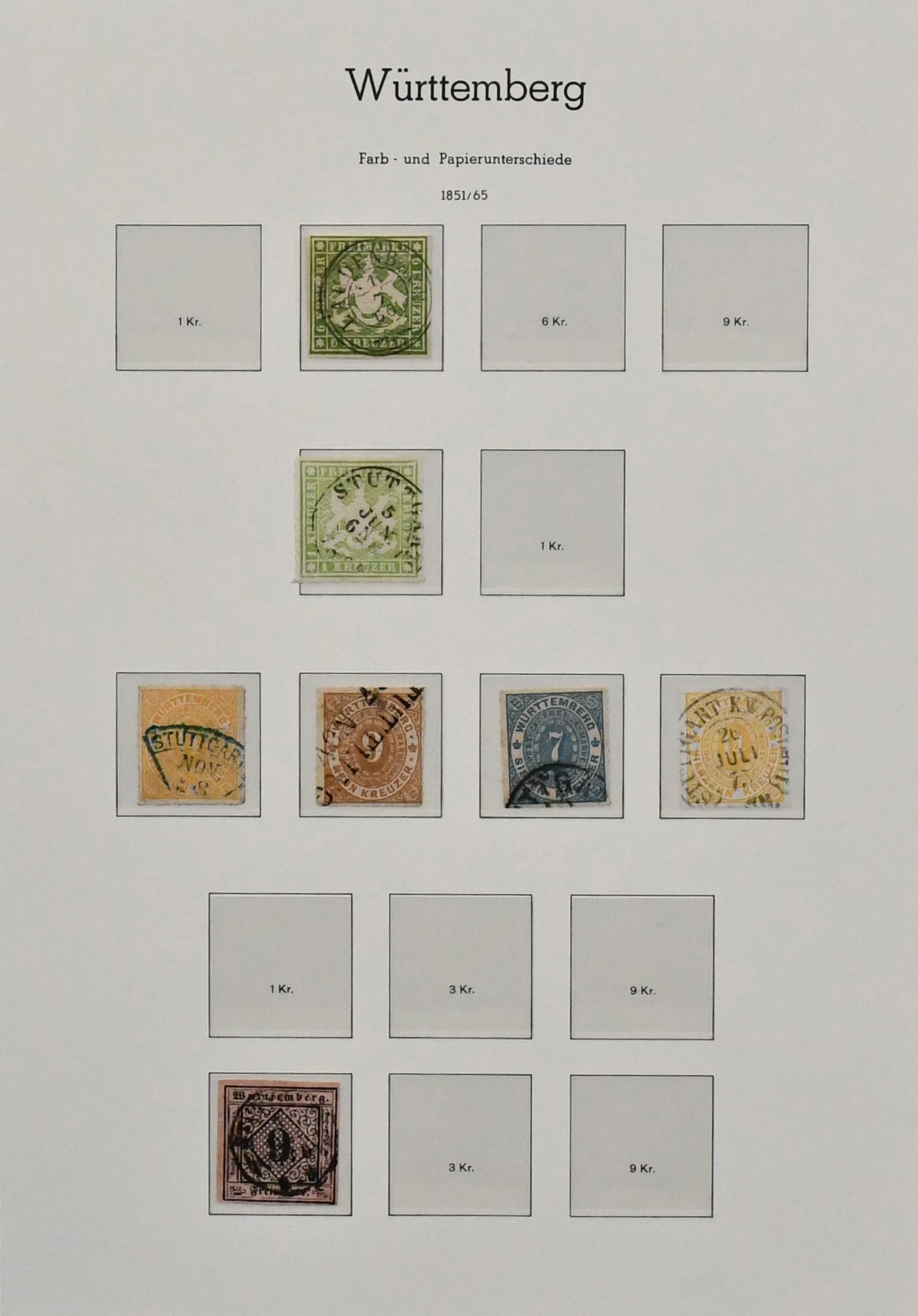 Württemberg, Slg. auf KABE-Vordrucken, dabei der Kreuzer-Teil überkomplett (alleine über 21.000,- Michel) mit Nr. 16-20y und 16-19x, seltener 70 Kr. (Nr. 42a) gestempelt, sowie im Anhang die Pfennigzeit reichlich gesammelt