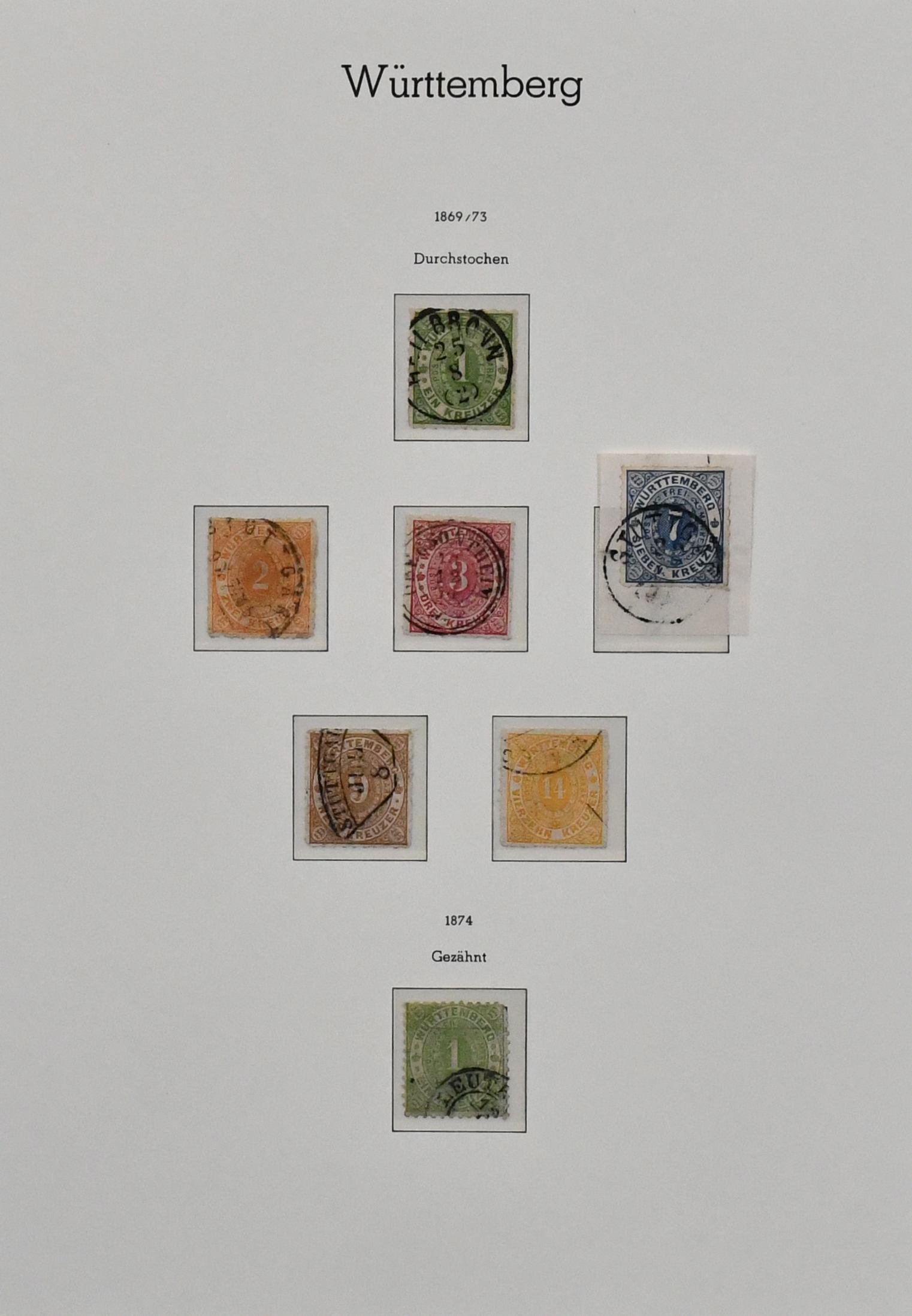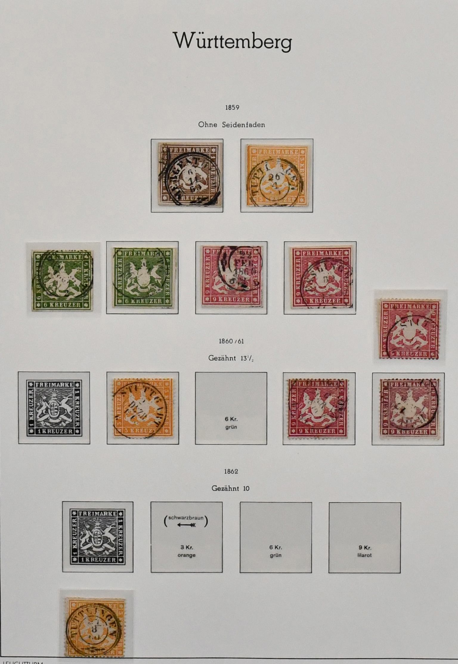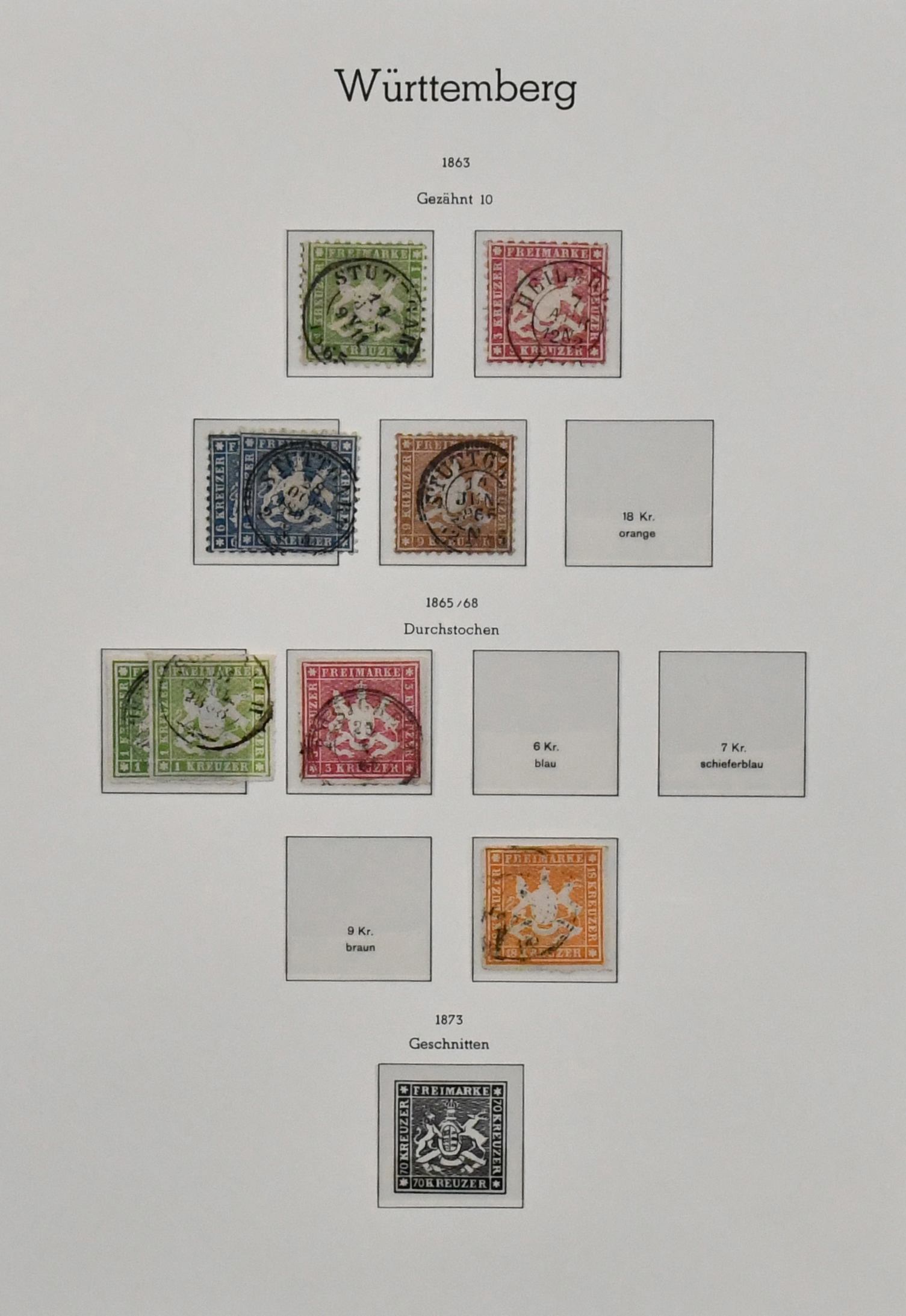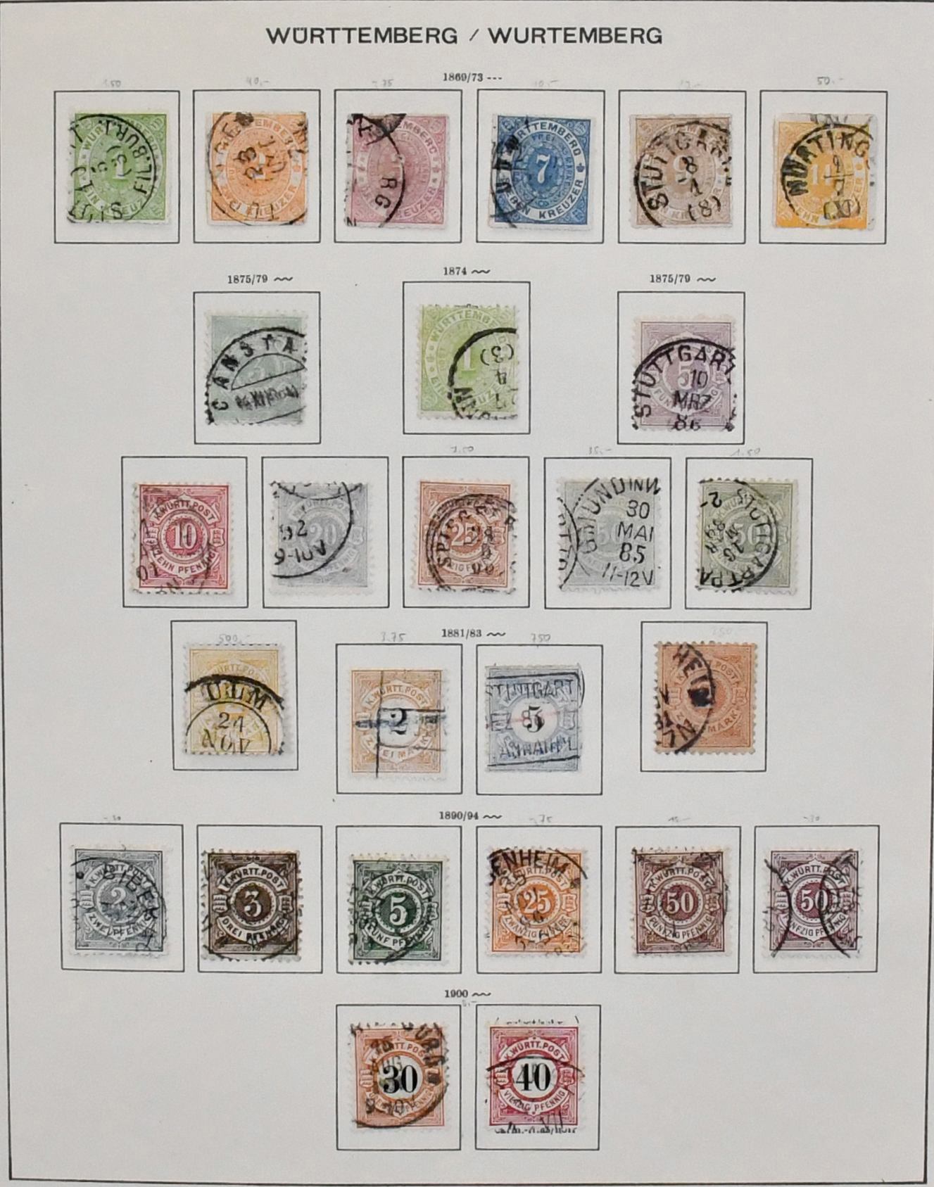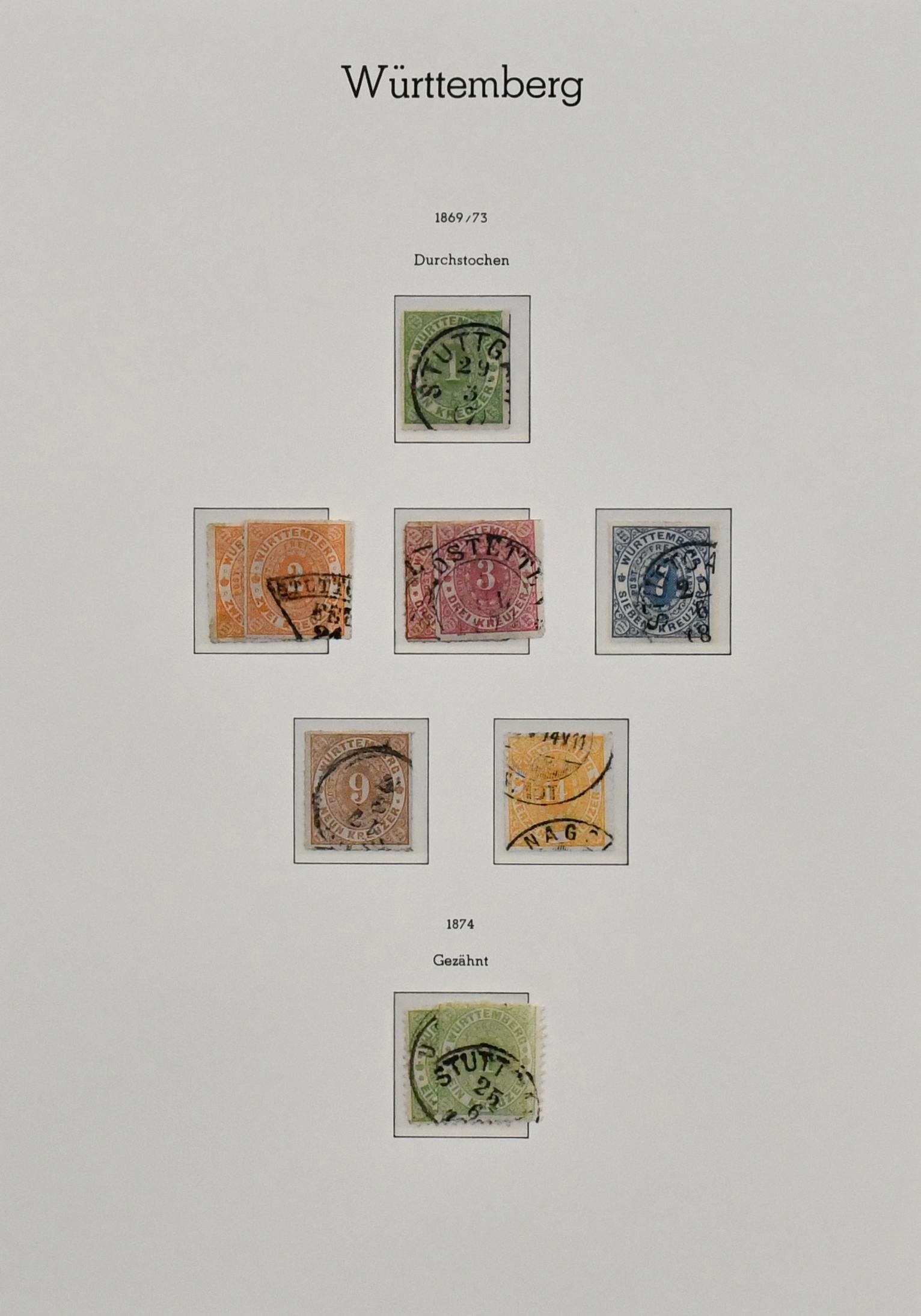Württemberg, Slg. auf KABE-Vordrucken, dabei der Kreuzer-Teil überkomplett (alleine über 21.000,- Michel) mit Nr. 16-20y und 16-19x, seltener 70 Kr. (Nr. 42a) gestempelt, sowie im Anhang die Pfennigzeit reichlich gesammelt