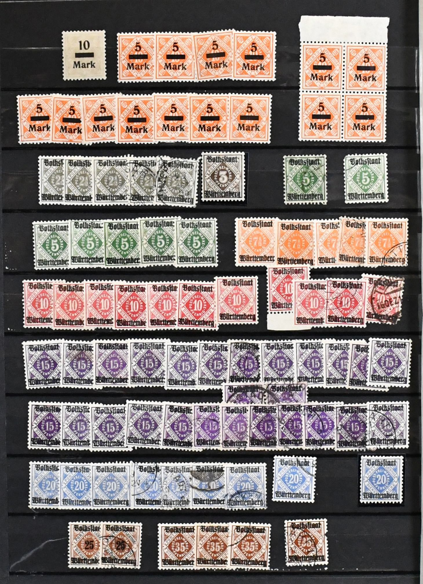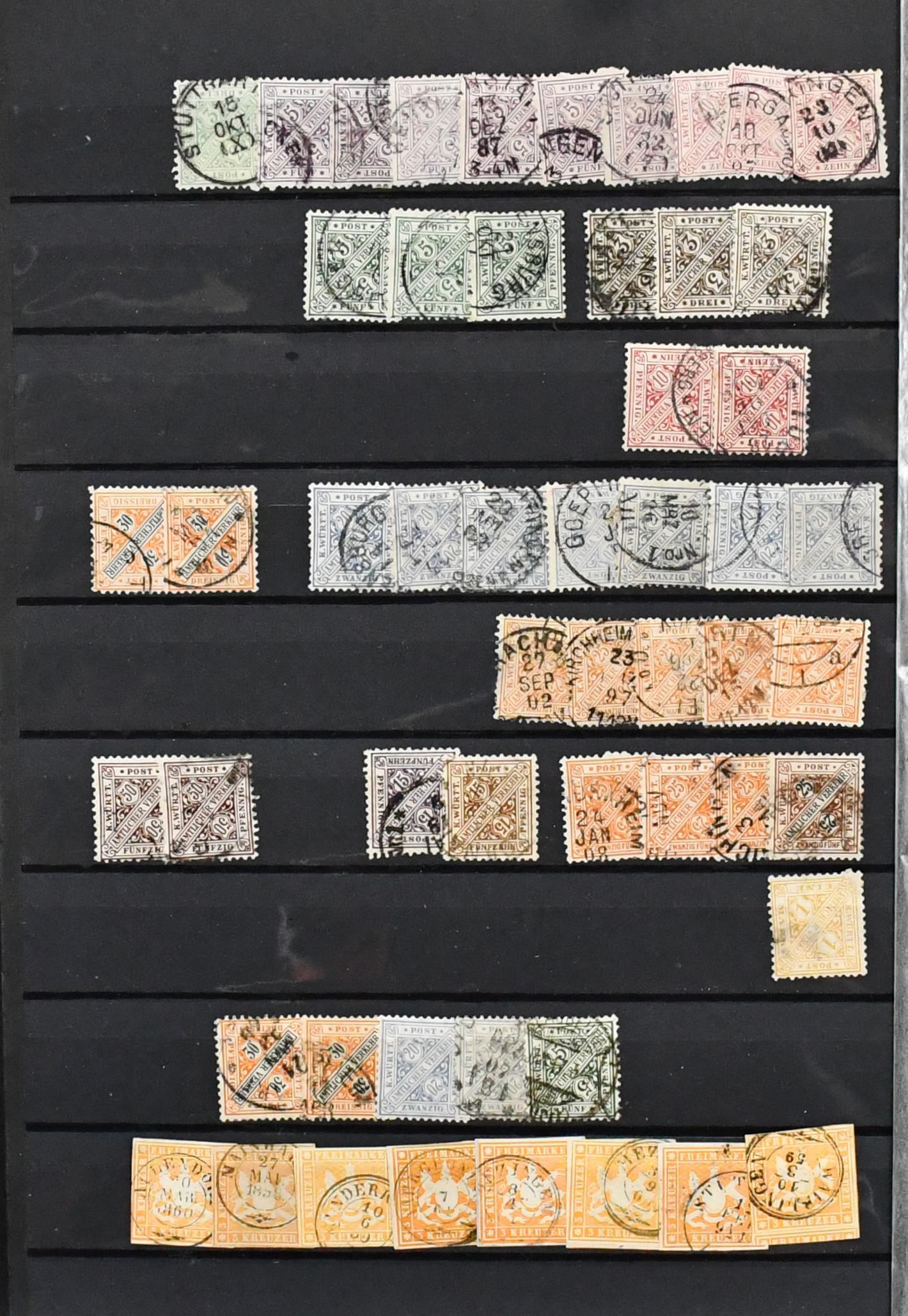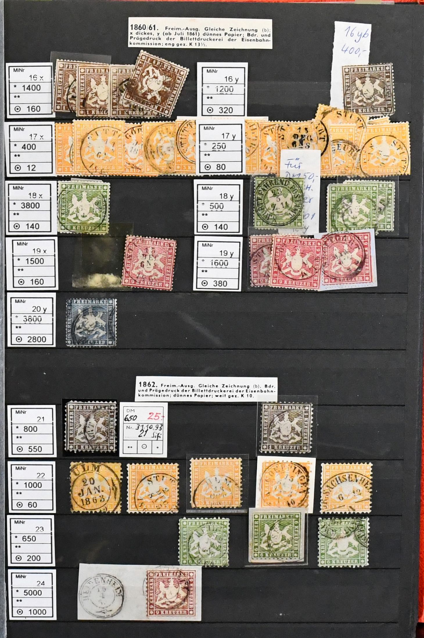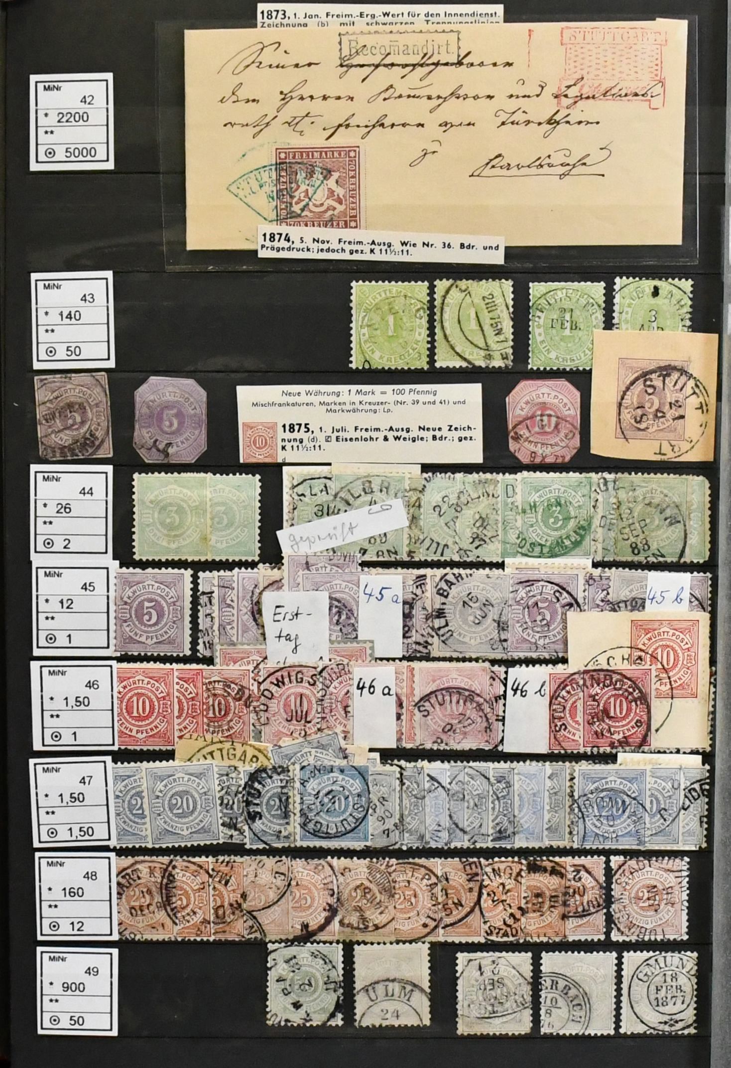 Württemberg, teils hübsch spezialisierte Slg., mit einigen Belegen aufgelockert, dabei auch bessere Stempel (alle unberechnet) und Besonderheiten wie zwei Briefe mit Retourmarken (auch unberechnet), ab Nr. 1a-c, letztere gepr. (Mi. 940,-), Nr. 2 mit teils geprüften Typen, 3a/b, 4a, c 15a ND ungebr. (Mi. 750,-), 16ya ungebr. (mit Hälfte Falz gerechnet, 650,-), 16yb gepr. Prachtbriefstück, 18ya ungebr. (500,-), 19xa, 19yb auf Brief, 20y auf Bfst. (2500,-), 24 (900,-), 26a-c, 27a, c, 28a-d, 29, 33a/b, 35a, Eirund einmal farbig gest., 37a/b, 39b auf Auslandsbrief, 40a/b, sowie aus der Pfennigzeit u.a. zwei Paare Nr. 49 gest. (800,-), Nr. 52, 53a/b. Mi. über 13.000,-