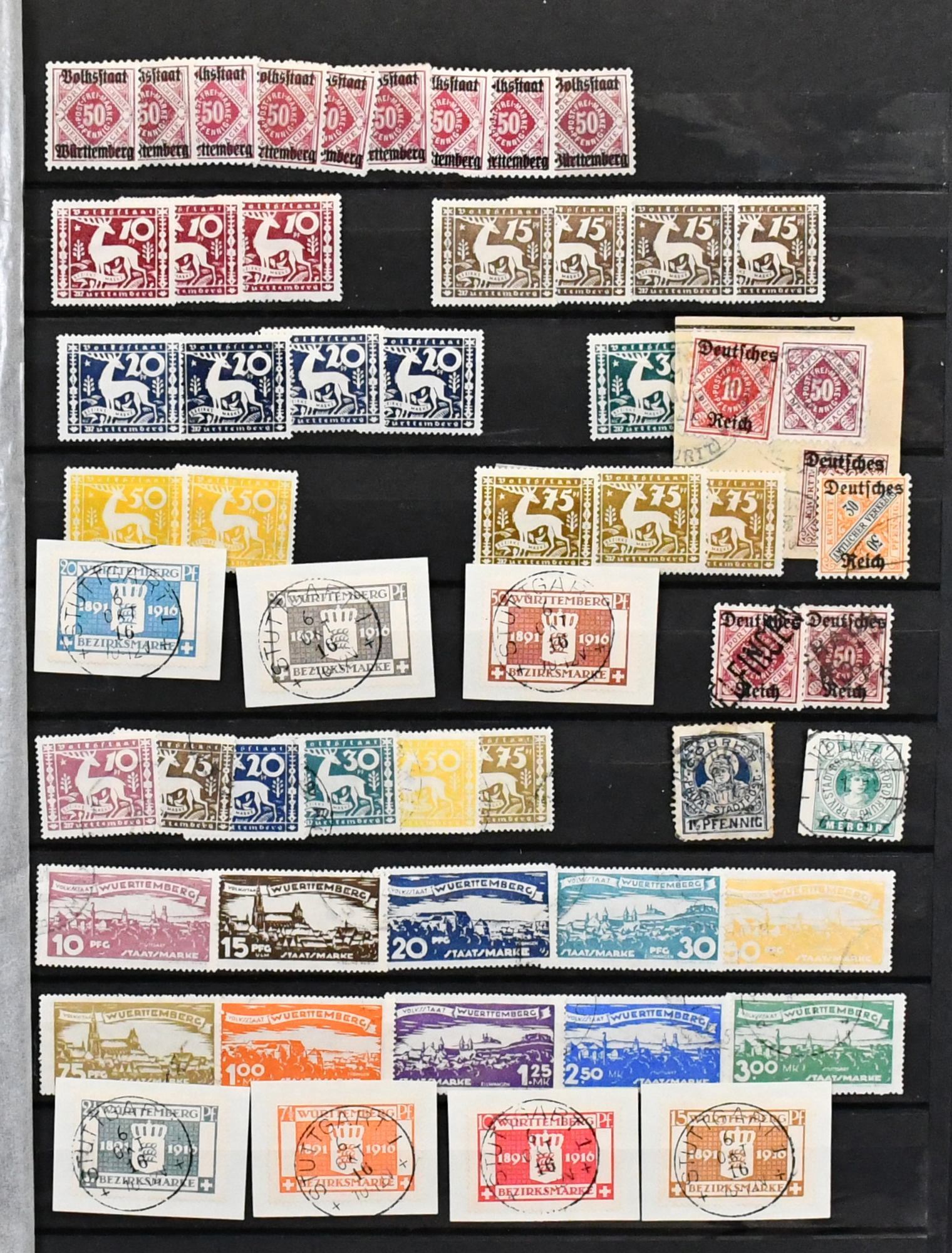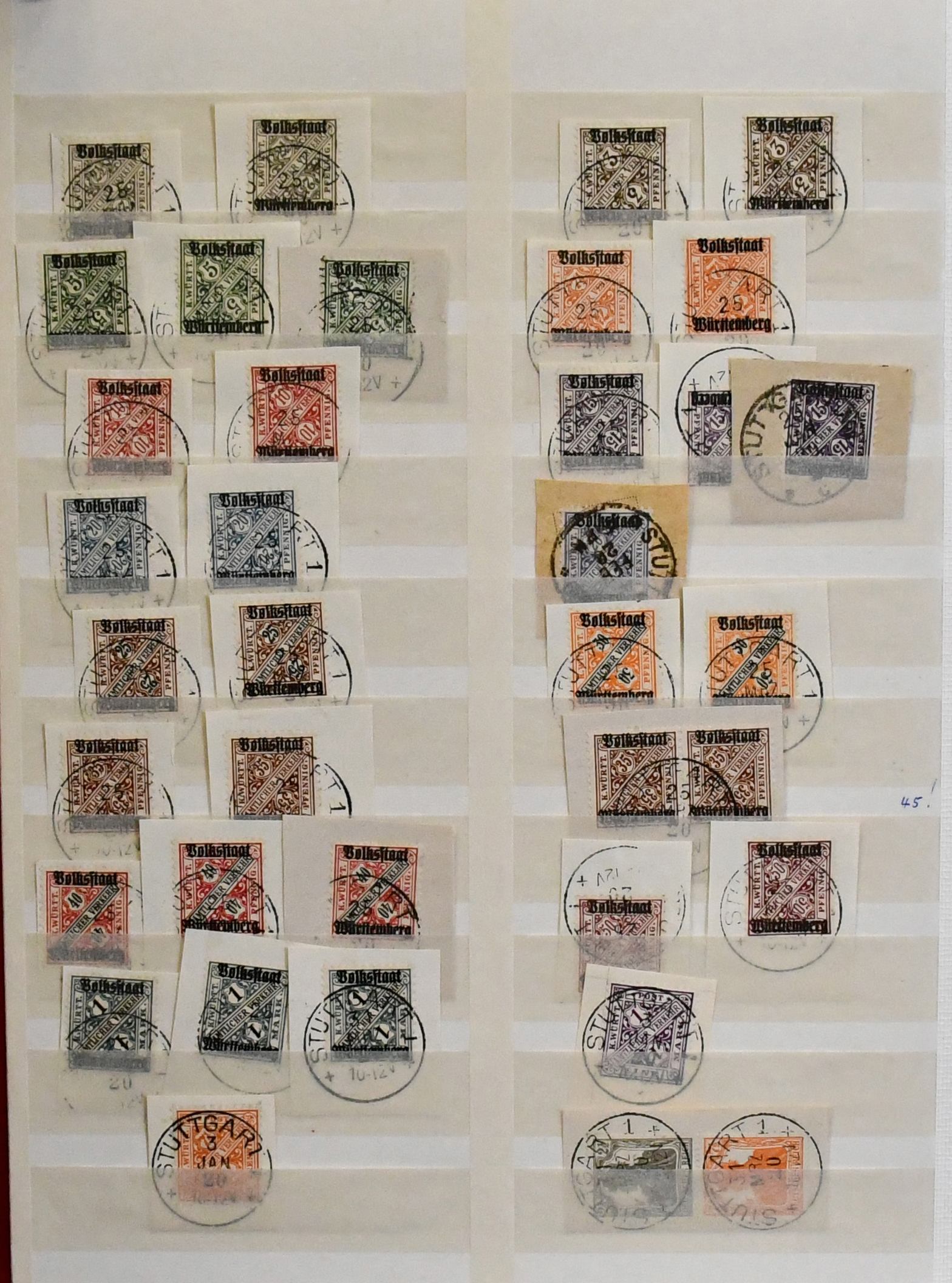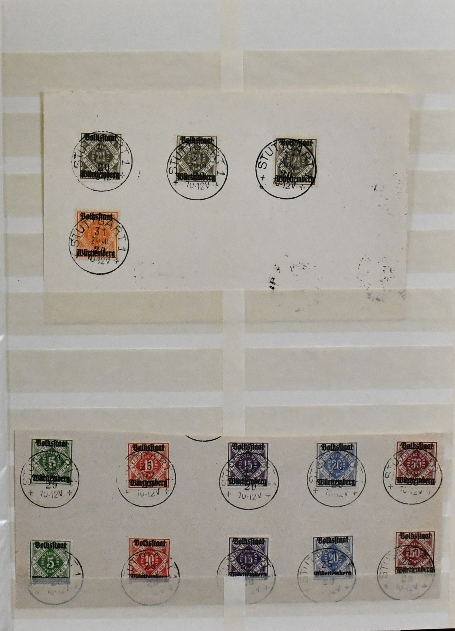 Württemberg, teils hübsch spezialisierte Slg., mit einigen Belegen aufgelockert, dabei auch bessere Stempel (alle unberechnet) und Besonderheiten wie zwei Briefe mit Retourmarken (auch unberechnet), ab Nr. 1a-c, letztere gepr. (Mi. 940,-), Nr. 2 mit teils geprüften Typen, 3a/b, 4a, c 15a ND ungebr. (Mi. 750,-), 16ya ungebr. (mit Hälfte Falz gerechnet, 650,-), 16yb gepr. Prachtbriefstück, 18ya ungebr. (500,-), 19xa, 19yb auf Brief, 20y auf Bfst. (2500,-), 24 (900,-), 26a-c, 27a, c, 28a-d, 29, 33a/b, 35a, Eirund einmal farbig gest., 37a/b, 39b auf Auslandsbrief, 40a/b, sowie aus der Pfennigzeit u.a. zwei Paare Nr. 49 gest. (800,-), Nr. 52, 53a/b. Mi. über 13.000,-