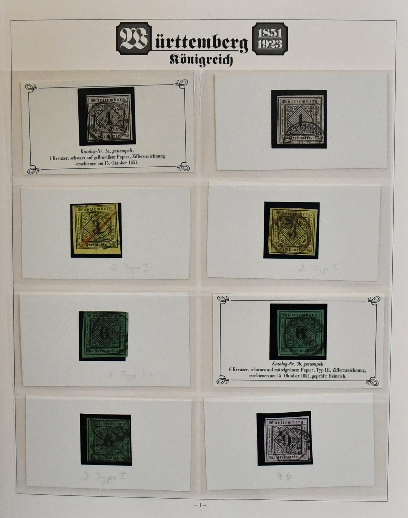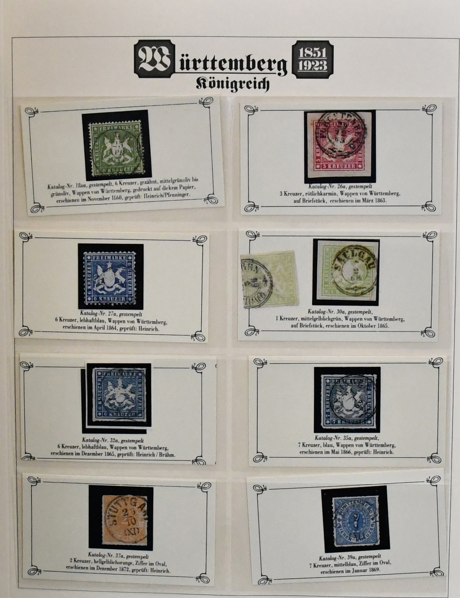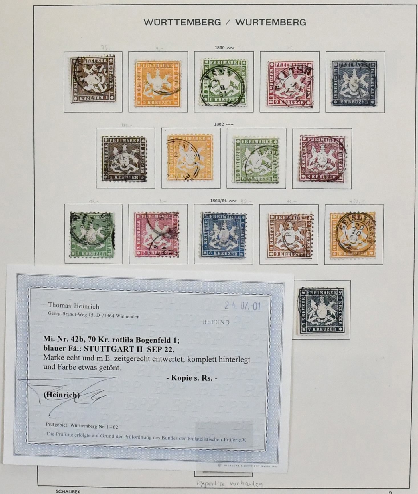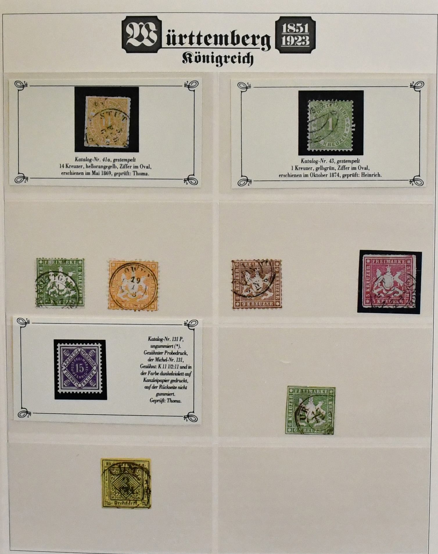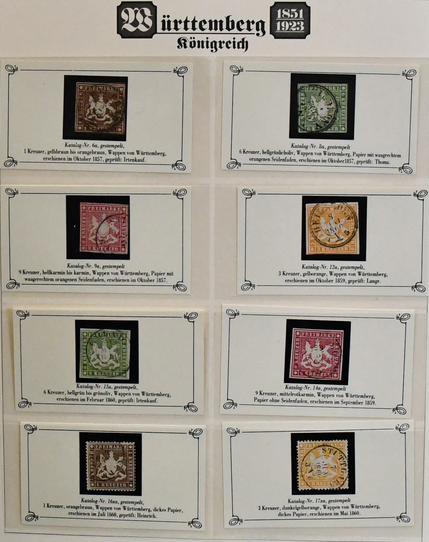 Württemberg, überwiegend gestempelte Sammlung in meist guter Erhaltung auf Albumseiten, dabei ein sehr gehaltvoller Kreuzerteil mit tiefst gepr. Werten wie z.B. Nr. 1b (gepr. Irtenkauf), 2d mit L2 "Sulz" (gepr. Irtenkauf), 4a vom linken Bogenrand, 4c, 5, 6, 9, 11 breitrandig auf Briefstück, 13(3), 14(2), 19x, 19y, 28, 34 auf Briefstück (Fotoexp. Thoma "tadellose frische Marke"), Nr. 35 mit interessanten Druckzufälligkeiten, 37, 41(3) usw. Auch der Pfennigteil mit viel Material. Interessante Qualitätssammlung mit hohem KW