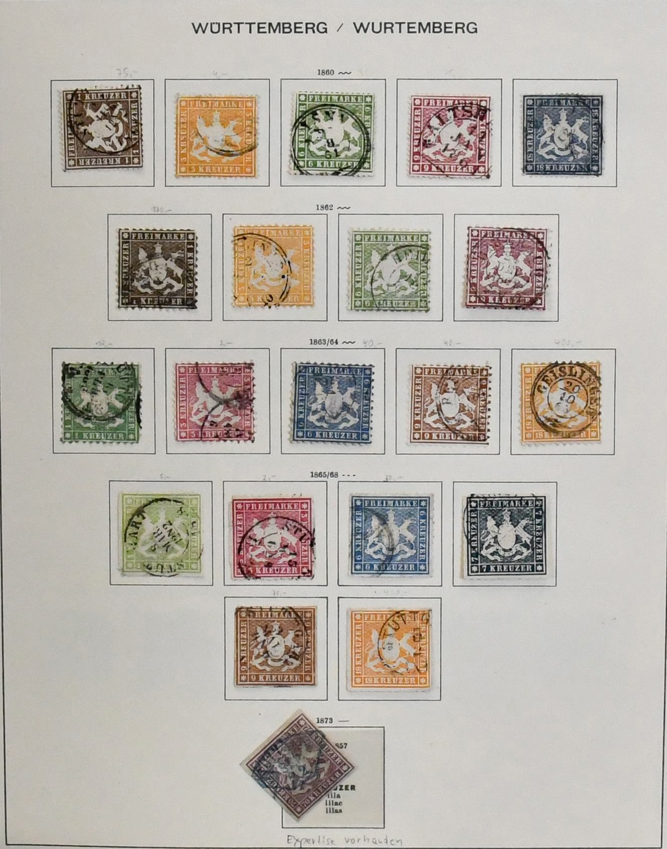 Württemberg, saubere Sammlung in oft sehr guter Erhaltung auf alten Albumseiten, dabei der Kreuzerteil gut besetzt mit Nr. 1a(3), 1c gepr. Thoma, 2d gepr. Irtenkauf, 3a, 4a(2), 5 per zwei (je breitrandig, einmal in der guten blauen Stempelfarbe und einmal sign. Müller-Mark), 6-9, 11-14, 16y, 22-23, 28(2), 34, 37(2), 40(3), 41(3) usw. Auch im Pfennigteil gute Marken wie z.B. Nr. 48(2), 49, 58, 107-11 gest., 188 gest. (Zahnfehler, aber vermutl. echt gest., unberechnet), 207, 226 gest. usw. Interessantes Objekt mit sehr hohem KW