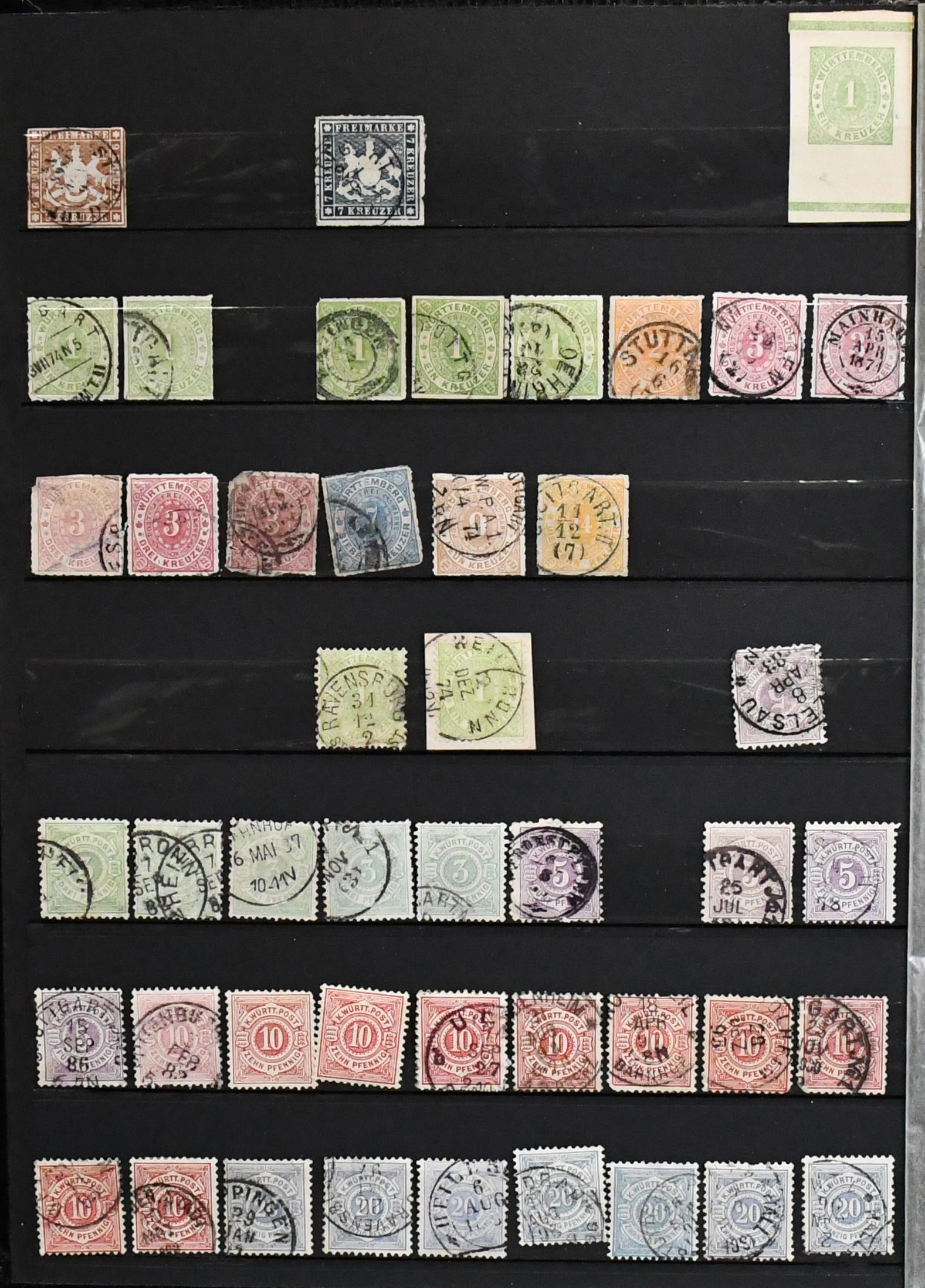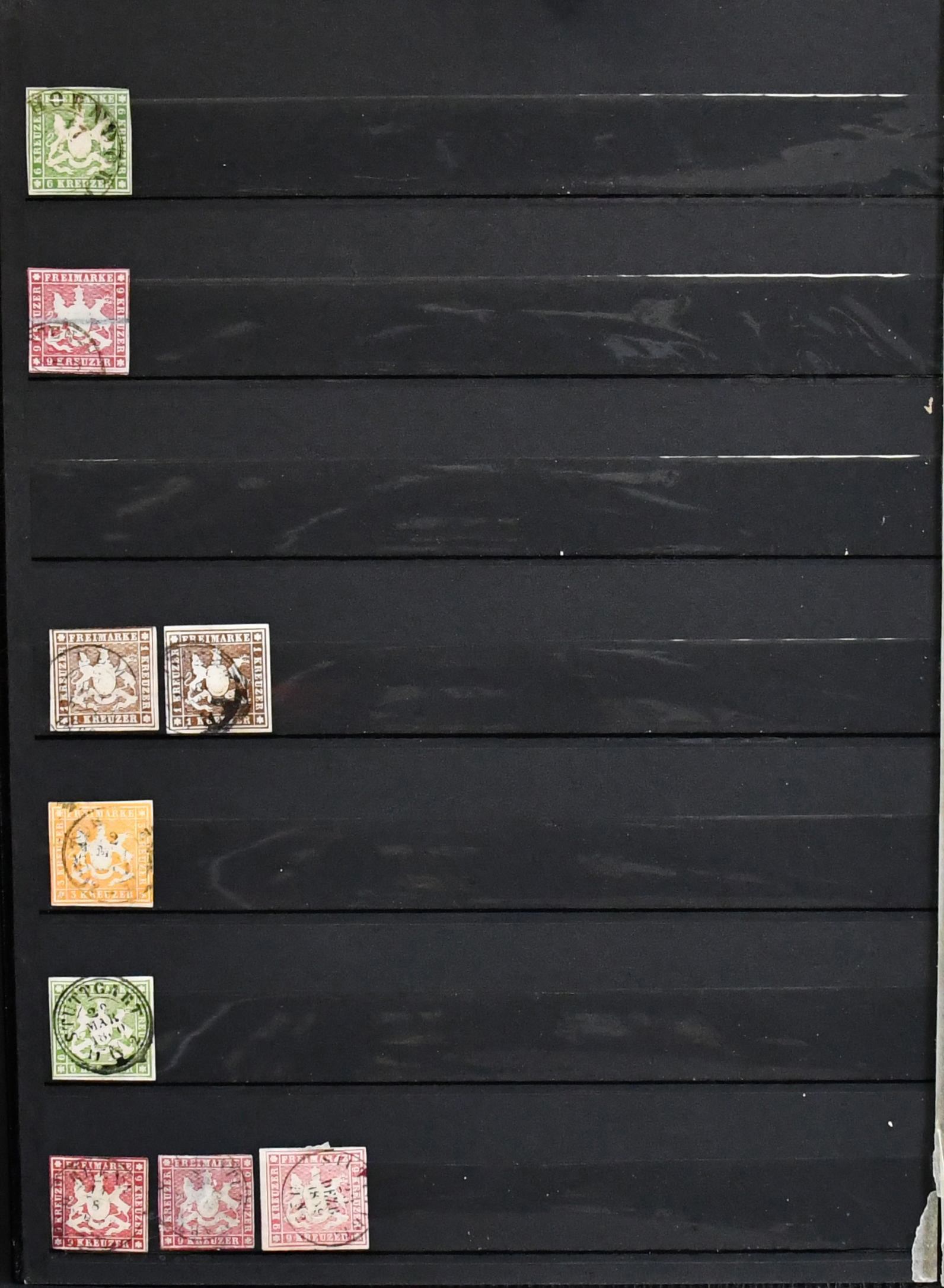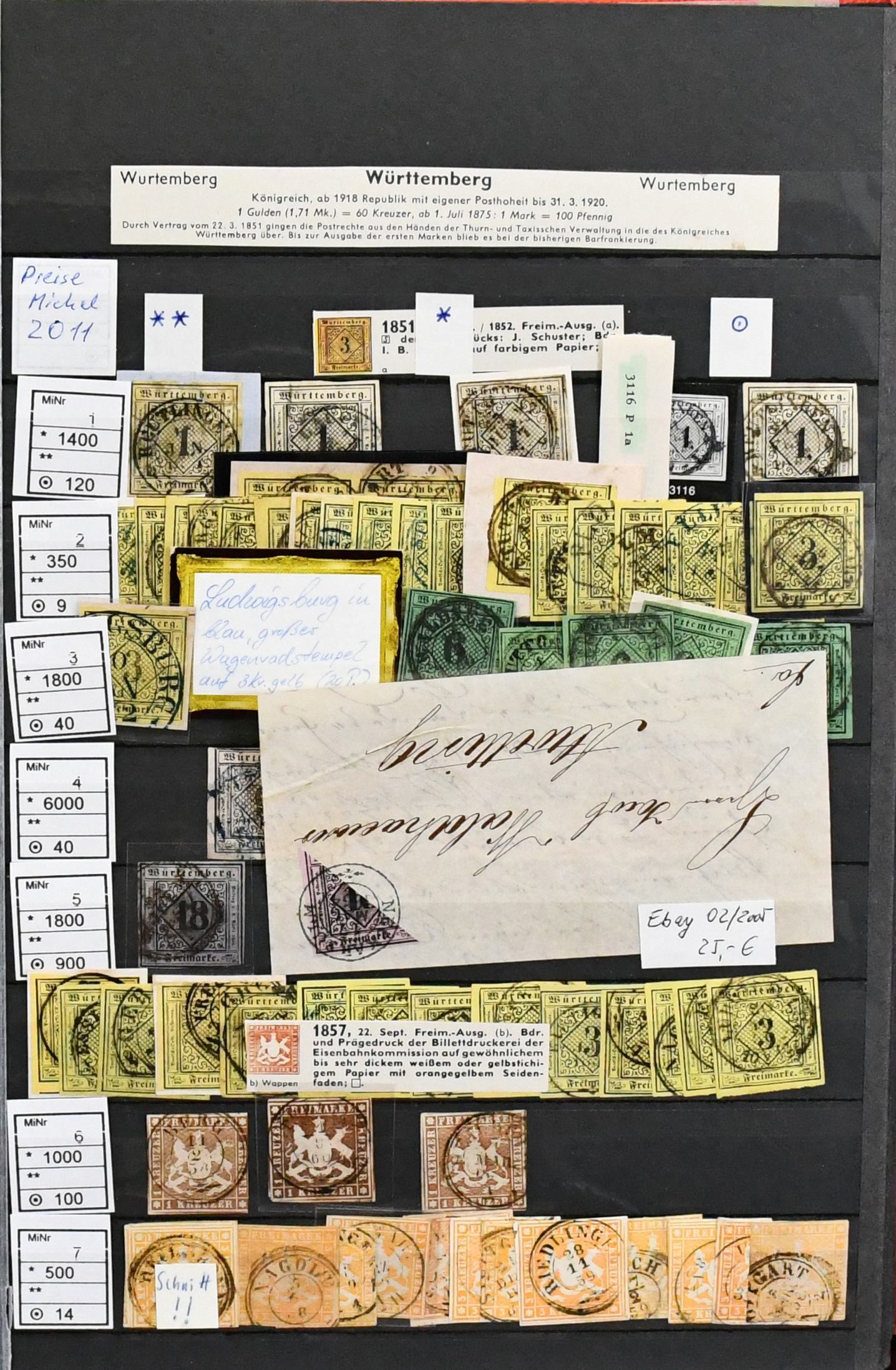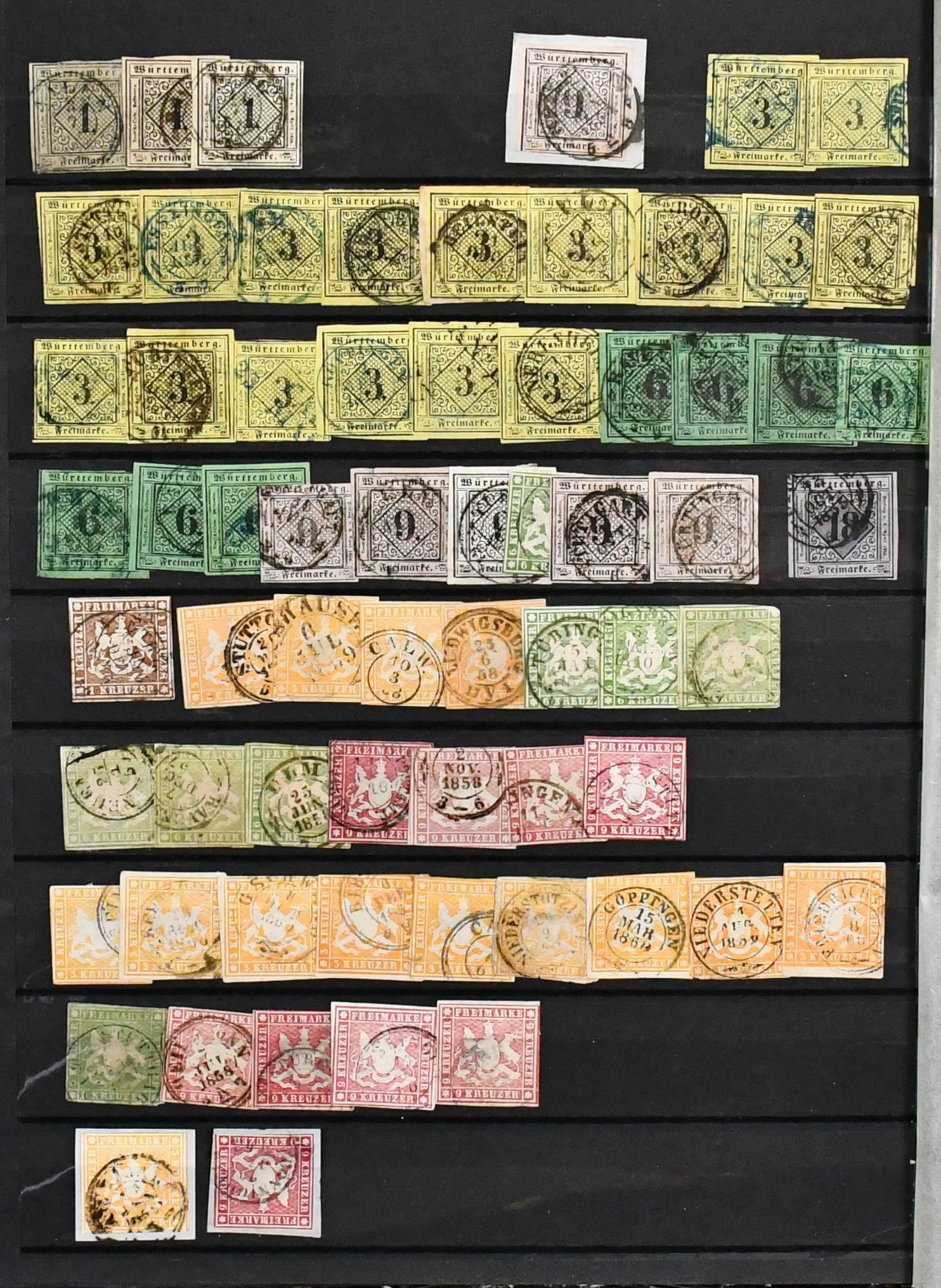 Württemberg, alter Bestand in sehr untersch. Erhaltung mit einigen hundert Werten, dabei 136 Kreuzer-Werte ab Nr. 1(2), mit Nr. 3(6), 6(2), 16(3), 24, 29, 33(5), 35(4), wodurch sich alleine ein hoher Katalogwert ergibt, plus die Pfennigzeit danach