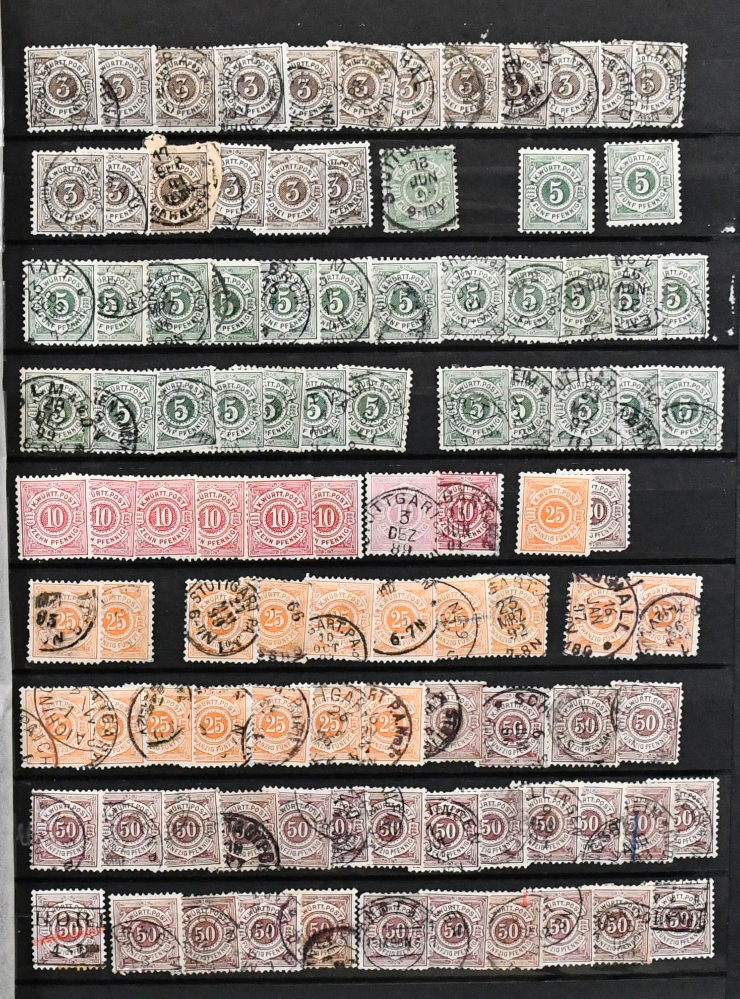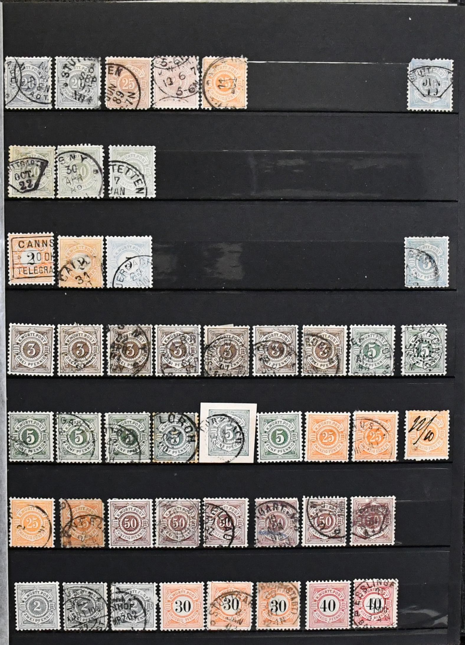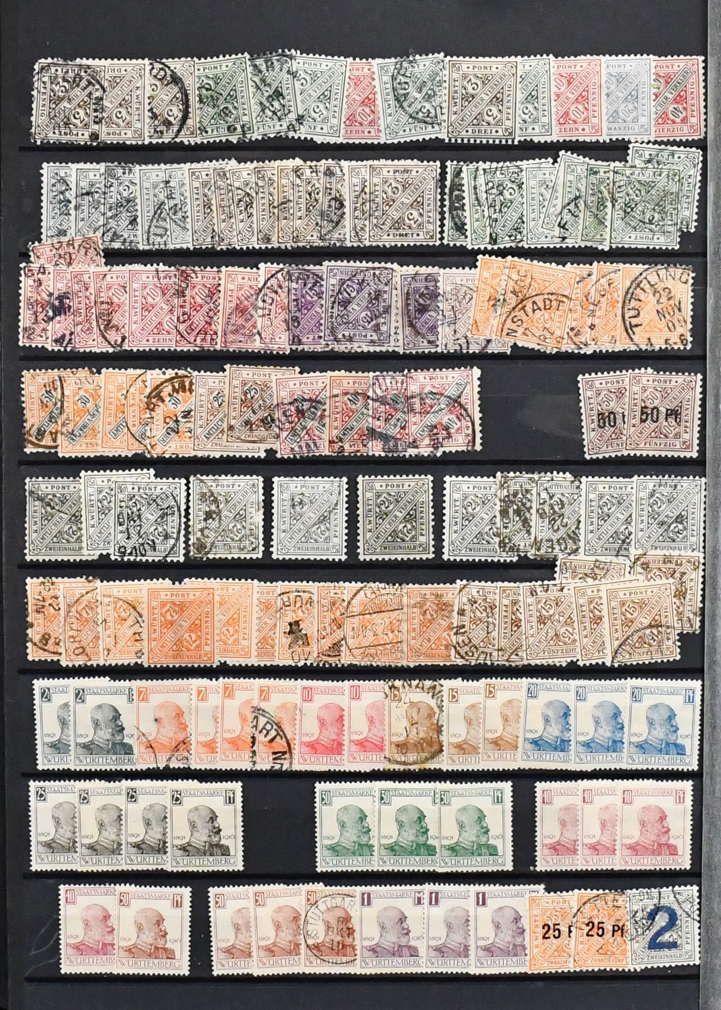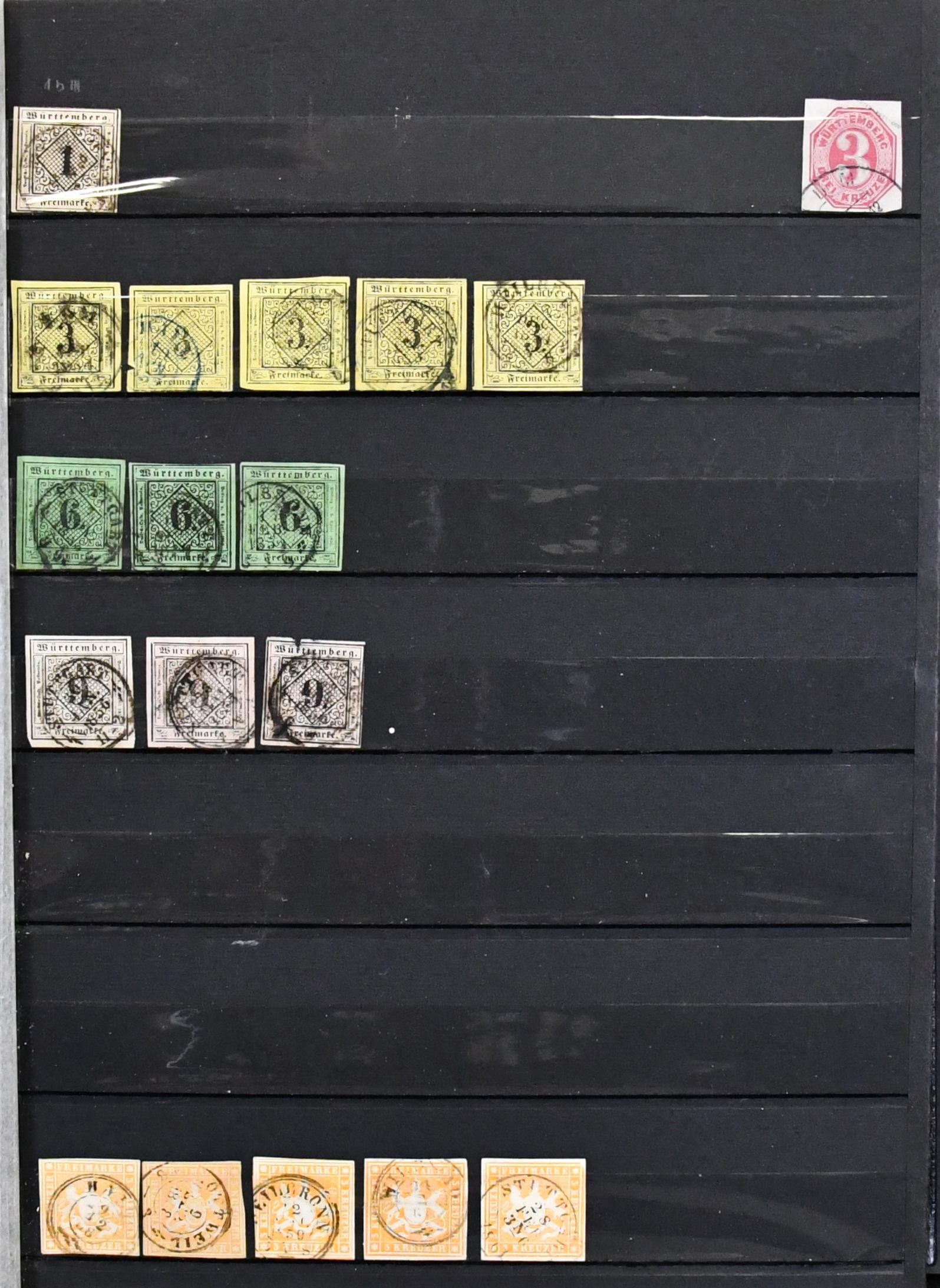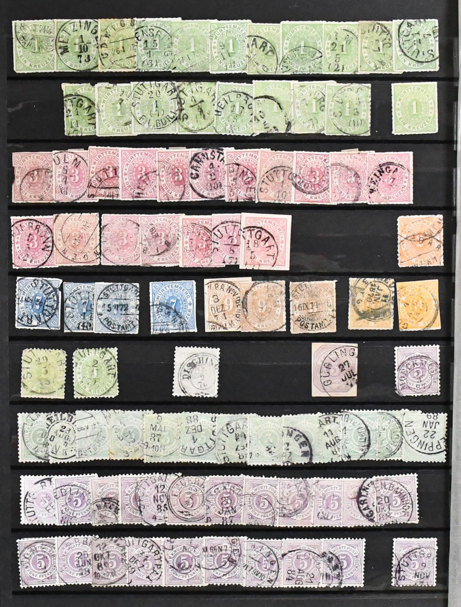 Württemberg, alter Bestand in sehr untersch. Erhaltung mit einigen hundert Werten, dabei 136 Kreuzer-Werte ab Nr. 1(2), mit Nr. 3(6), 6(2), 16(3), 24, 29, 33(5), 35(4), wodurch sich alleine ein hoher Katalogwert ergibt, plus die Pfennigzeit danach