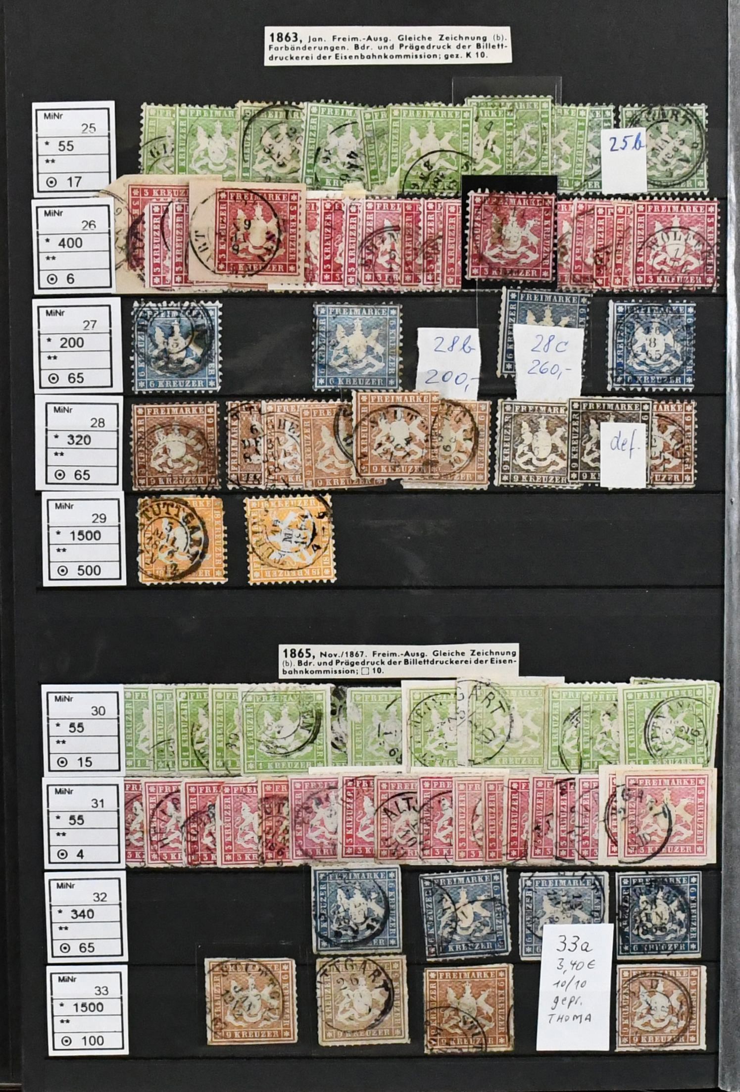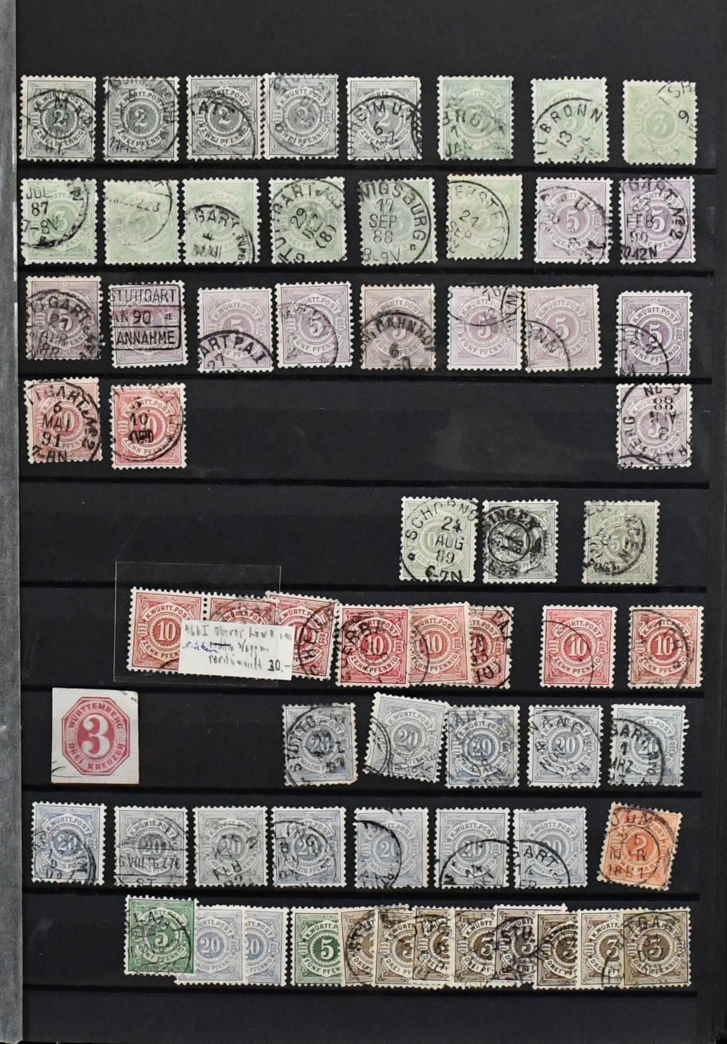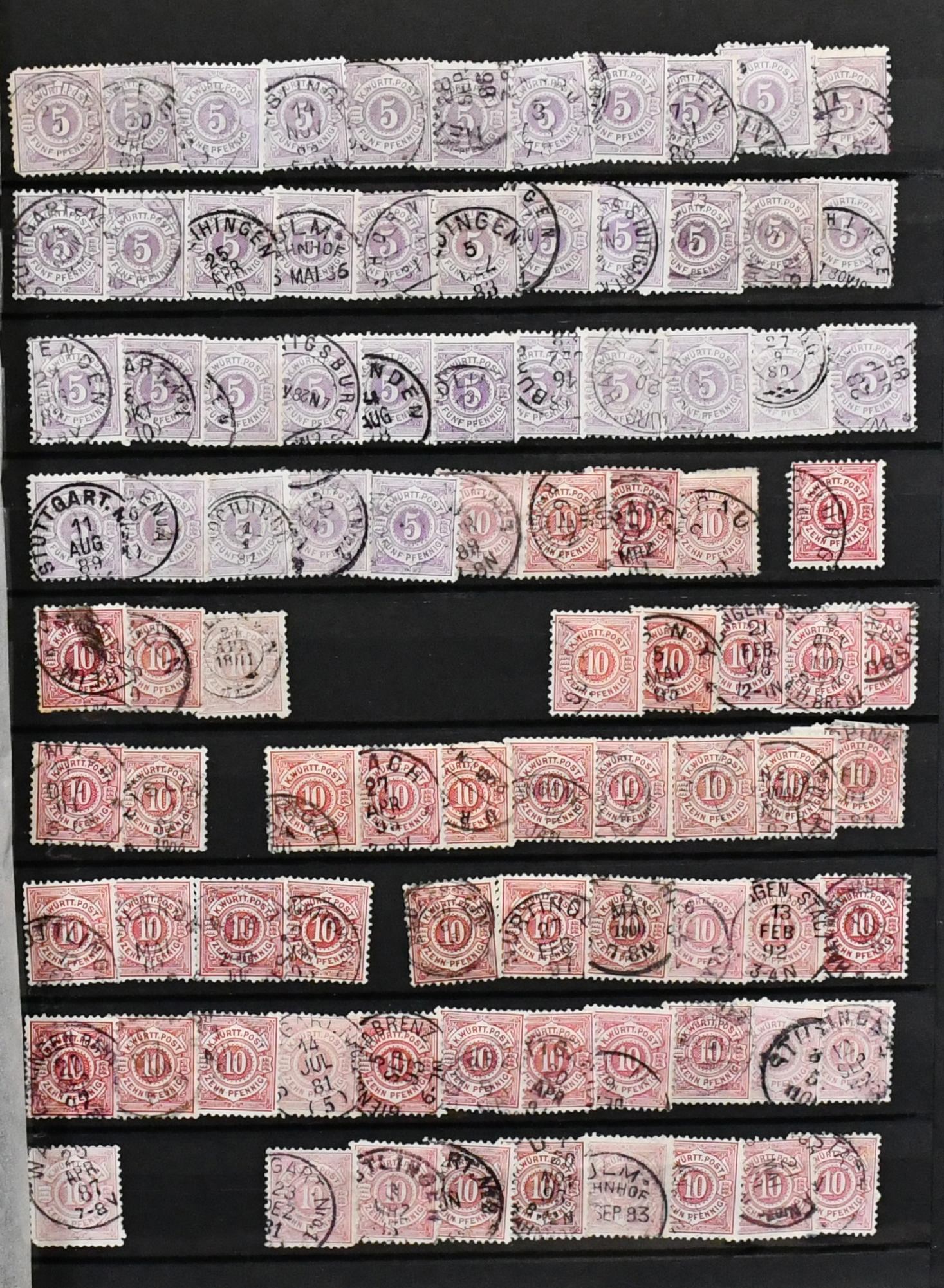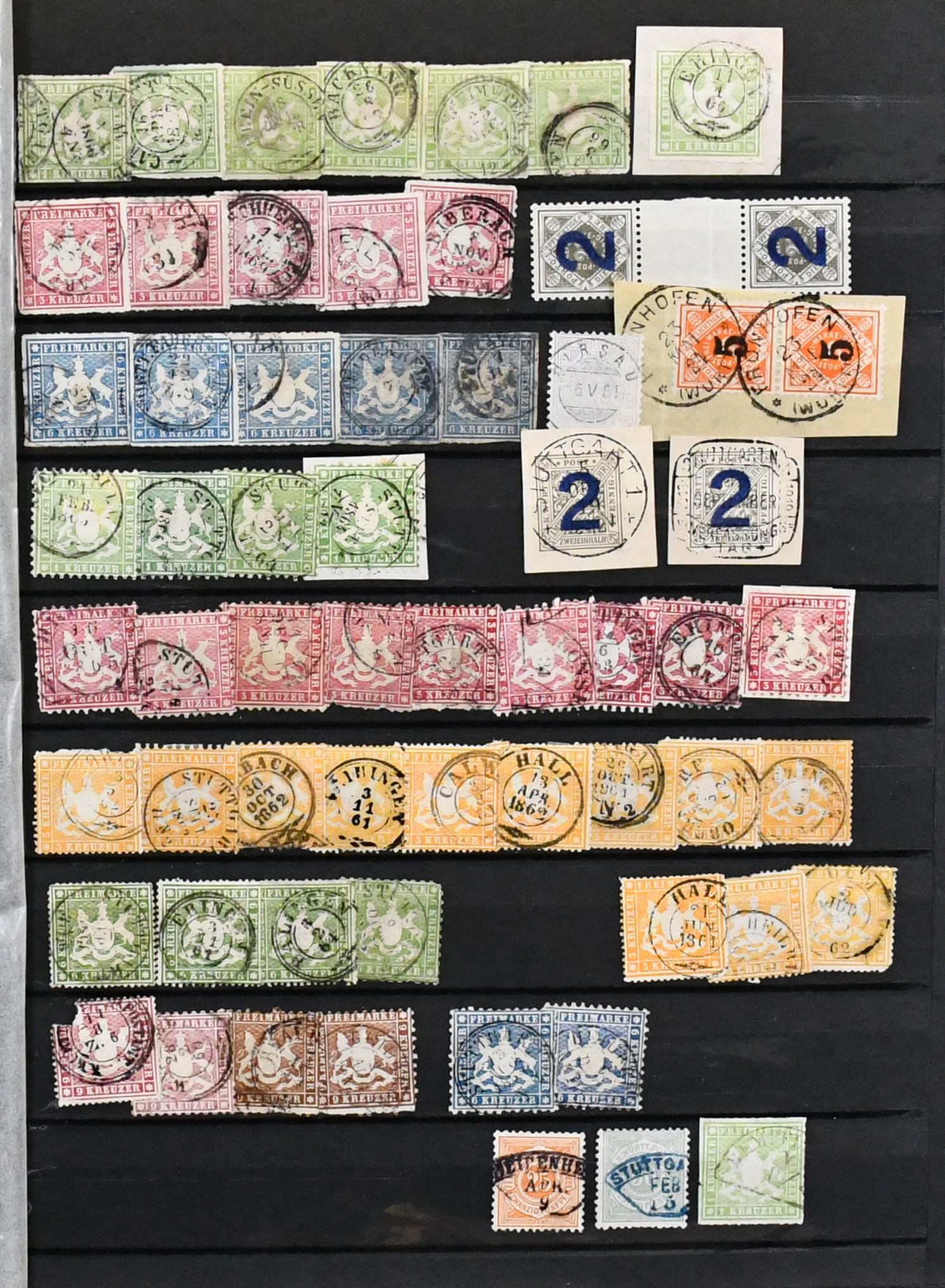 Württemberg, alter Bestand in sehr untersch. Erhaltung mit einigen hundert Werten, dabei 136 Kreuzer-Werte ab Nr. 1(2), mit Nr. 3(6), 6(2), 16(3), 24, 29, 33(5), 35(4), wodurch sich alleine ein hoher Katalogwert ergibt, plus die Pfennigzeit danach