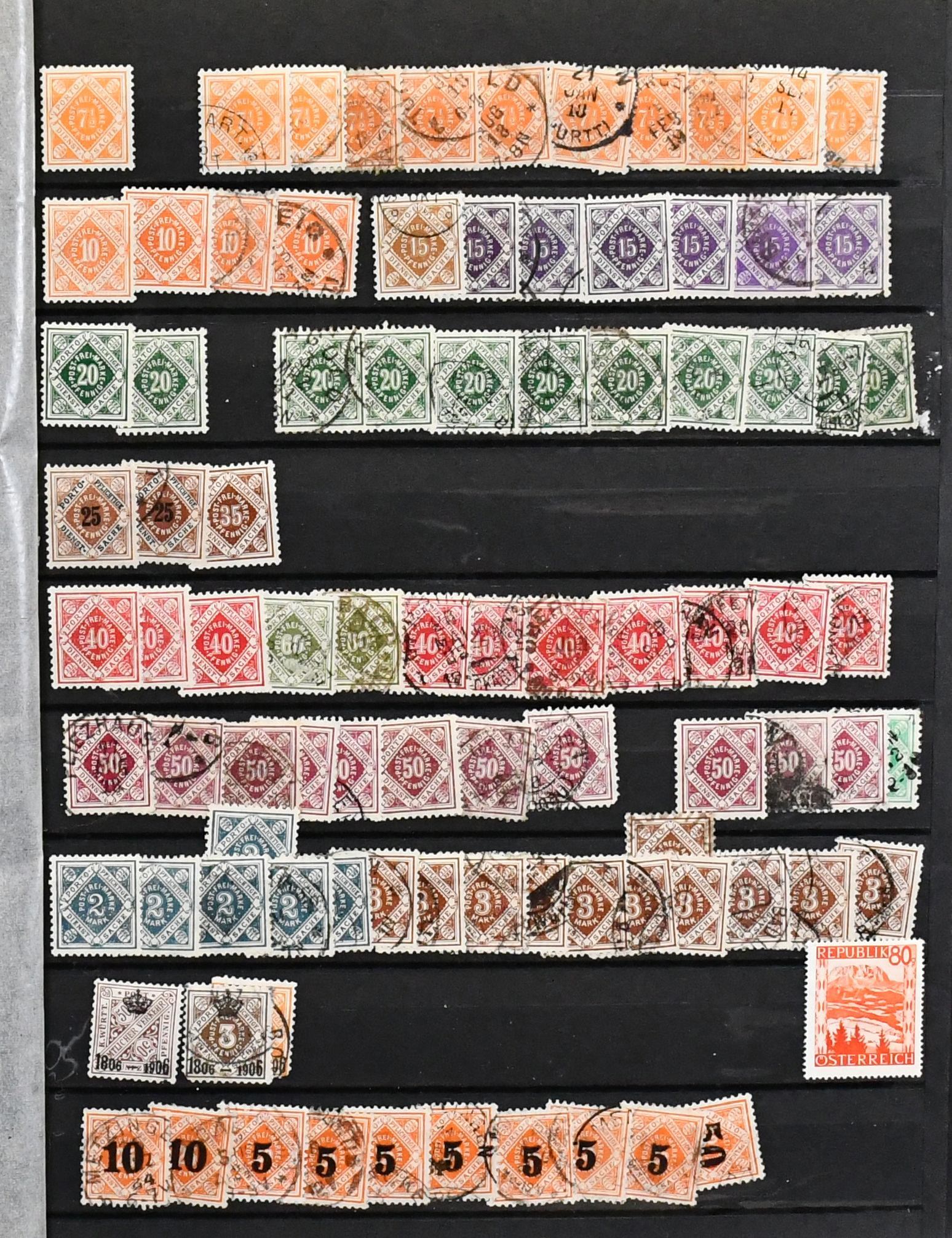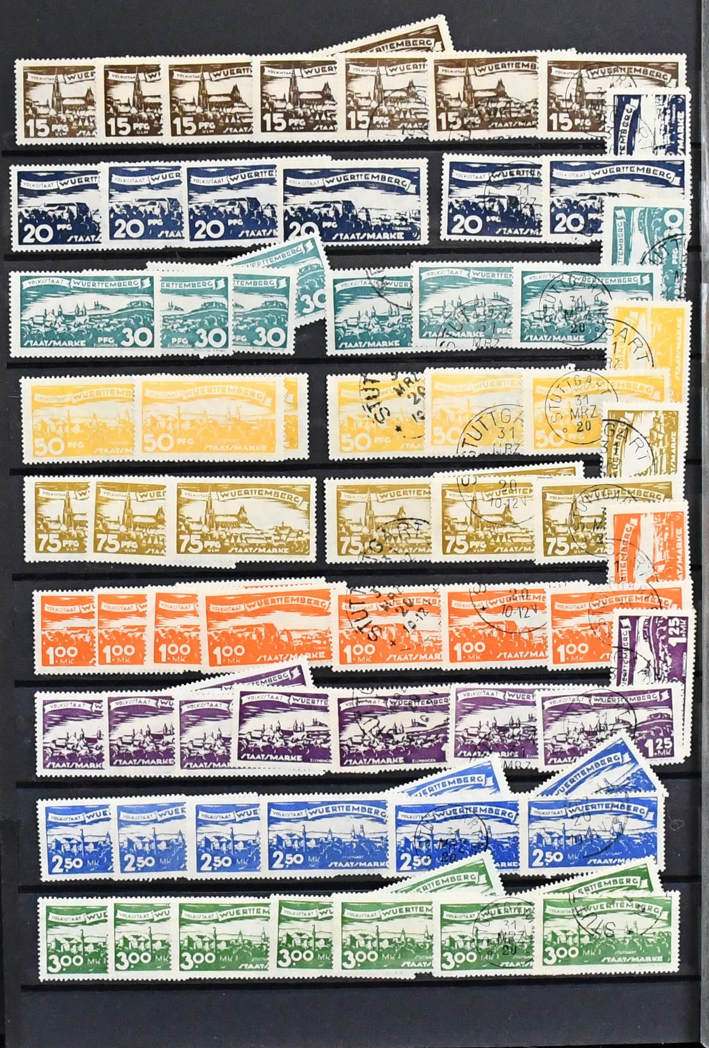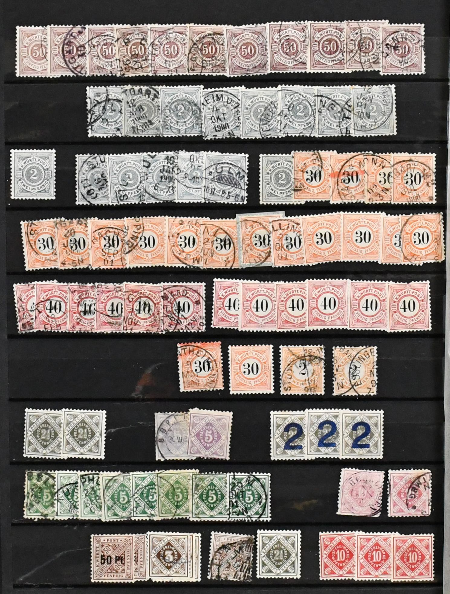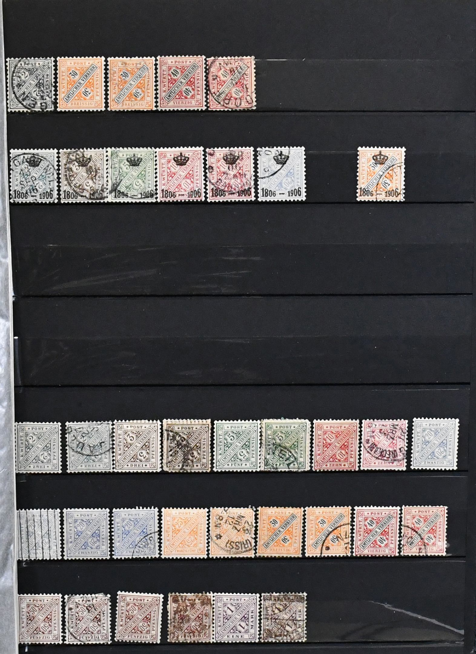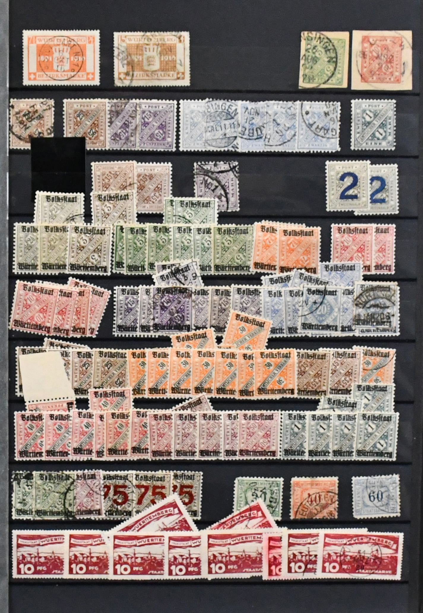 Württemberg, alter Bestand in sehr untersch. Erhaltung mit einigen hundert Werten, dabei 136 Kreuzer-Werte ab Nr. 1(2), mit Nr. 3(6), 6(2), 16(3), 24, 29, 33(5), 35(4), wodurch sich alleine ein hoher Katalogwert ergibt, plus die Pfennigzeit danach