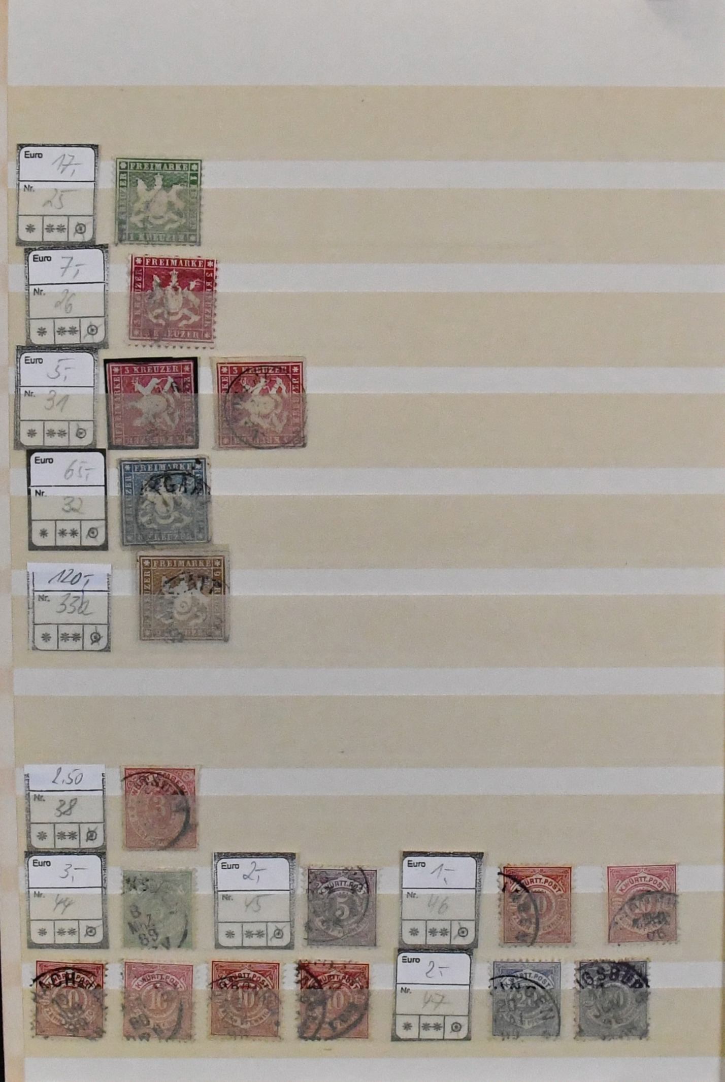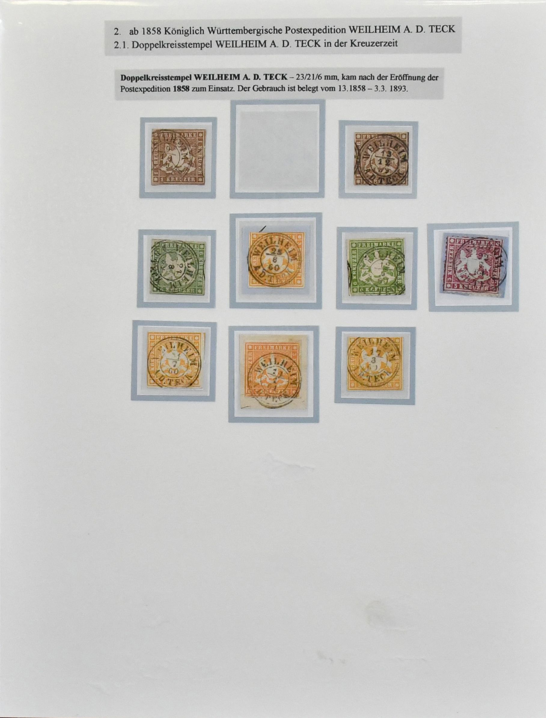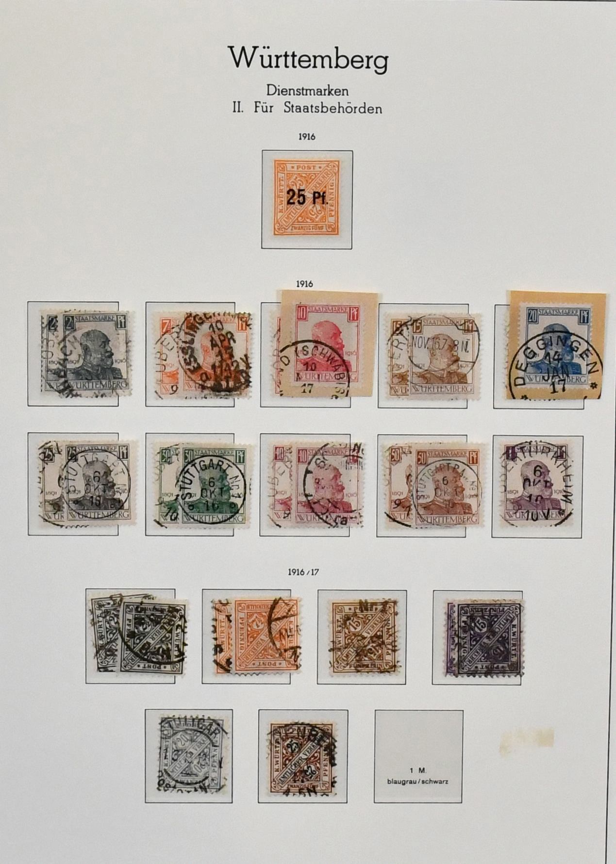 Württemberg, Vordruck-Slg. ab Nr. 1-4, oft mehrfach inkl. Farben, mit vielen mittleren Werten inkl. Nr. 6-9, 11-14, je oft mehrf., 16, 35(2), 34-43 oft mehrfach, sowie Pfennigzeit