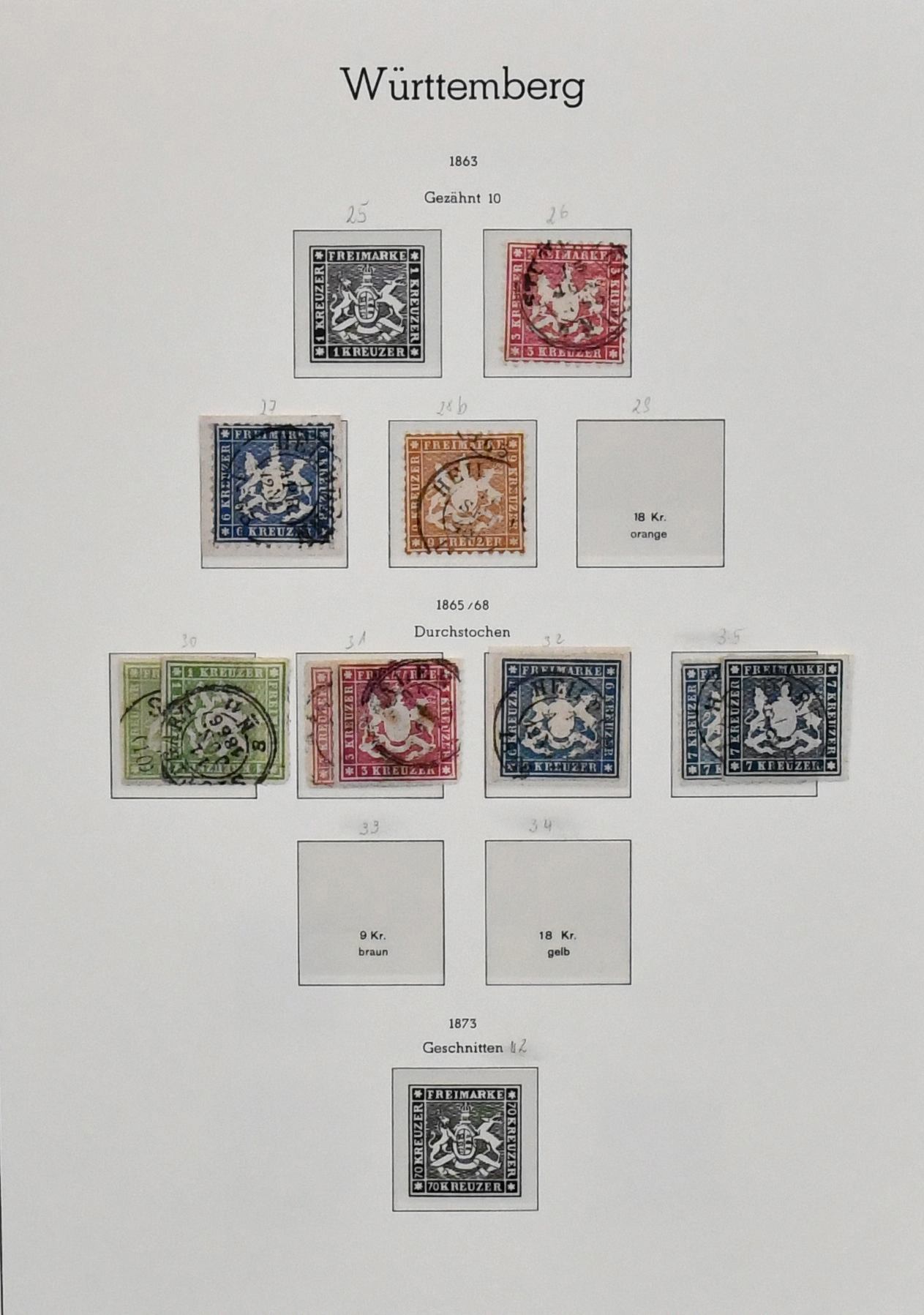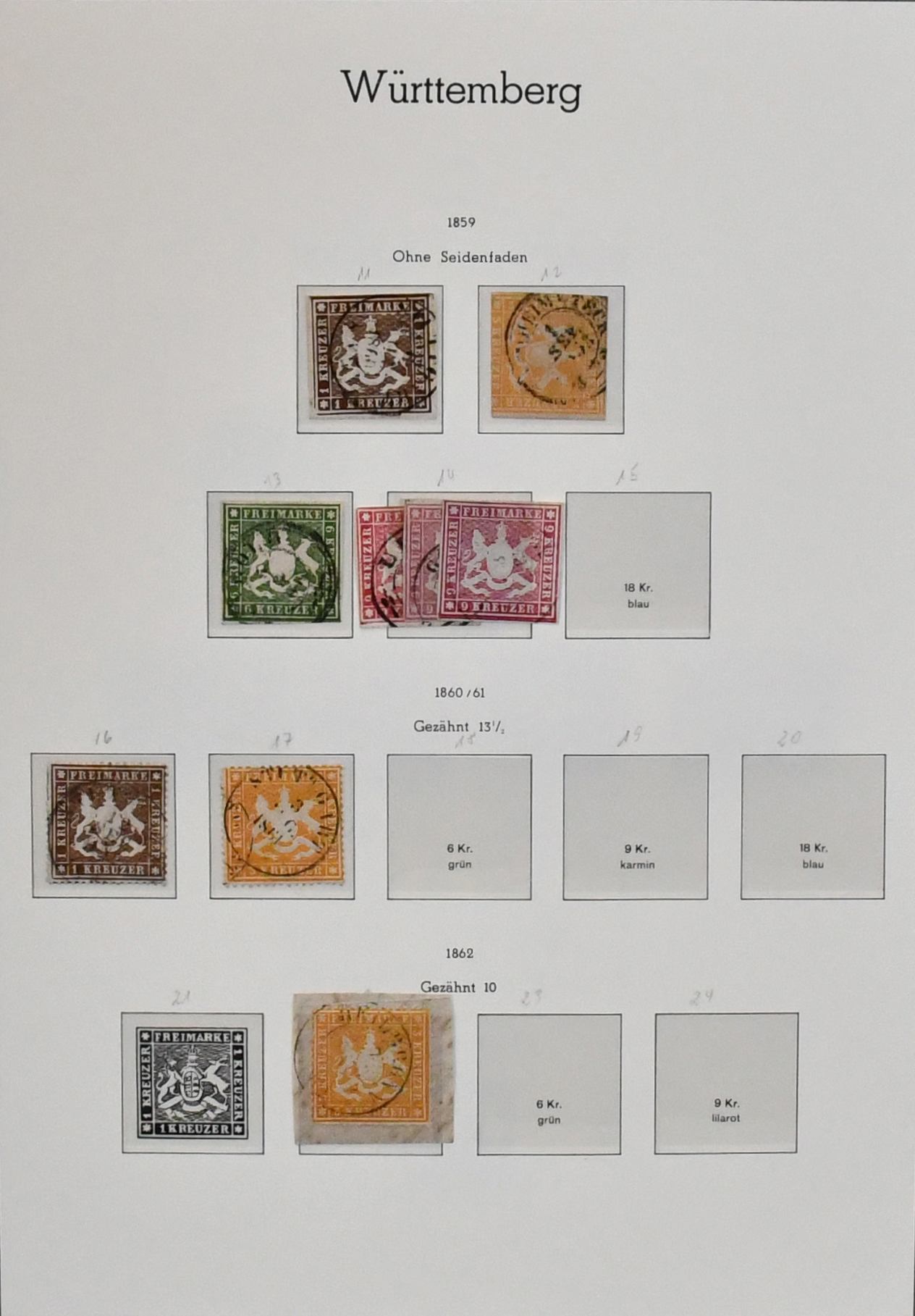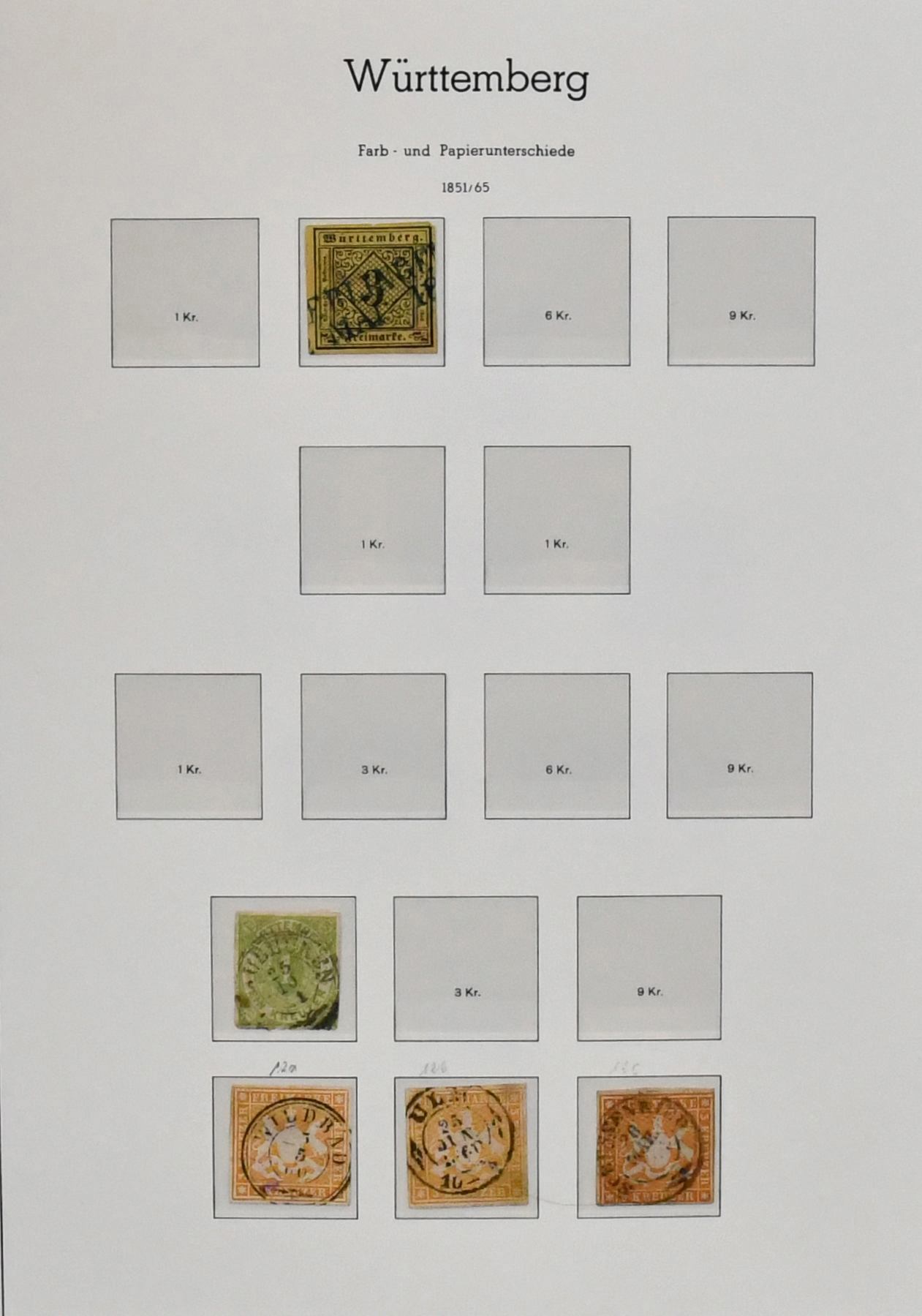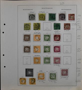 Württemberg, ohne die ganz großen Spitzen relativ kpl. alte Slg. auf Vordrucken, ab Nr. 1-4, dabei seltene Nr. 1c mit Befund Heinrich "Frische Erhaltung", mit Nr. 3a/b, 4b, ferner u.a. 19ya/b, ungebr. Nr. 21, 35b usw. Mi. über 5000,-