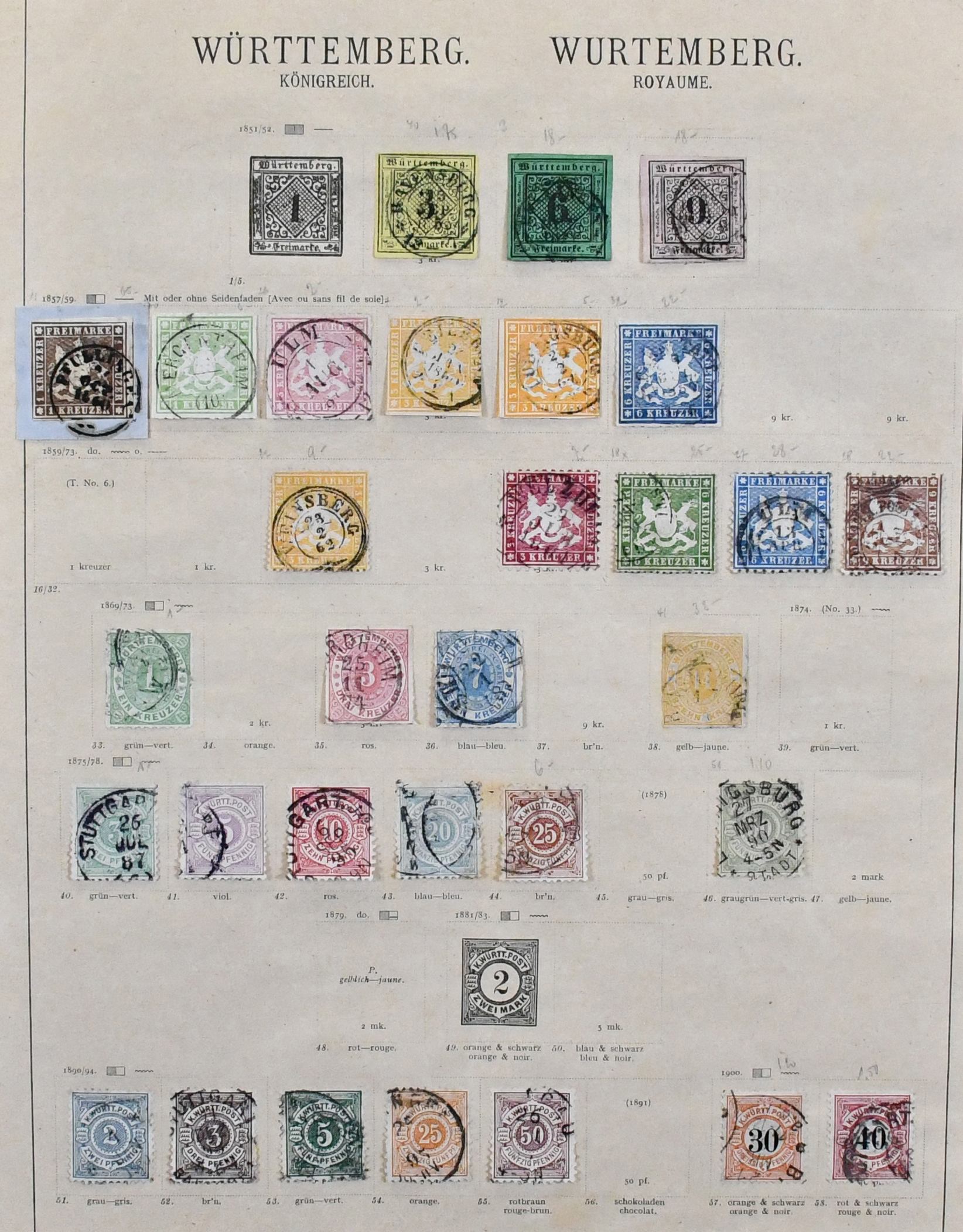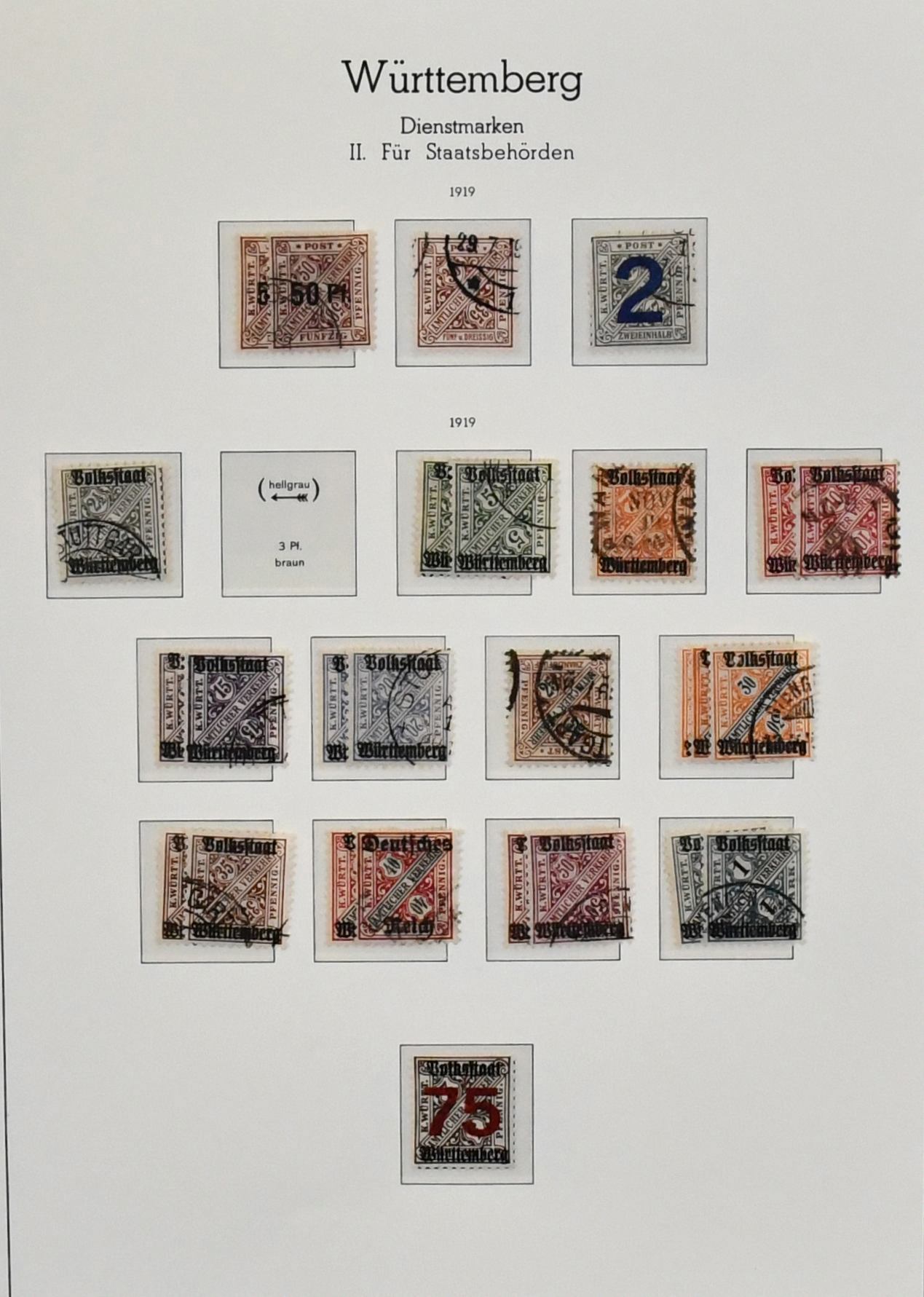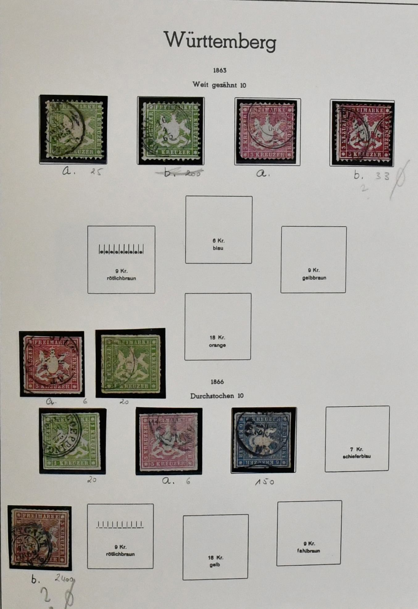 Württemberg, ohne die ganz großen Spitzen relativ kpl. alte Slg. auf Vordrucken, ab Nr. 1-4, dabei seltene Nr. 1c mit Befund Heinrich "Frische Erhaltung", mit Nr. 3a/b, 4b, ferner u.a. 19ya/b, ungebr. Nr. 21, 35b usw. Mi. über 5000,-