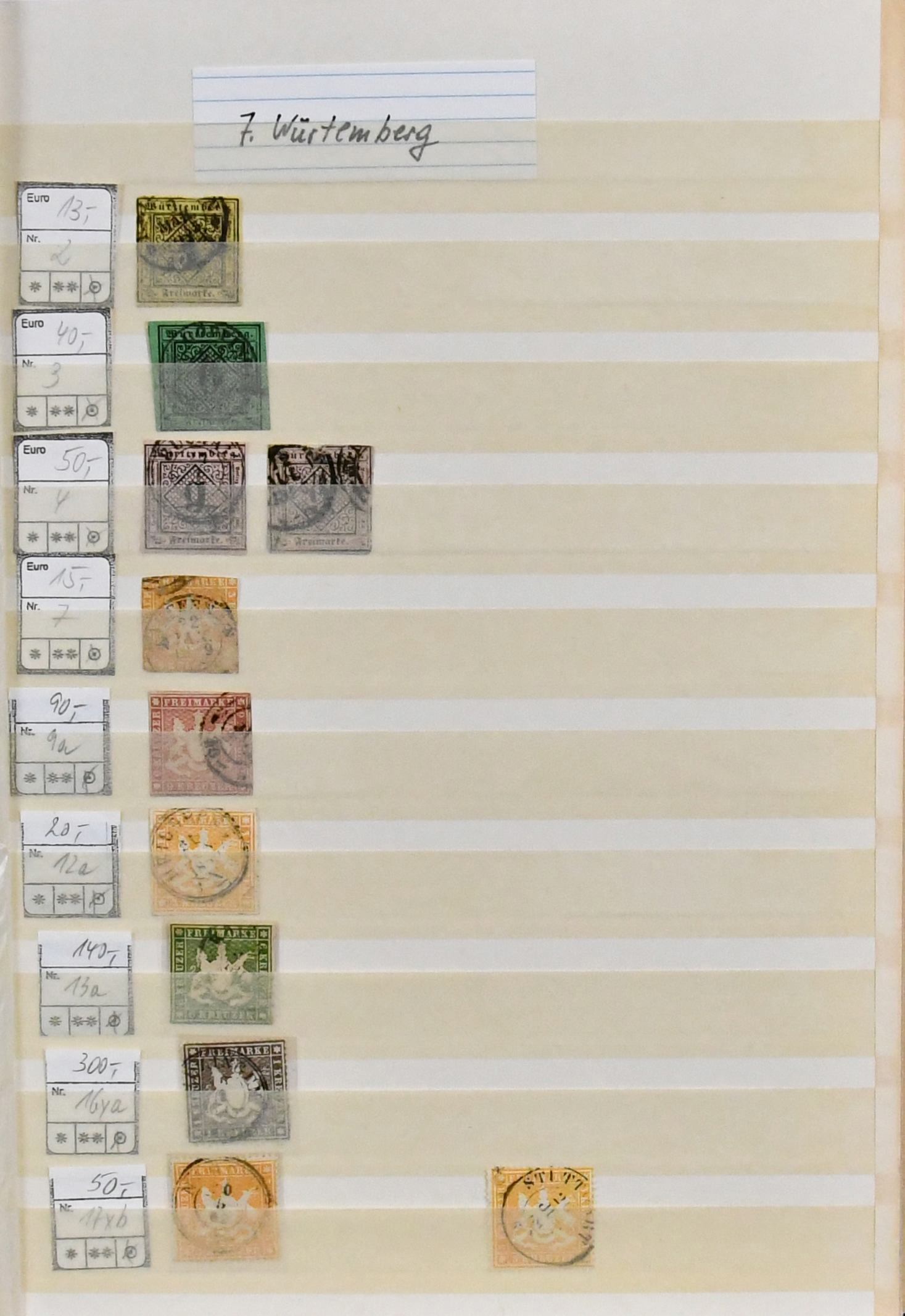 Württemberg, interessante Partie ab Nr. 2 mehrf., inkl. gepr. Nr. 4a/b, 8, 9, 11, 14, 37, 41, sowie die Pfennigzeit mit immer wieder besseren wie Nr. 217-26 (alleine ab 1875 schon rund 1500,- Mi.), günstig!