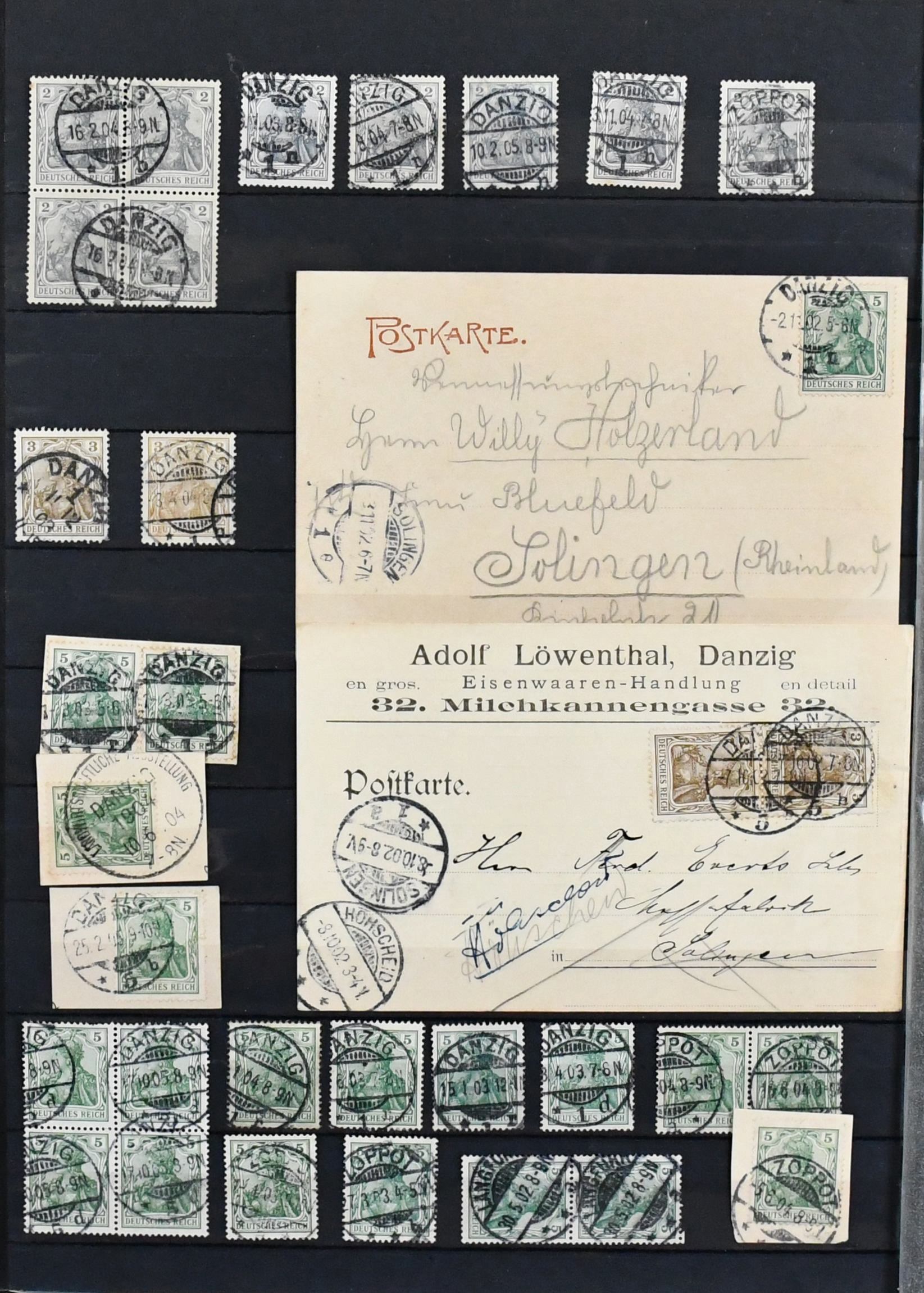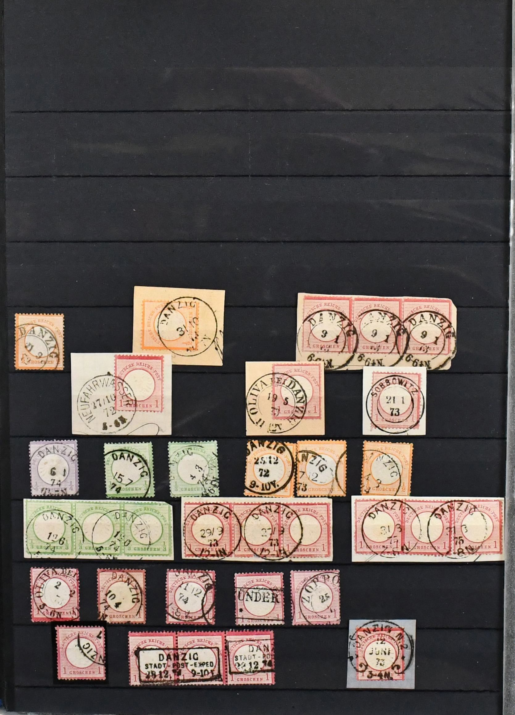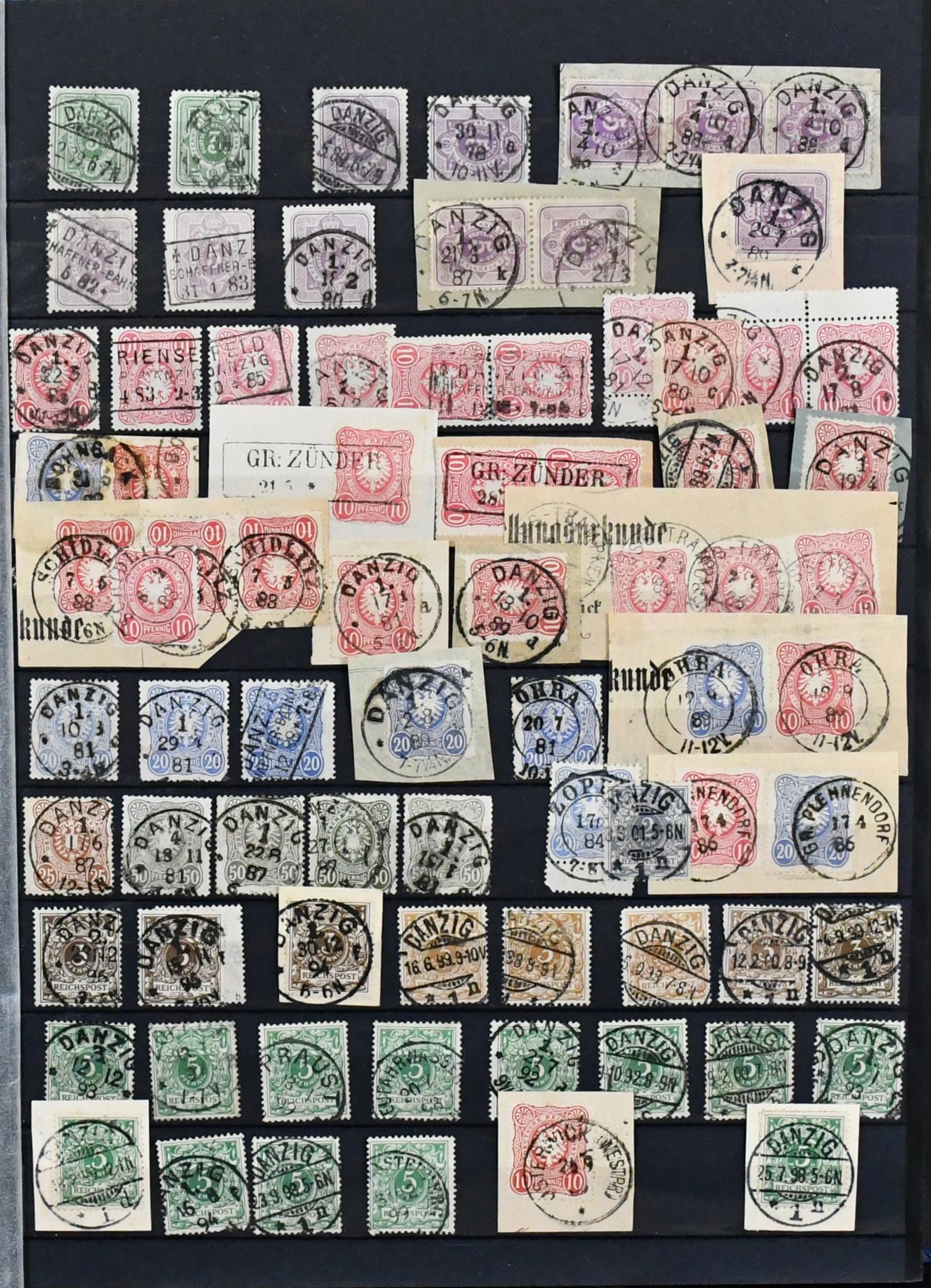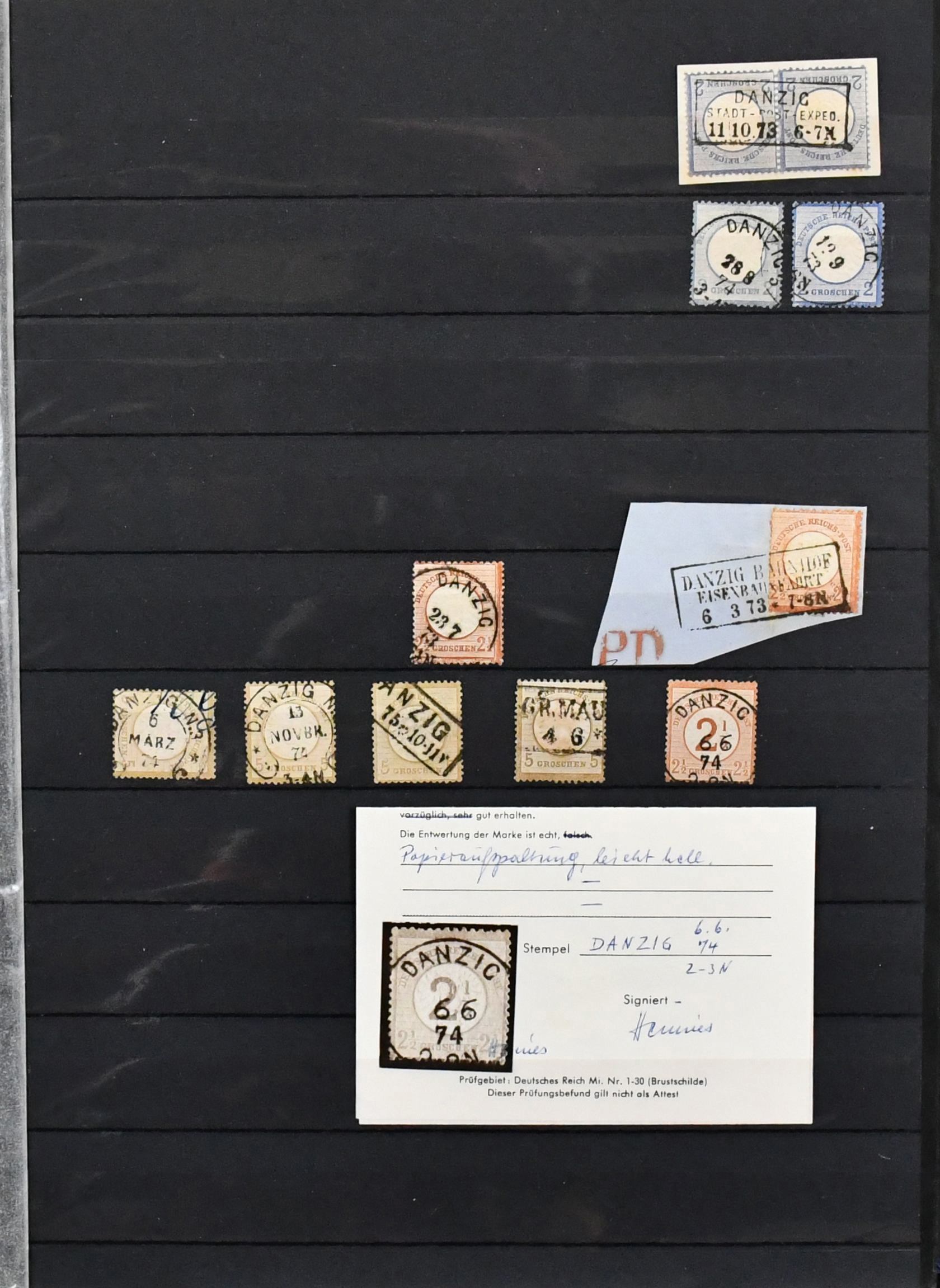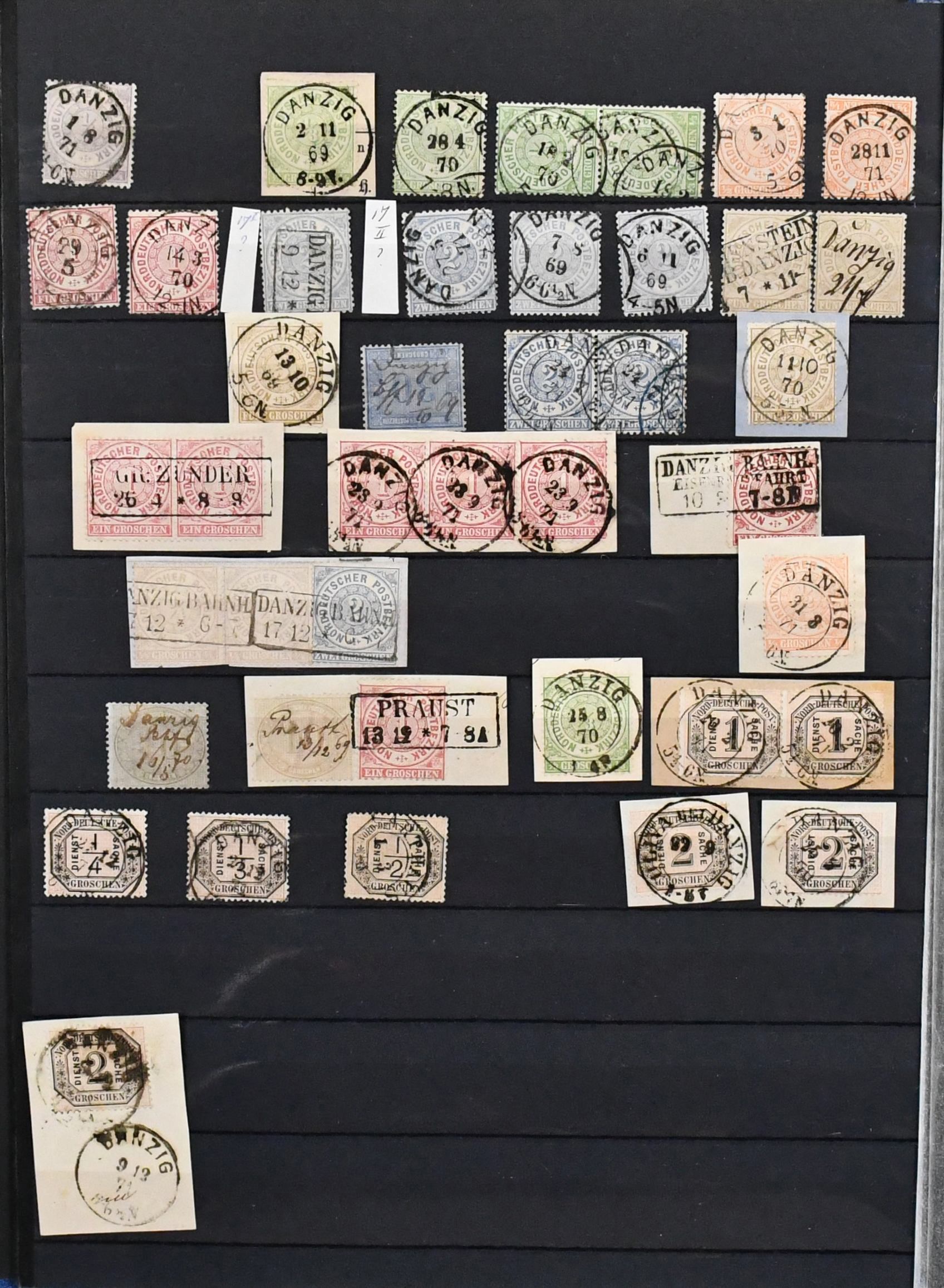 "Danzig"-Entwertungen auf NDP, Brustschilde und Deutsches Reich, Sammlung von versch. Danziger Stempeln, NDP mit 67 Werten (auf Nr. 24/25 natürlich nur handschriftlich), Brustschilde mit über 60 Werten ab Nr. 1, Nr. 12 (tadellos, Befund Sommer) und 13 natürlich nur handschriftlich entwertet, dabei auch gute Hufeisenstempel und bessere Werte, sowie über 400 Werte Deutsches Reich ab 1875 bis 1920 mit Stempeln aus Danzig, alle aufgeführten Bereiche mit vielen Briefstücken (Pfennige auch mit besseren Hufeisenstempeln), dabei auch seltene Vorläufer wie V106 (6, Mi. 600,-), V107-109 teils mehrf. (Mi. 200,-), V111/112 (530,-), guter Teil Bahnpoststempel etc. Günstiger Ausruf