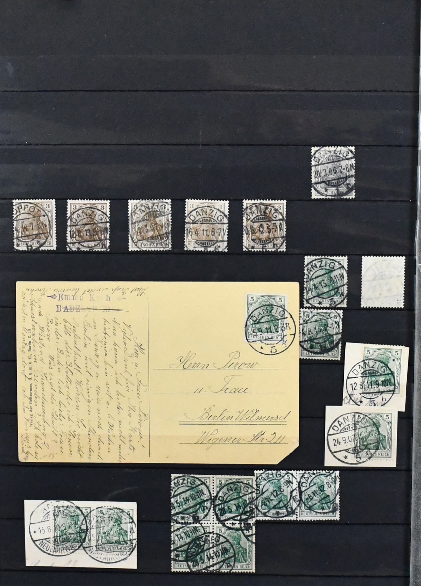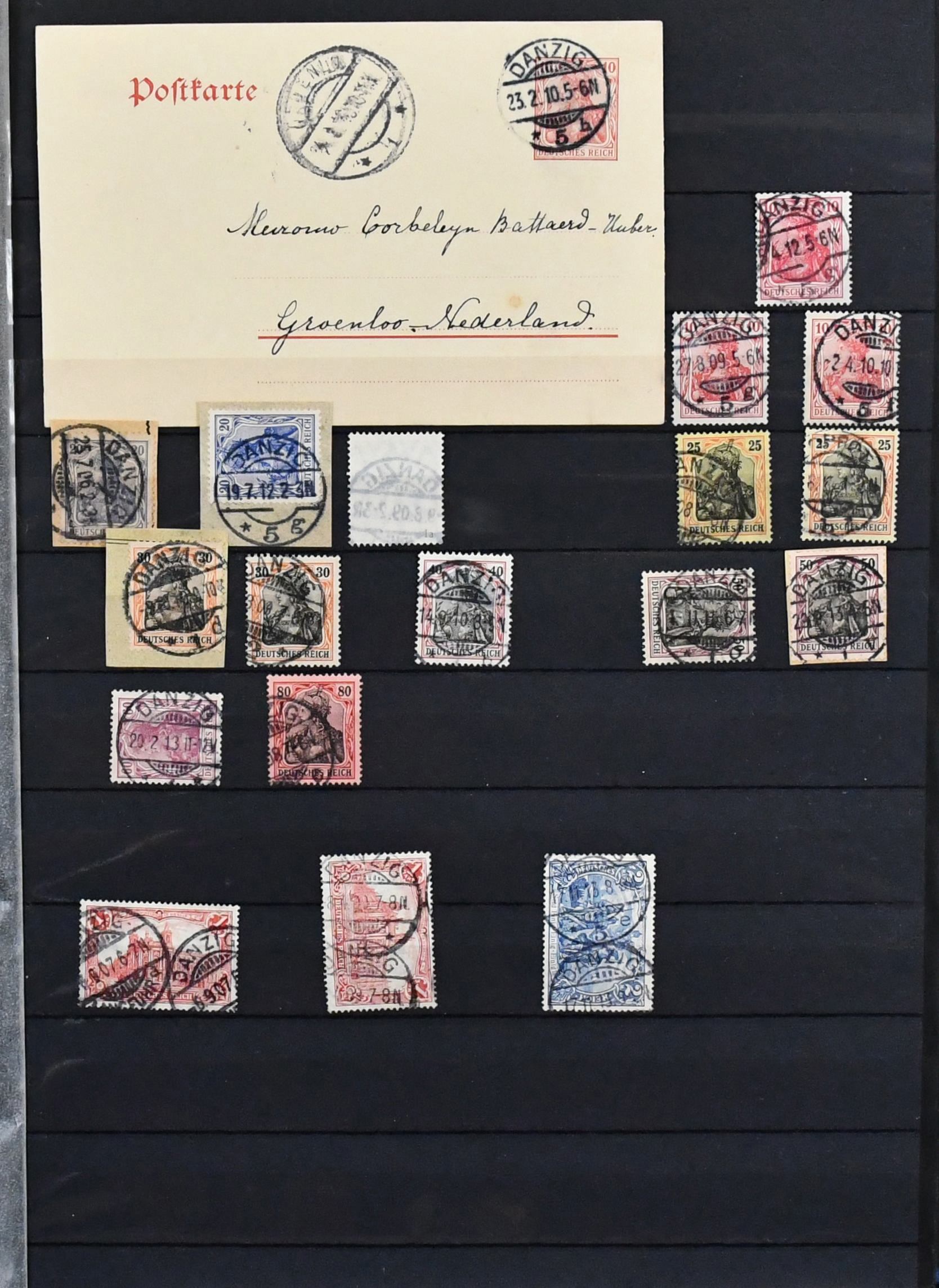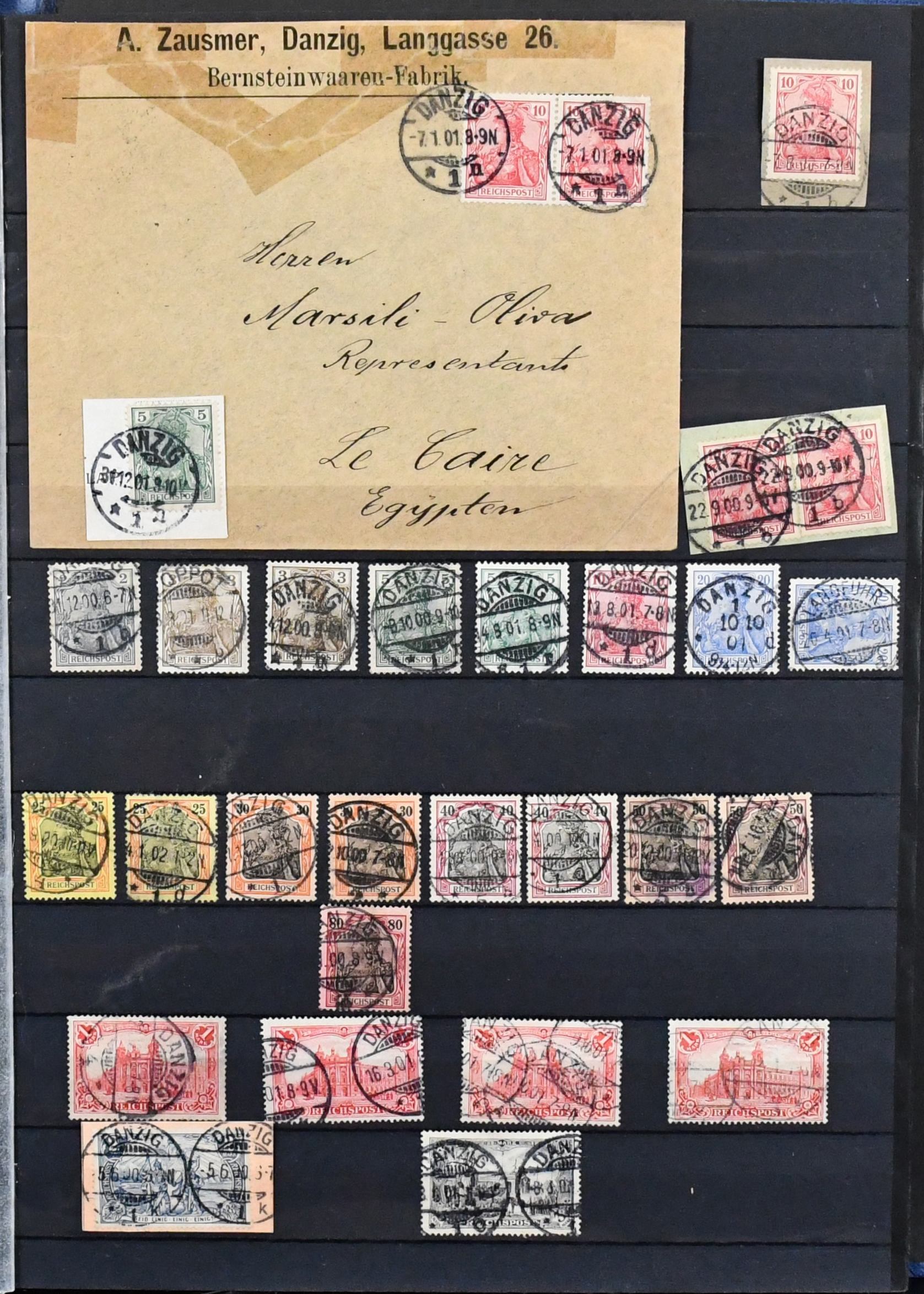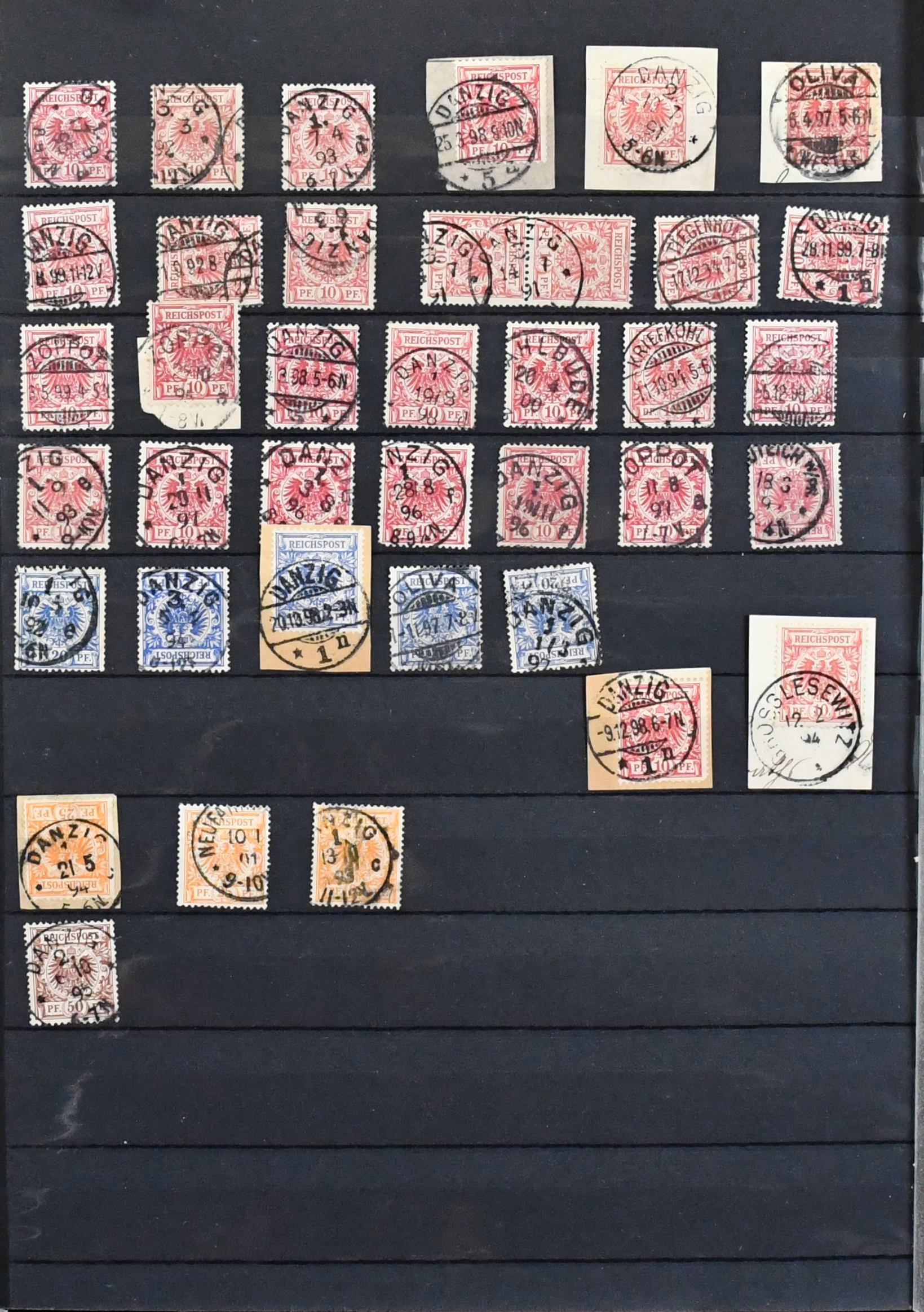 "Danzig"-Entwertungen auf NDP, Brustschilde und Deutsches Reich, Sammlung von versch. Danziger Stempeln, NDP mit 67 Werten (auf Nr. 24/25 natürlich nur handschriftlich), Brustschilde mit über 60 Werten ab Nr. 1, Nr. 12 (tadellos, Befund Sommer) und 13 natürlich nur handschriftlich entwertet, dabei auch gute Hufeisenstempel und bessere Werte, sowie über 400 Werte Deutsches Reich ab 1875 bis 1920 mit Stempeln aus Danzig, alle aufgeführten Bereiche mit vielen Briefstücken (Pfennige auch mit besseren Hufeisenstempeln), dabei auch seltene Vorläufer wie V106 (6, Mi. 600,-), V107-109 teils mehrf. (Mi. 200,-), V111/112 (530,-), guter Teil Bahnpoststempel etc. Günstiger Ausruf
