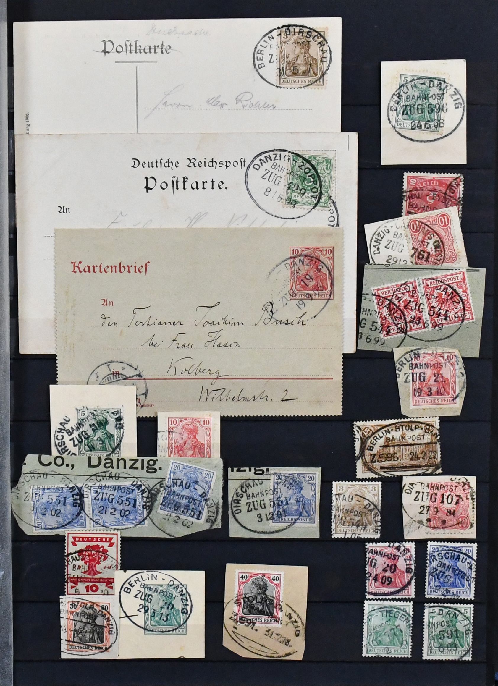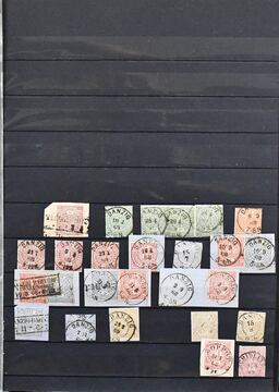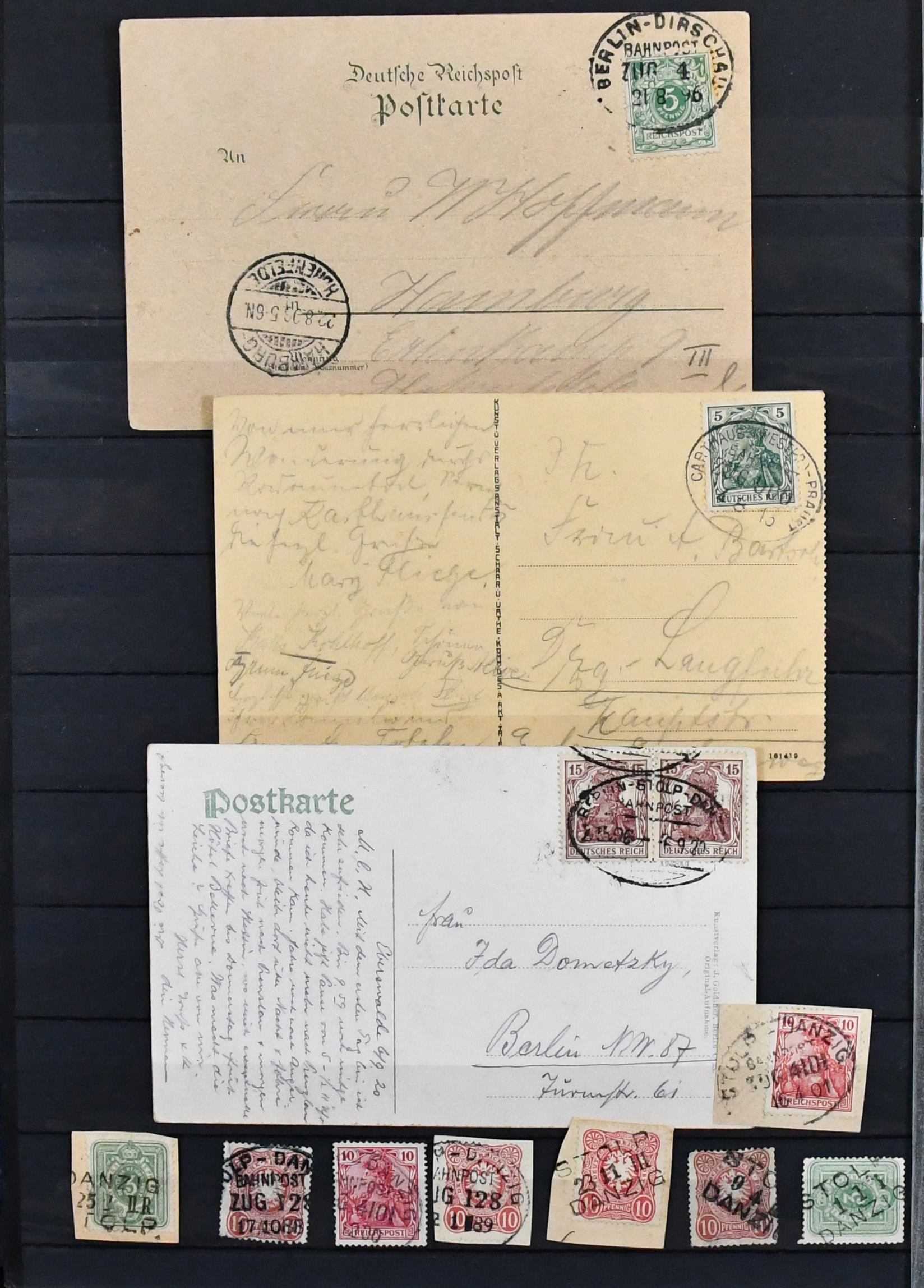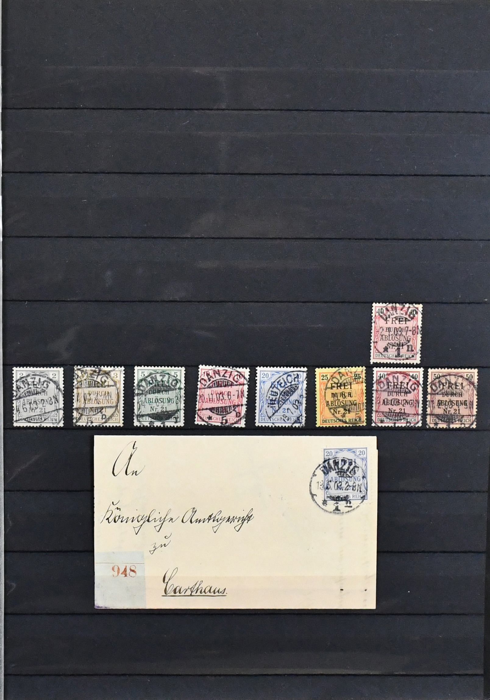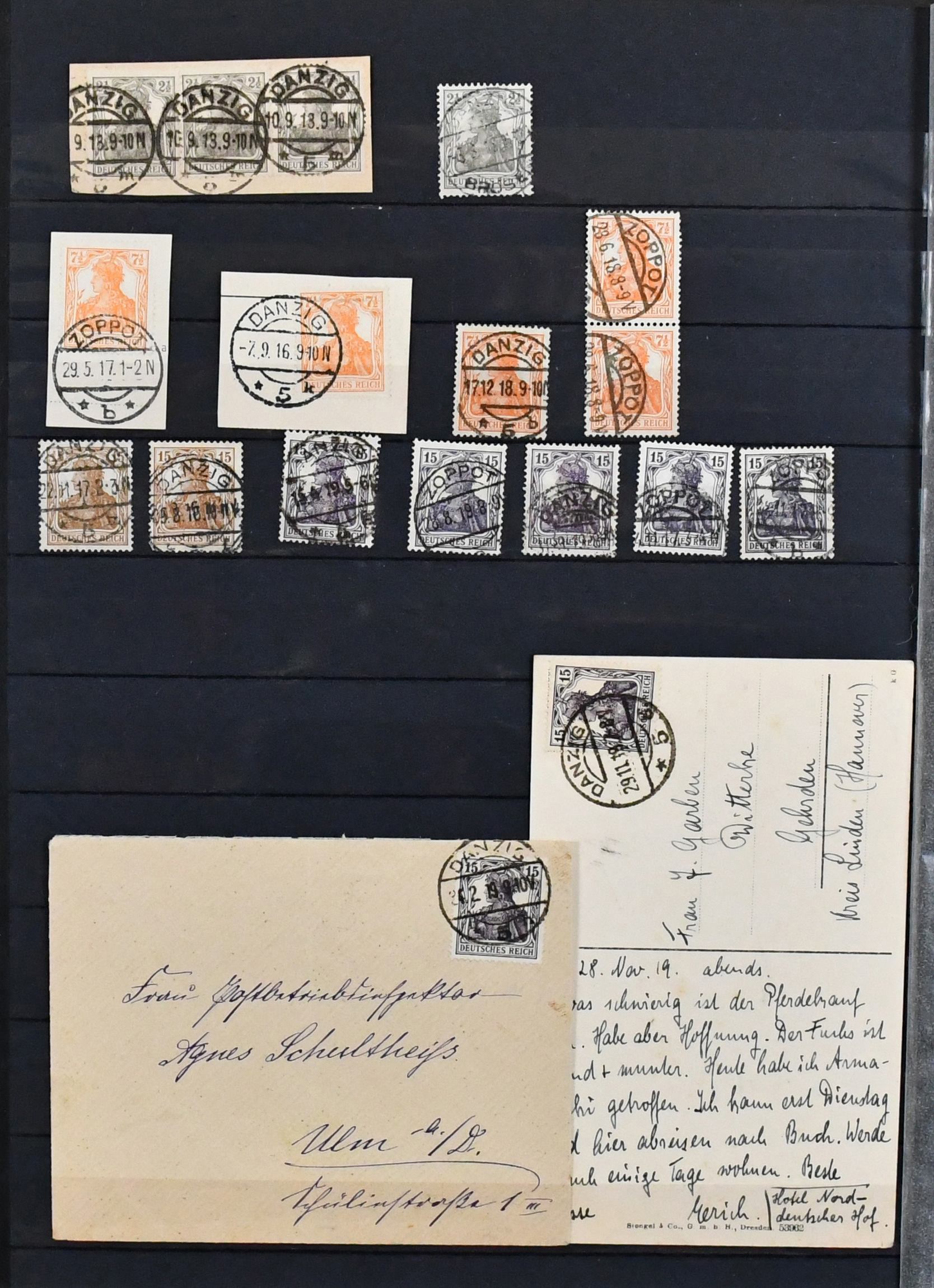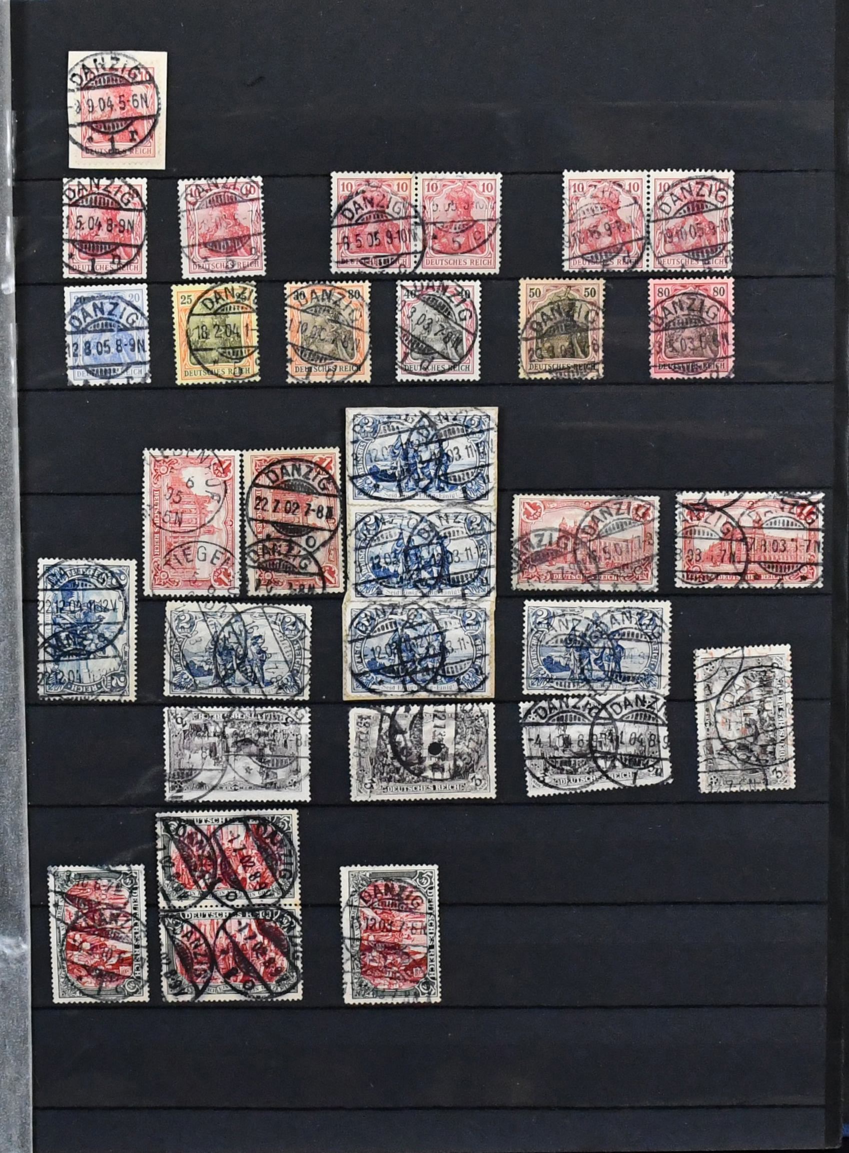 "Danzig"-Entwertungen auf NDP, Brustschilde und Deutsches Reich, Sammlung von versch. Danziger Stempeln, NDP mit 67 Werten (auf Nr. 24/25 natürlich nur handschriftlich), Brustschilde mit über 60 Werten ab Nr. 1, Nr. 12 (tadellos, Befund Sommer) und 13 natürlich nur handschriftlich entwertet, dabei auch gute Hufeisenstempel und bessere Werte, sowie über 400 Werte Deutsches Reich ab 1875 bis 1920 mit Stempeln aus Danzig, alle aufgeführten Bereiche mit vielen Briefstücken (Pfennige auch mit besseren Hufeisenstempeln), dabei auch seltene Vorläufer wie V106 (6, Mi. 600,-), V107-109 teils mehrf. (Mi. 200,-), V111/112 (530,-), guter Teil Bahnpoststempel etc. Günstiger Ausruf