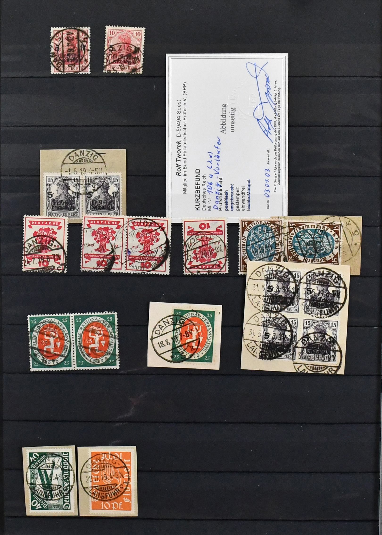 Danzig, Zusammenstellung besserer Ausgaben, Schwerpunkt Infla, dabei Nr. 33 ungebr. (Mi. 170,-), 87/89 in postfr. Viererblöcken, 190/92 ungebr., sonst fast alles gestempelt, z.B. zweimal Nr. 43 ohne Unterdruck auf Briefstück (Mgl.), nach 1924 mit u.a. Nr. 207, 208 gest., Bl. 1/2 mehrf., Bl. 3 postfr. usw.