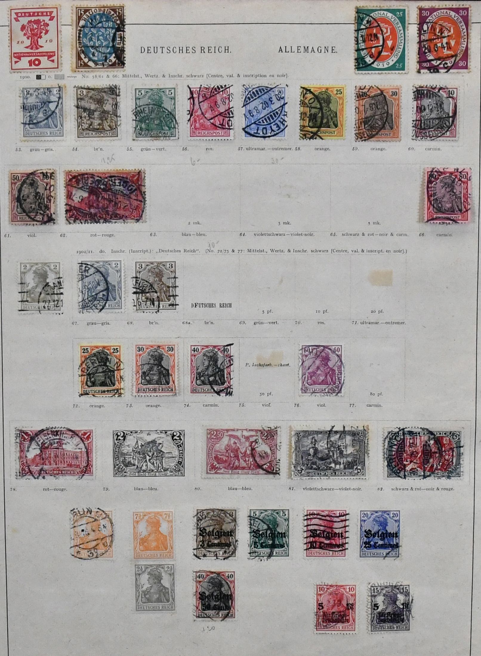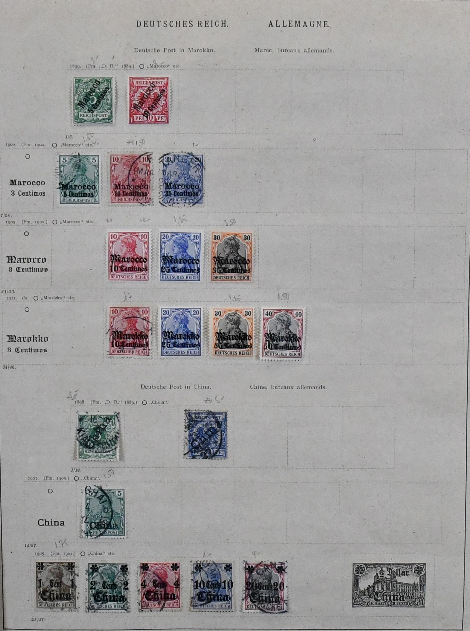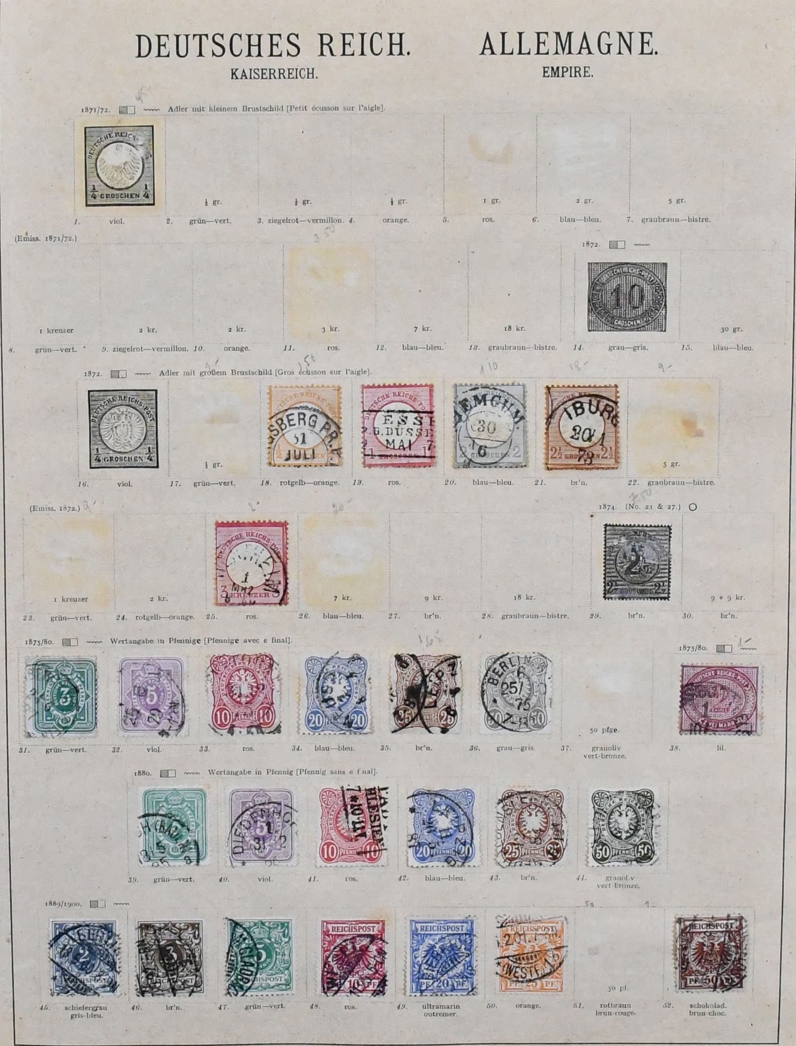 Deutsches Reich, 1872-1919, meist gest. Slg. auf alten Schaubek-Vordrucken, dabei u.a. Nr. 20 mit nachverw. hannöverschem Zweikreisstempel "Iemgum", sehr gut gezähnte Nr. 21, 31-36 usw., ferner etwas Auslandspostämter mit Marokko, China und Türkei