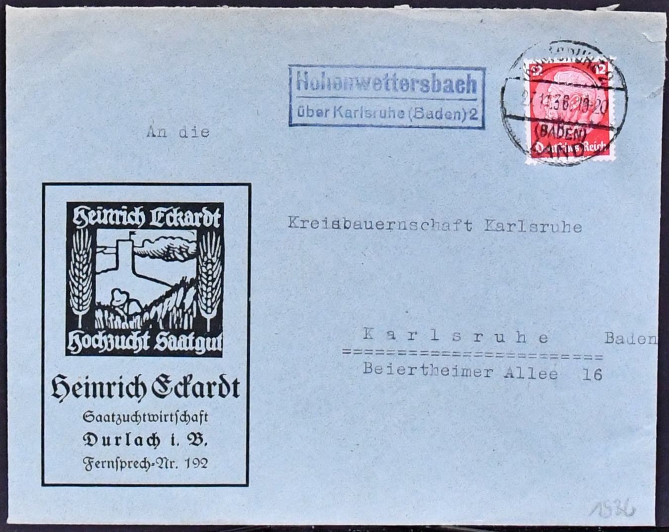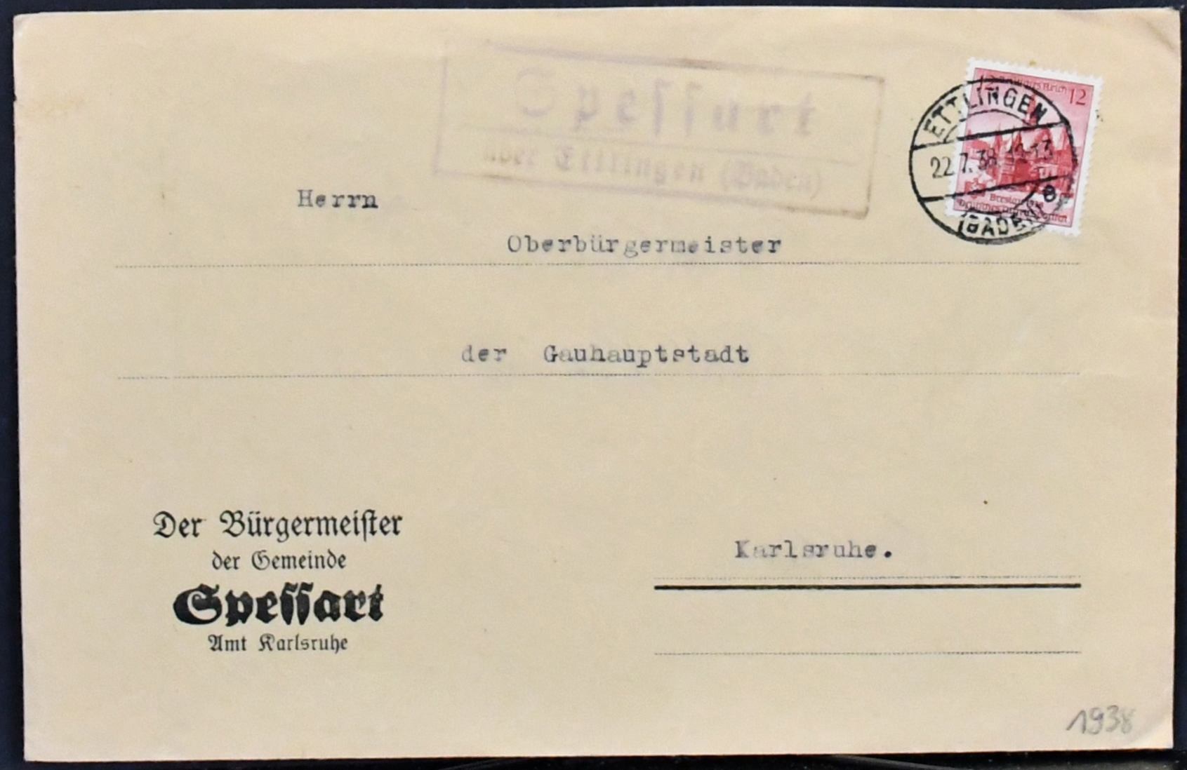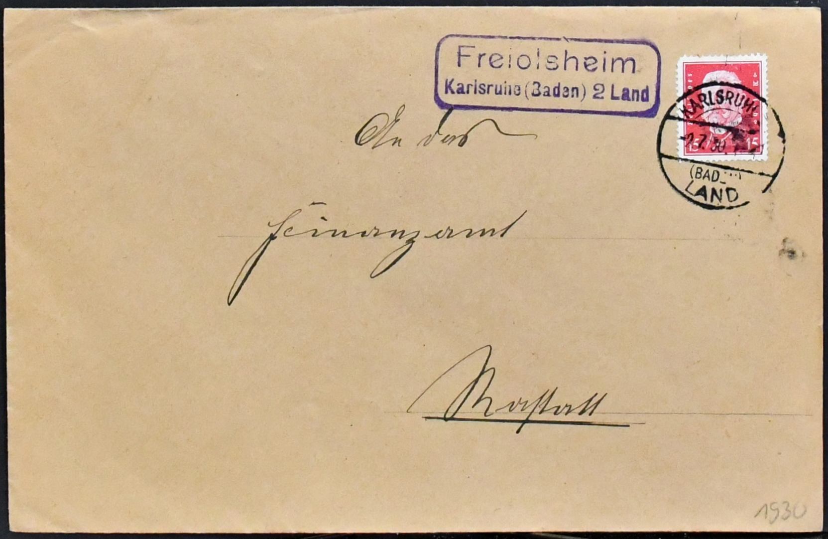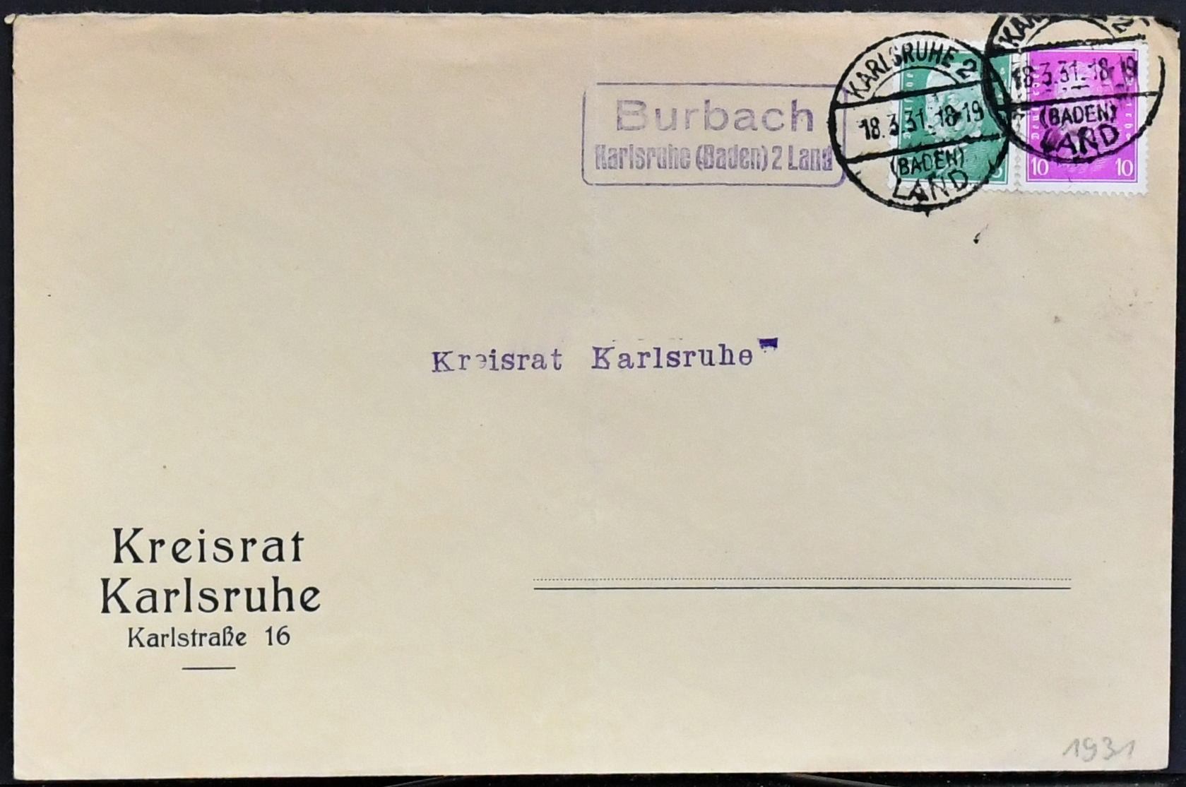Deutschland, ca. 1931-1965, Landpoststempel, interessante Partie von 43 Belegen mit violetten Landpoststempeln, fast nur aus der Region Karlsruhe, u.a. mit "Auerbach", "Thomashof", "Wolfartsweier", "Palmbach", "Frauenalb", "Burbach", "Hohenwettersbach", "Pfaffenrot" usw., meist auf Briefen der 30er Jahre, zusätzlich zwei Briefstücke und eine Vorderseite