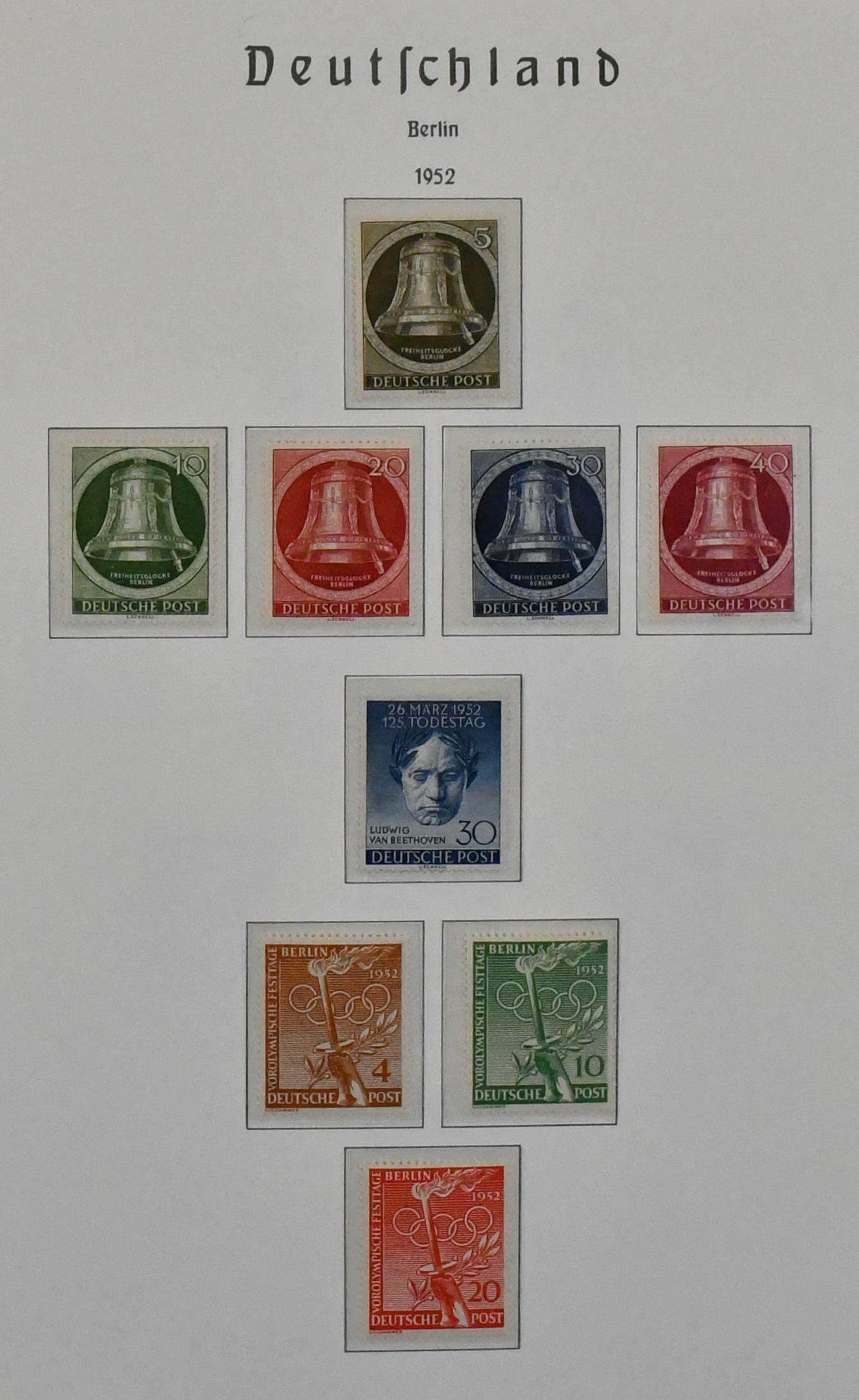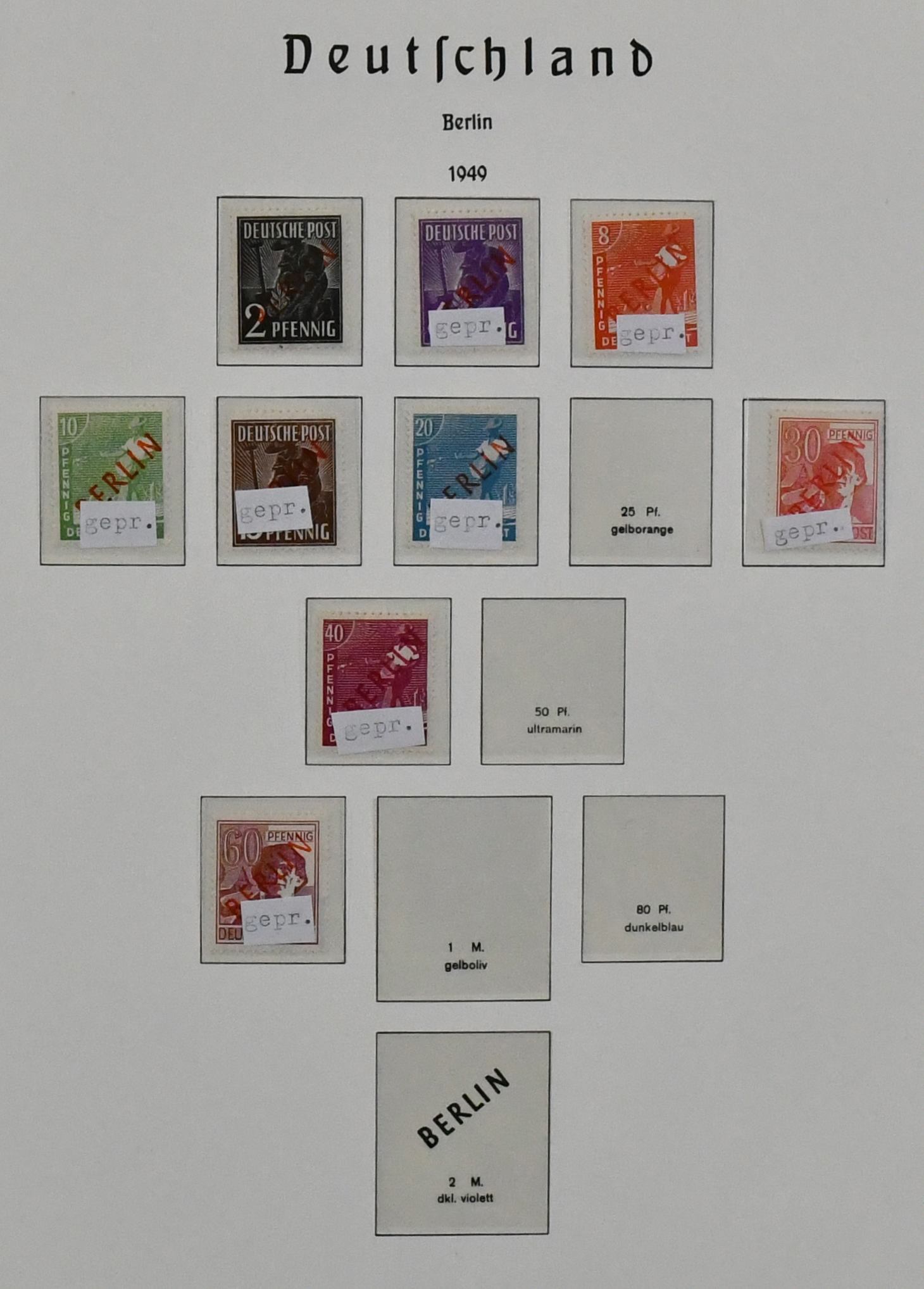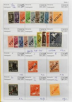 Berlin, 1948/1990, rundgestempelte, lediglich ohne Nr. 20, komplette Sammlung im Leuchtturm-Vordruckalbum. Dabei Schwarzaufdruck, bei dem die Mark-Werte falsch sein dürften, guter Rotaufdruck-Satz, Nr. 35/41, 61/63, Währungsgesch.-Satz und -Block (Stempel ungeprüft), alle Glocken, Nr. 71/74, 106/9 usw. Der Ausruf erfolgt unter Berücksichtigung sämtlicher Eventualitäten