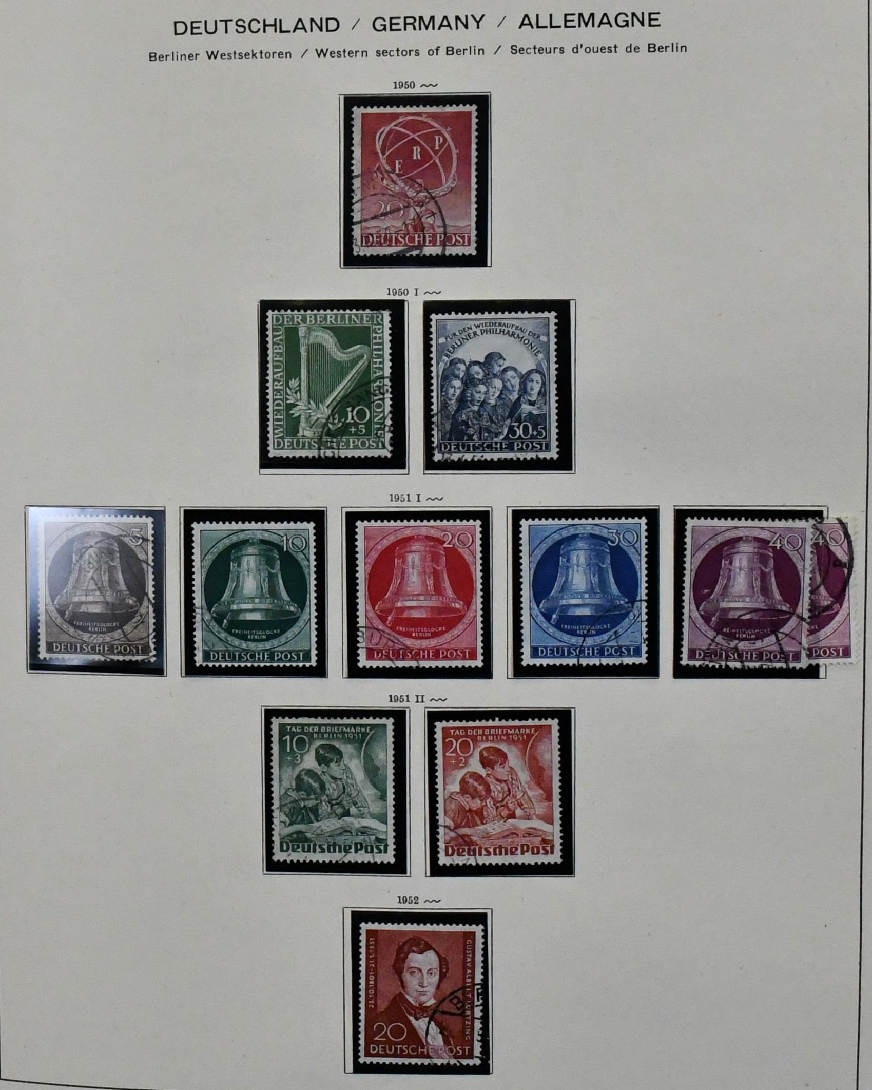 Berlin, 1948/1990, gestempelte, saubere, lediglich ohne Block 1, komplette Sammlung im Leuchtturm-Vordruckalbum. Dabei Schwarzaufdruck-Satz (Stempel bei den Mark-Werten zweifelhaft und daher unberechnet), sauberer Rotaufdruck-Satz, Nr. 35/41, 61/63, 68/70, alle Glocken usw. Mi. 5200,- + unberechnete Werte