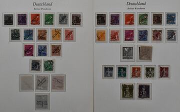 Berlin, 1948-1970, gemischte Slg. im SAFE-Vordruckalbum, die Vordrucke jeweils doppelt und entsprechend auch oft in beiden Erhaltungen gesammelt, ab gest. Nr. 1-15, mit Rotaufdruck bis auf 1 DM gest., 35-41 gest., dito 61-63, Glocken etc. Mi. nur bis 1953 2700,-, danach, bis auf eine handvoll Werte, in beiden Erhaltungen je kpl.