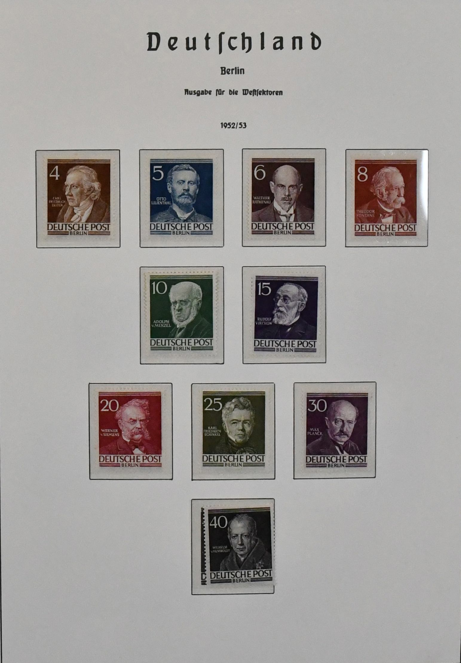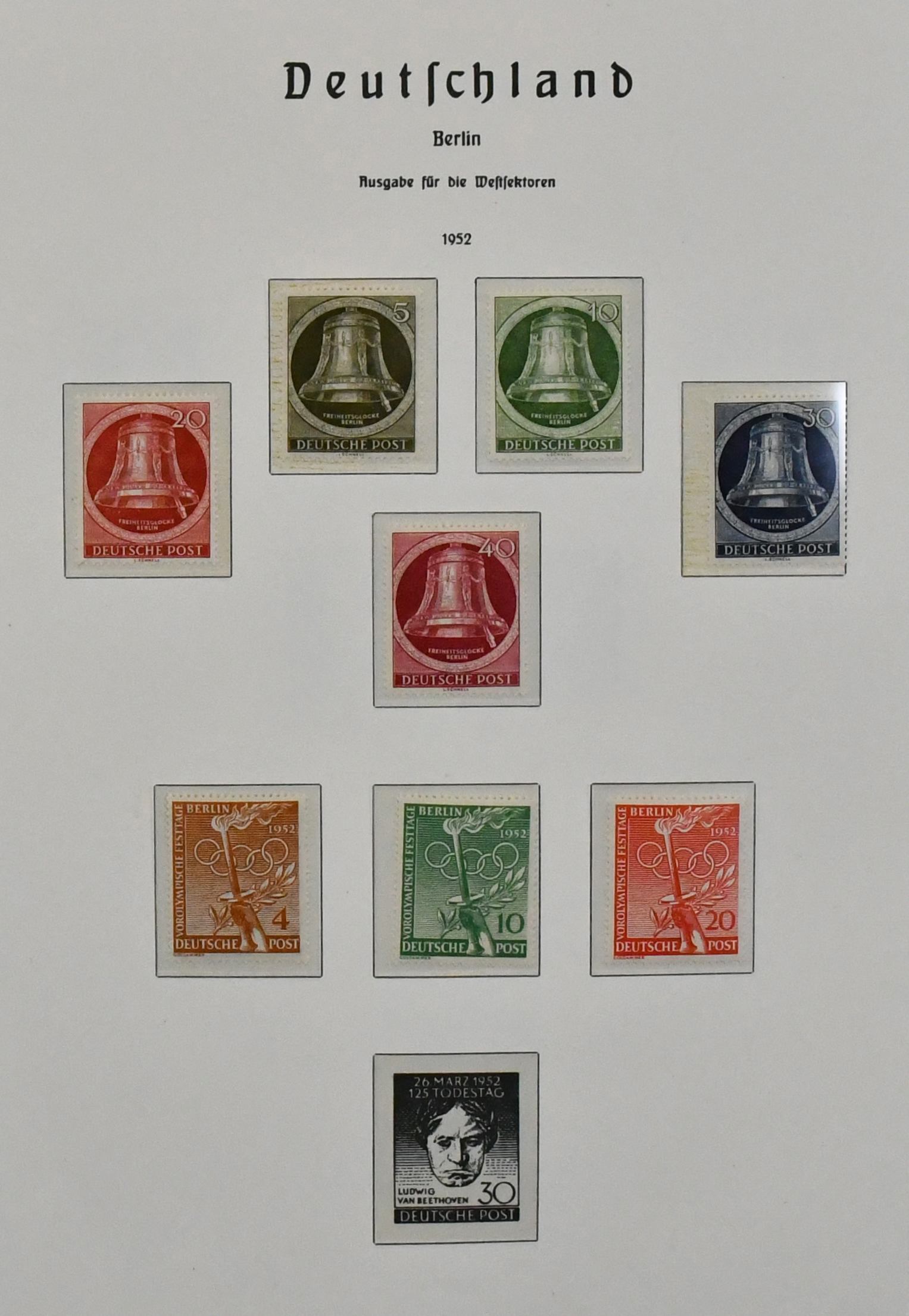 Berlin, 1948-1990, weitgehend kpl. Slg. im Leuchtturm-Vordruckalbum, anfangs gemischt mit besseren wie div. SA/RA, Nr. 41 gest., 61/63, ab 1952 nahezu kpl., mit Glocken-Serien, Nr. 91/100 etc., ab ca. 1955 postfrisch, dazu Slg. Zus.-Druck-Kombinationen aus 1962-1989 inkl. SWK. Sehr hoher KW