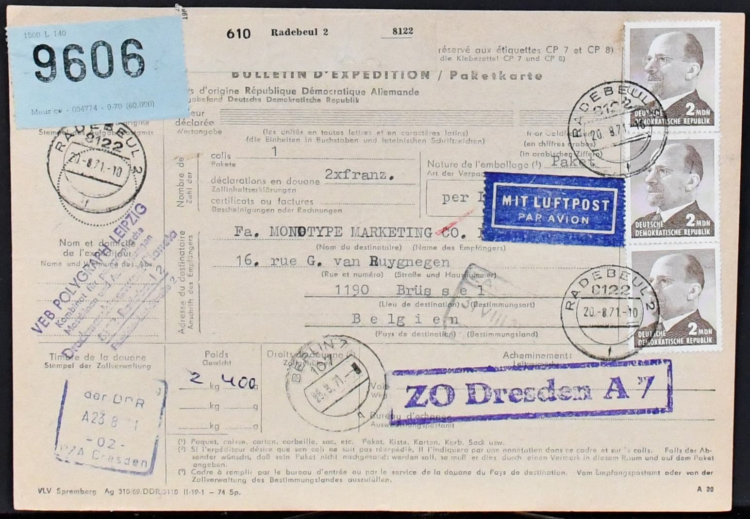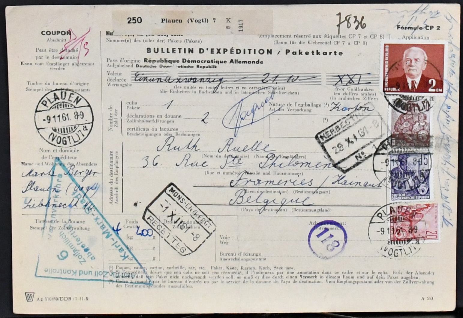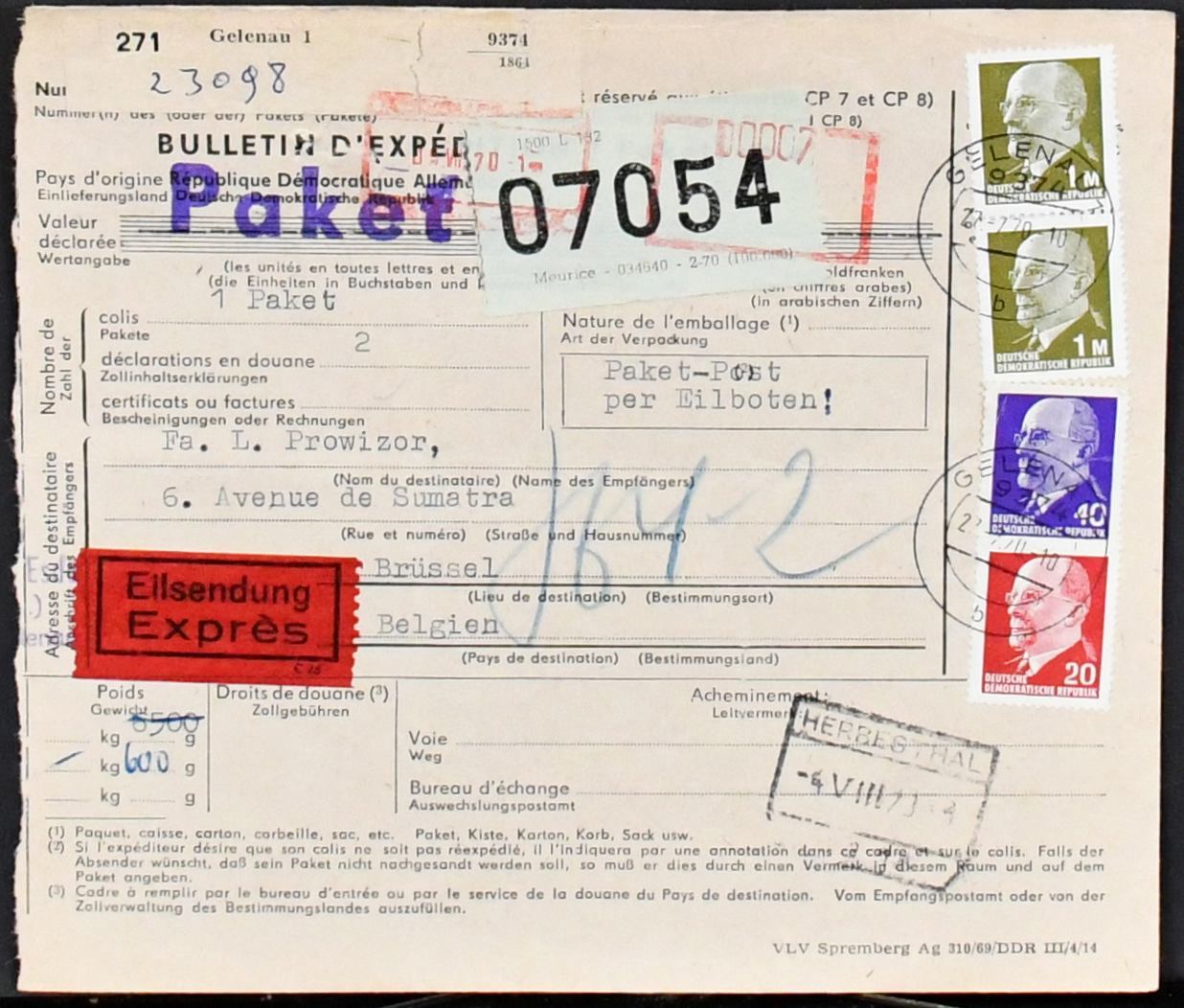 DDR, Partie von 36 Paketkarten der 1960er Jahre u. 70er Jahre, meist mit naturgemäß hohen Ulbricht-Frankaturen für Pakete nach Belgien, dabei Express- und Luftpostpakete
