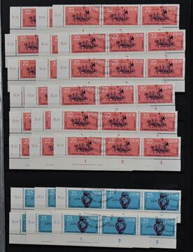 DDR, 1964/65, Druckvermerke, gest. Zusammenstellung mehrerer hundert Bogenecken-Paare und -Dreierstreifen, alle mit vollständigen Druckvermerken. Dabei bessere wie z.B. Nr. 1021 per 13, 18mal Achter-Zusammendruckblock Nr. 1039/44 mit Ordnungs-Nr. "4" (Mi. 1800,-) usw. Mi. 7700,-