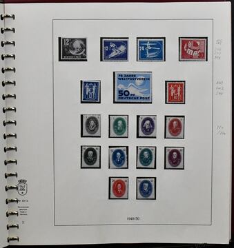 DDR, 1949-1990, weitgehend kpl. Slg., postfrisch (evtl. eine handvoll Werte ungebraucht), in fünf Vordrduckalben, anfangs mit allen besseren Werten und Blöcken, z.B. Bl. 7, 8/9A/B etc., zum Ende hin einige Lücken. Mi. ca. 4500,-