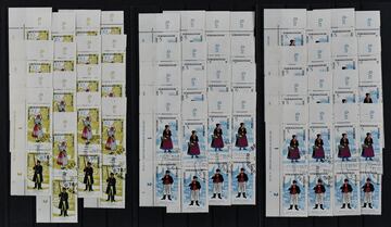 DDR, Nr. 1074/79, Volkstrachten 1964, senkrechter Zusammendruck aus der Bogenecke gestempelt 32mal kpl., alle mit vollständigen Druckvermerken. Dabei je 16mal Ordnungs-Nr. "1" und "2". Mi., billigste Entwertung, 4160,-, seltenes Angebot!