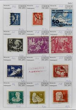 DDR, 1949/1957, gestempelte Slg. nur der ersten Jahre ab Nr. 242/47, mit Debria-Block, Bl. 10/12, Nr. 261/70, 286/88, 327/41 inkl. 80 Pfg. auf Lackpapier etc. Mi. 2200,-