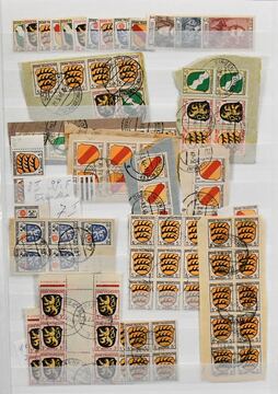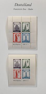 Französische Zone, meist postfr. Partie mit u.a. Baden dreimal Nr. 37, zweimal Nr. 38/41A, Nr. 46 und 50/52, Rheinland-Pfalz zweimal Bl. 1, Nr. 42/45A, Württemberg Nr. 26/27 in Viererblöcken, alle genannten postfrisch, besserer Zwangszuschlagsausgaben etc. Mi. 2500,-