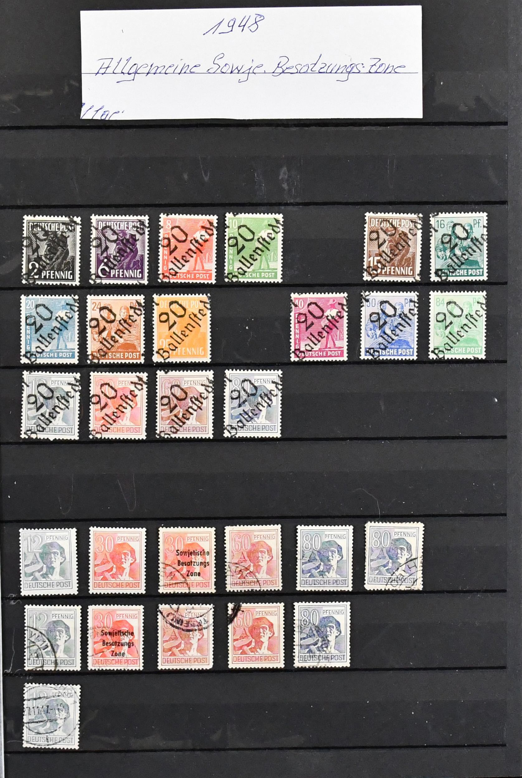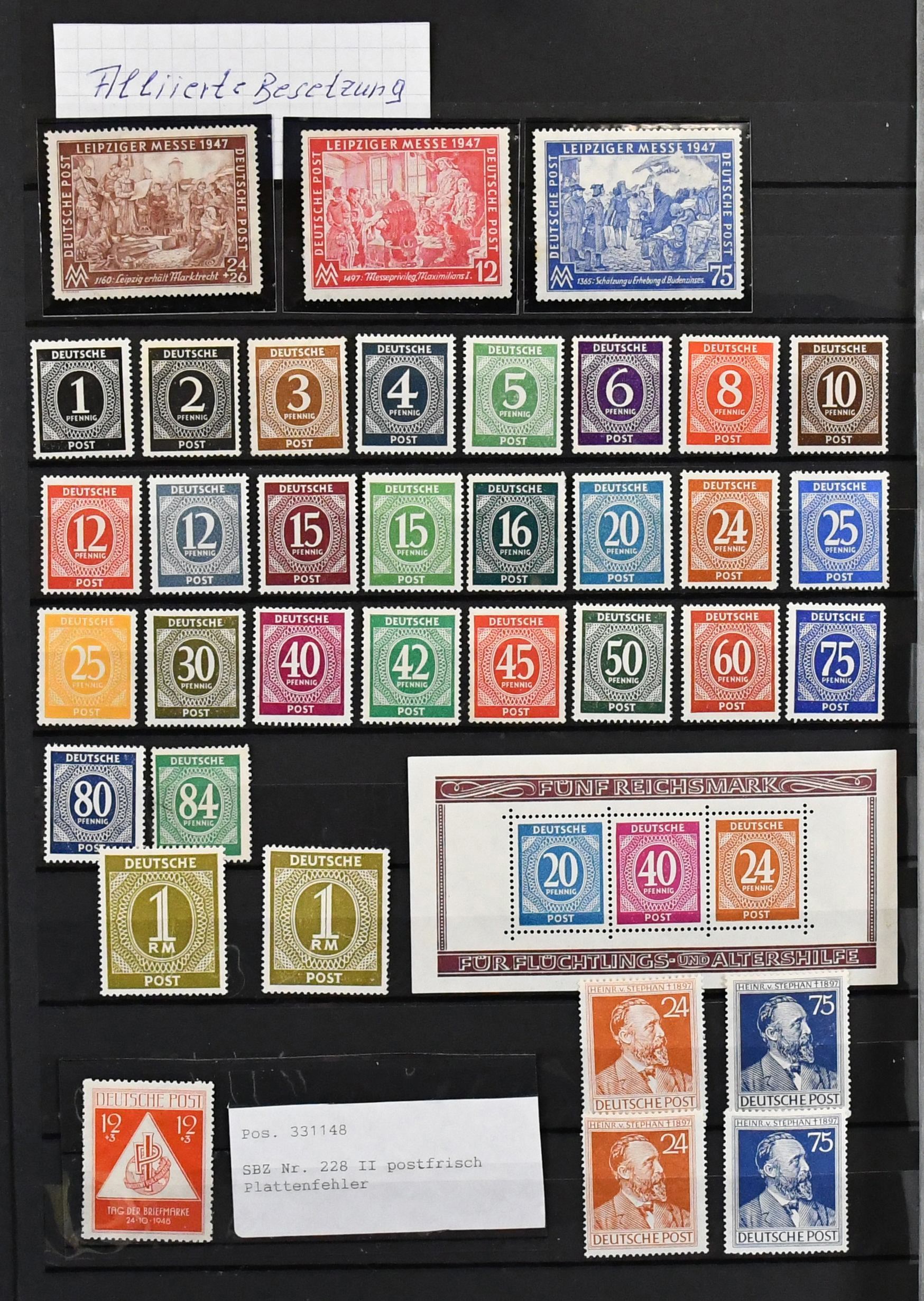 SBZ/DDR, 1948/1964, Slg. mit Allg. Ausgabe (ohne Bl. 6) kpl., meist postfr., inkl. Bezirkshandstempel mit "heller 60 Pfg.", Nr. 182/97 inkl. Nr. 195 je postfr., sowie DDR ab Nr. 242, mit u.a. Bl. 15 postfr., im Schaubek-Vordruckalbum