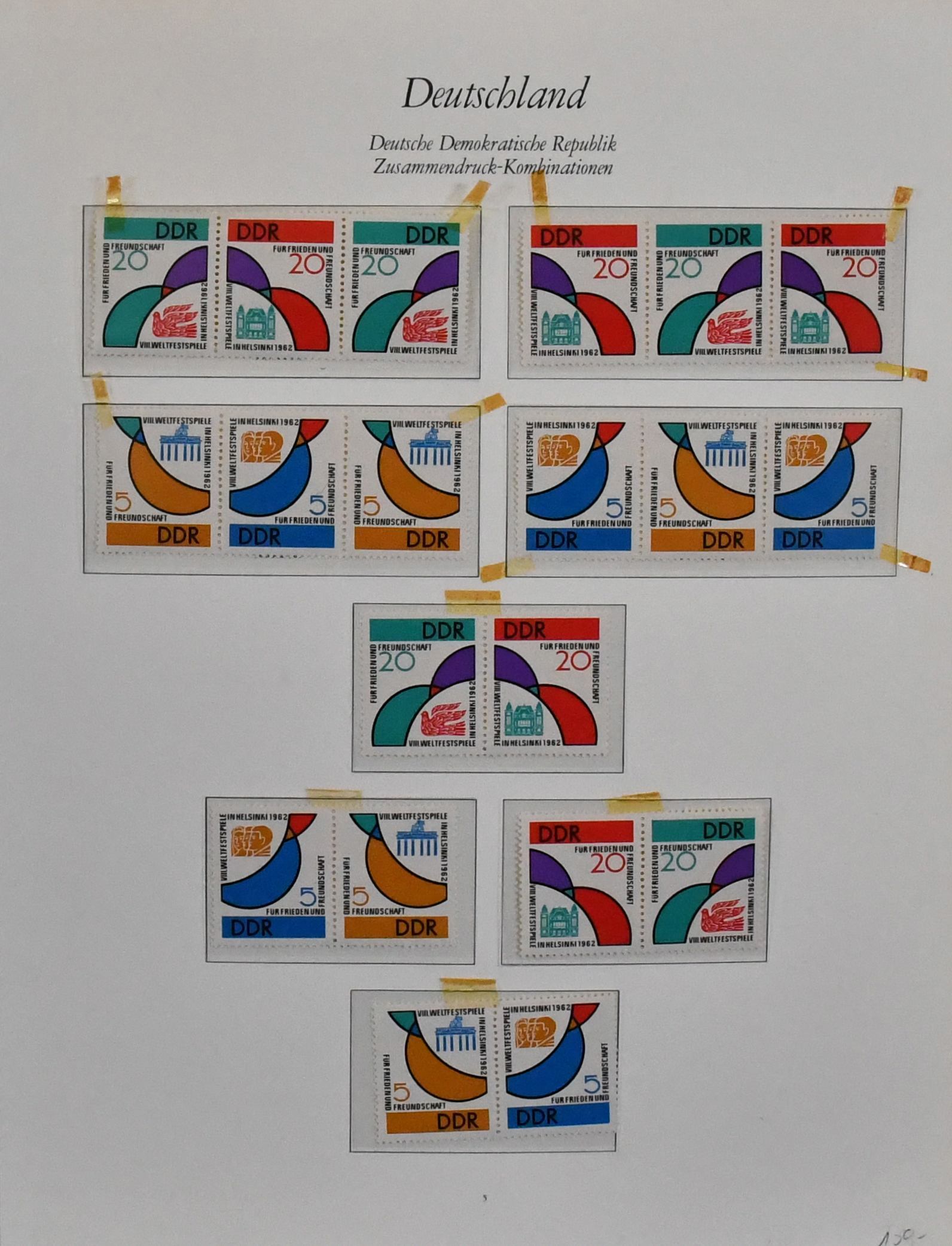 DDR, Zusammendrucke der Sondermarken, umfangreiche, meist postfrische, etwas gestempelte Partie mit vielen besseren in vier Ringbindern. Dabei Herzstücke ex Bl. 8/9A/B postfr., Nr. 901/4 in größeren Einheiten postfr. u. gest., ebenso Nr. 1012/13 postfr., viele Sechserblöcke ex Nr. 1039/44, u.a. einmal mit Druckvermerk gest., alle Zus.-Drucke ex Nr. 1045/47 zweimal postfr., guter Zus.-Dr. W6 mit DV postfr., alle Zus.-Drucke ex Nr. 1074/79 postfr., Zus.-Dr.-Bogen Nr. 2364/67 sechsmal postfr. und einmal gest. (Mi. zusammen 660,-) usw. Mi. gesamt 14500,-