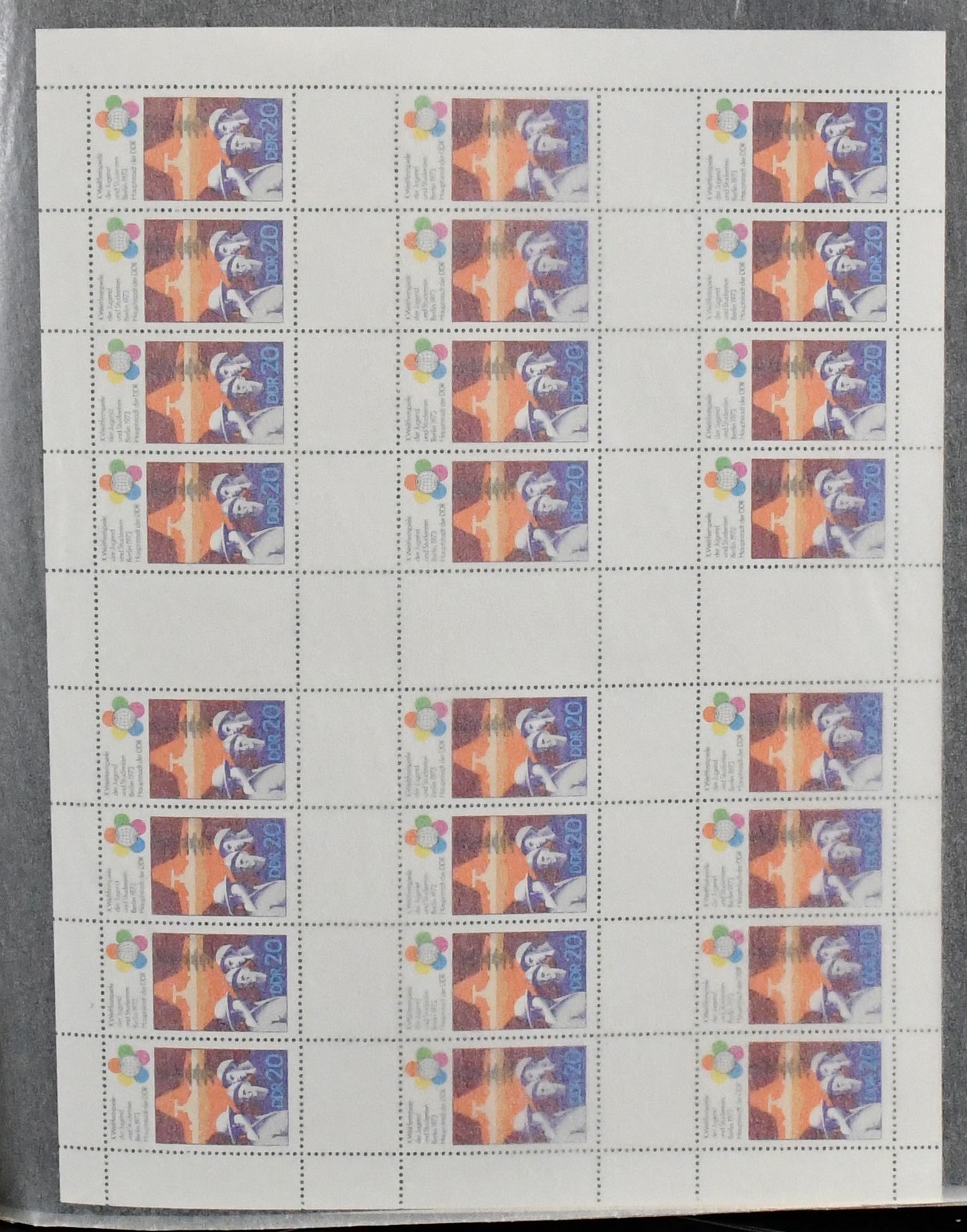 DDR, 1949-1990, weitgehend kpl. Slg., postfrisch (evtl. eine handvoll Werte ungebraucht), in fünf Vordrduckalben, anfangs mit allen besseren Werten und Blöcken, z.B. Bl. 7, 8/9A/B etc., zum Ende hin einige Lücken. Mi. ca. 4500,-